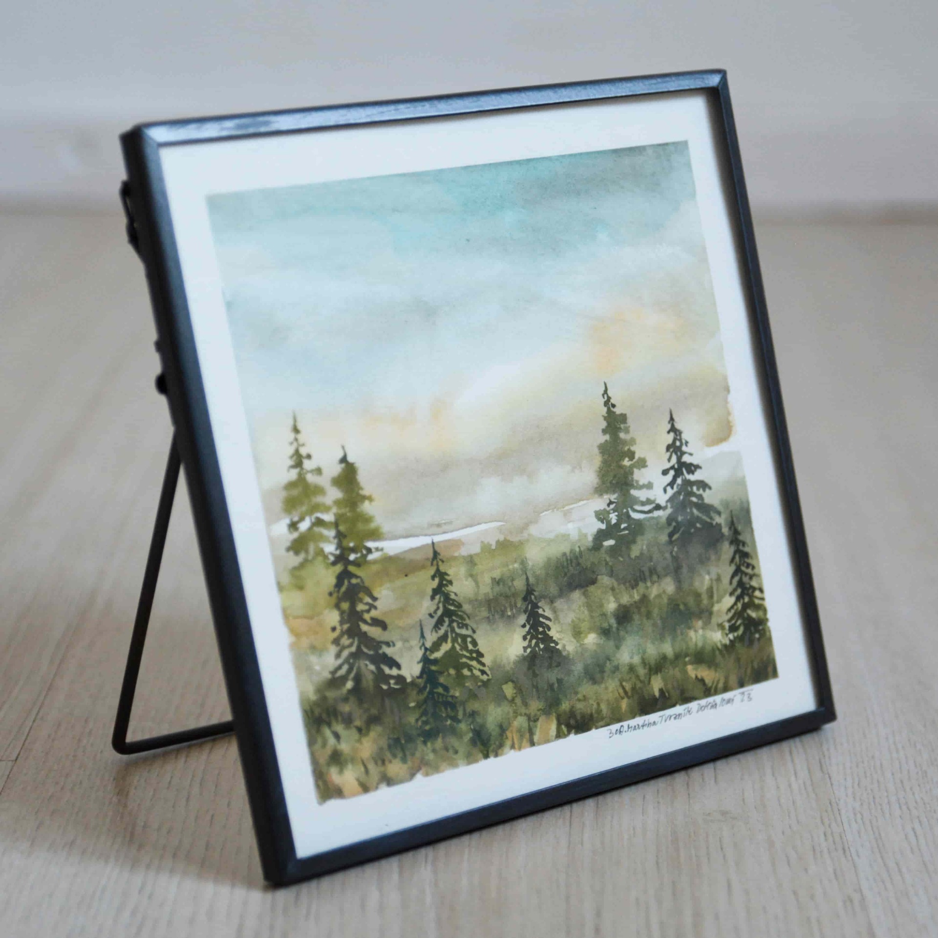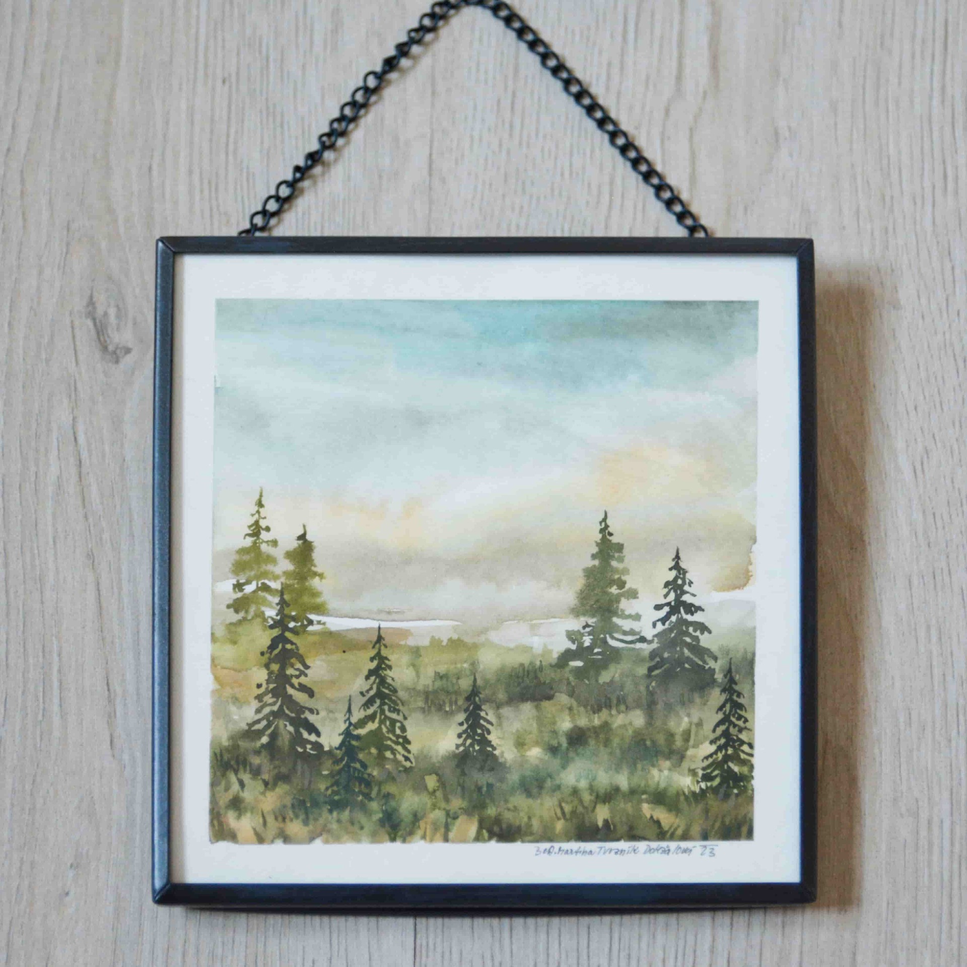 Jemný akvarel božídarského rašeliniště. Řídce rozložené smrky a nad nimi nízká mlha. Dlouhé trávy se pohupují ve větru. Tlumená barevnost. Obrázky jsou krásné také jako nápaditý dárek.