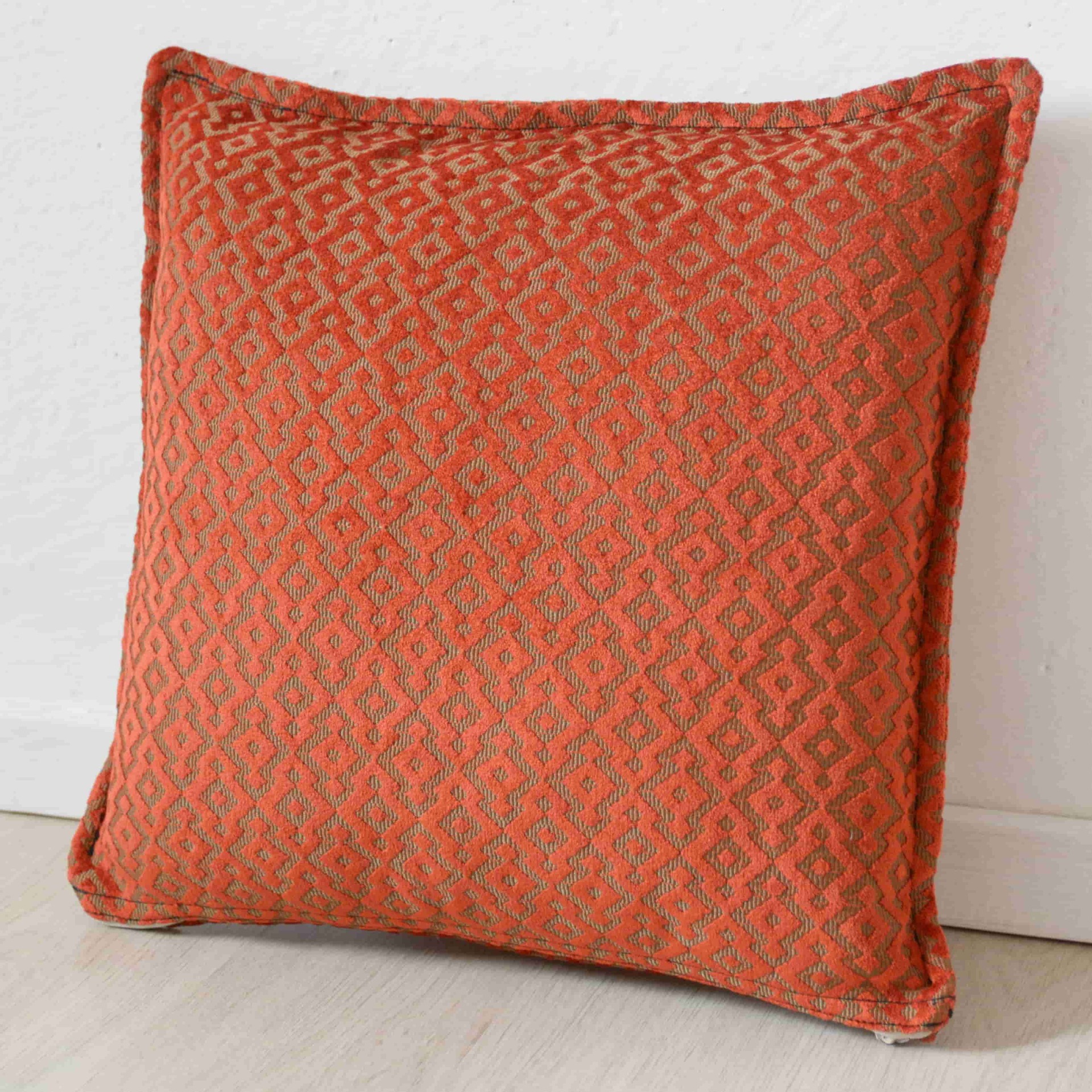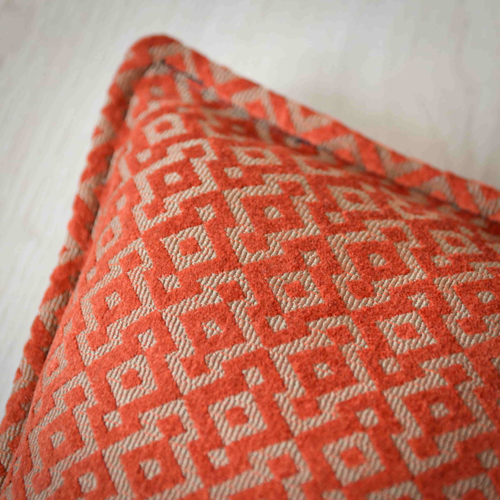 Nevšední potah na čtvercový polštář z tuhé žinylkové látky. Teple oranžový tkaný geometrický vzor je na béžovém podkladu. Ozvláštní a zútulní domov. Doplňte si stylově vaše oblíbené křesílko nebo pohovku. Polštáře vám snadno doladí interiér.