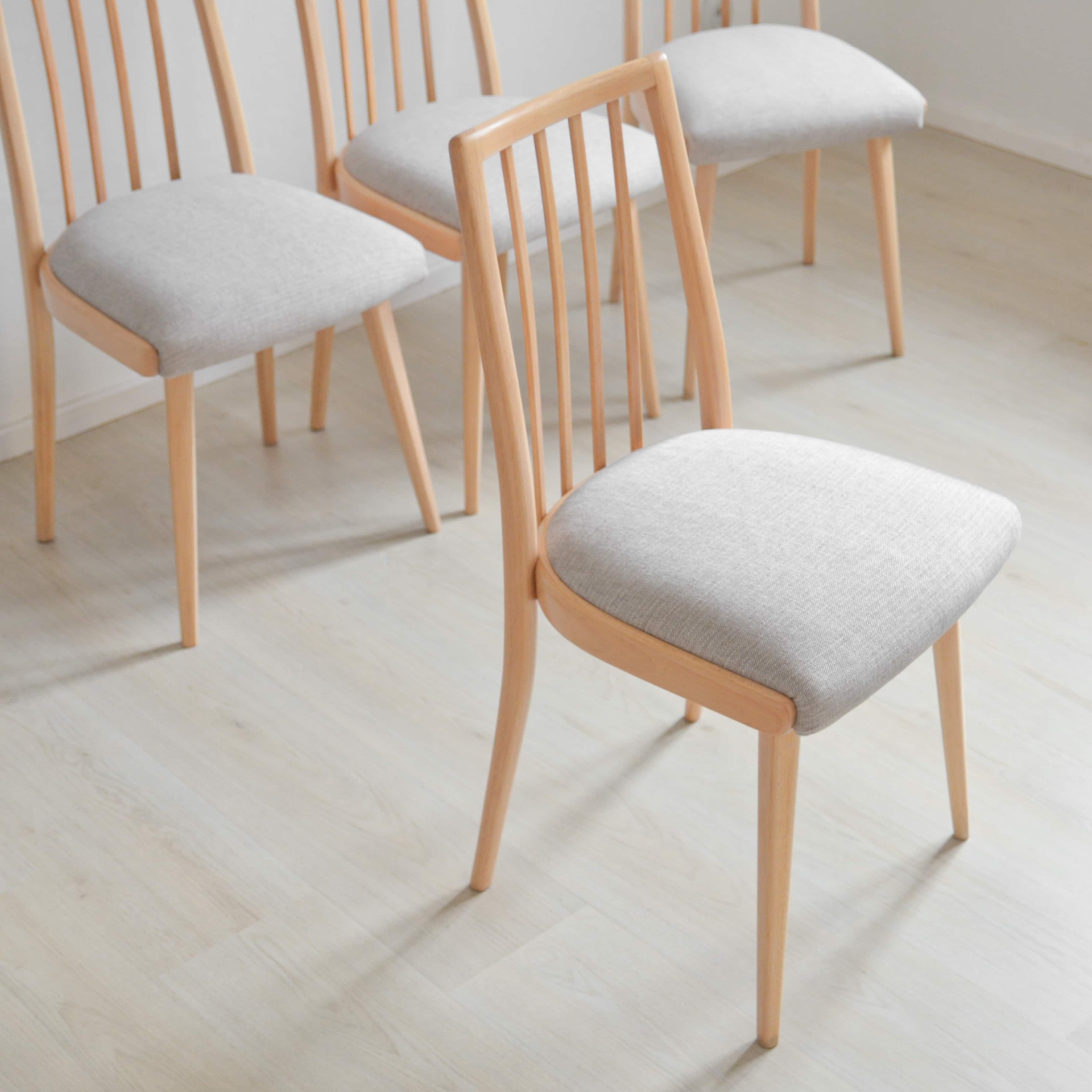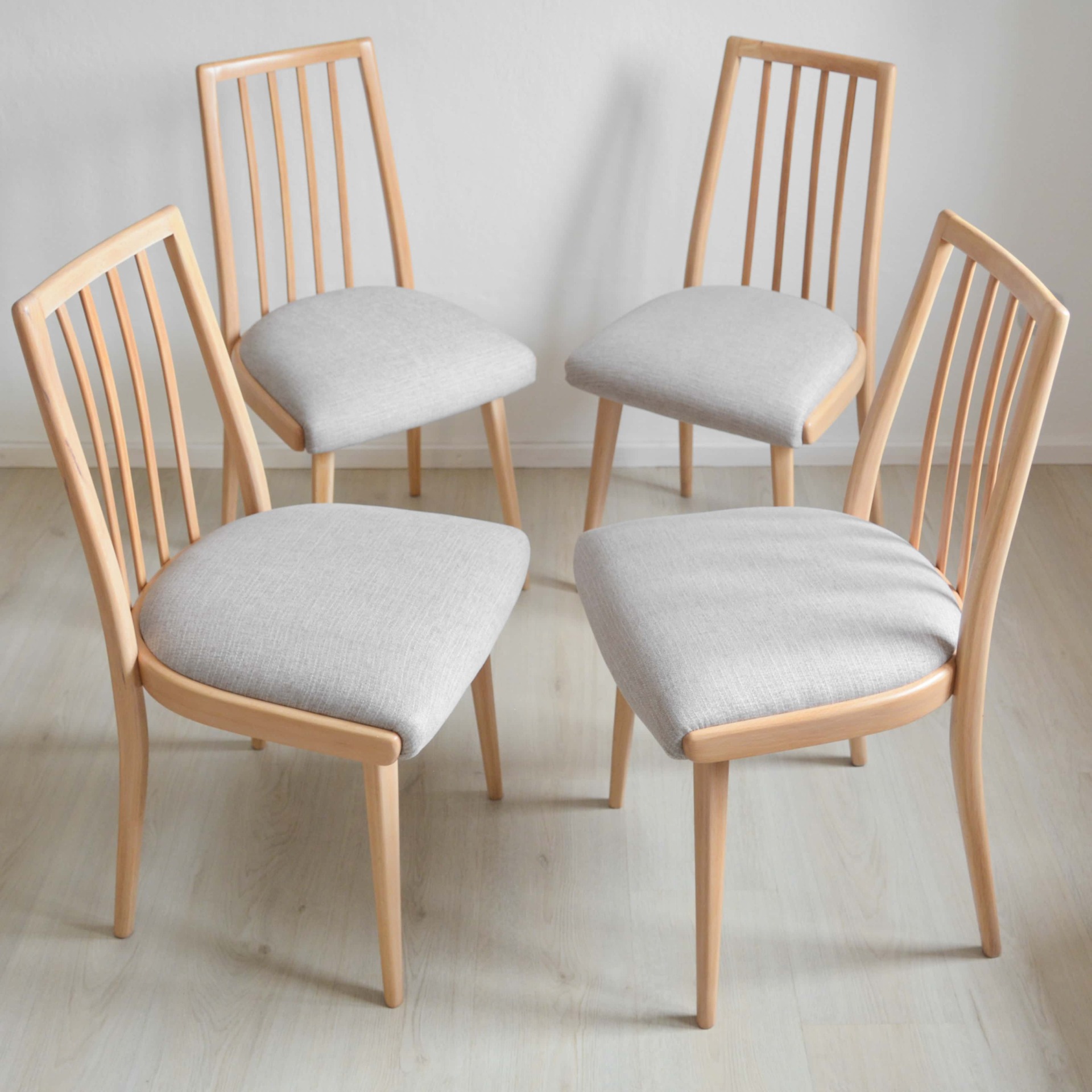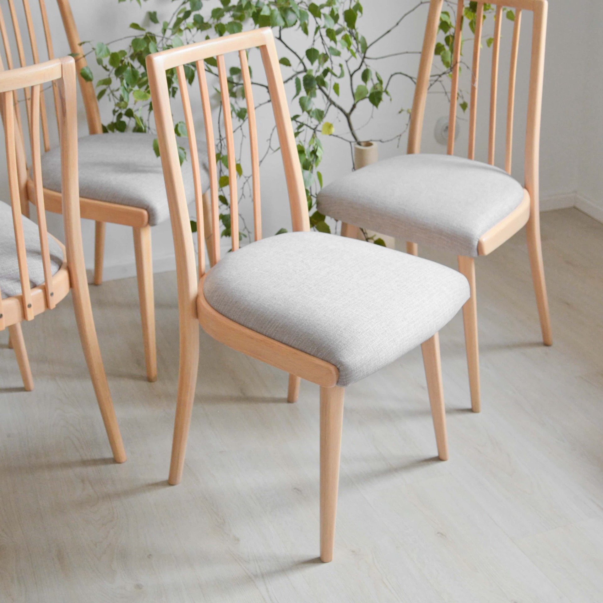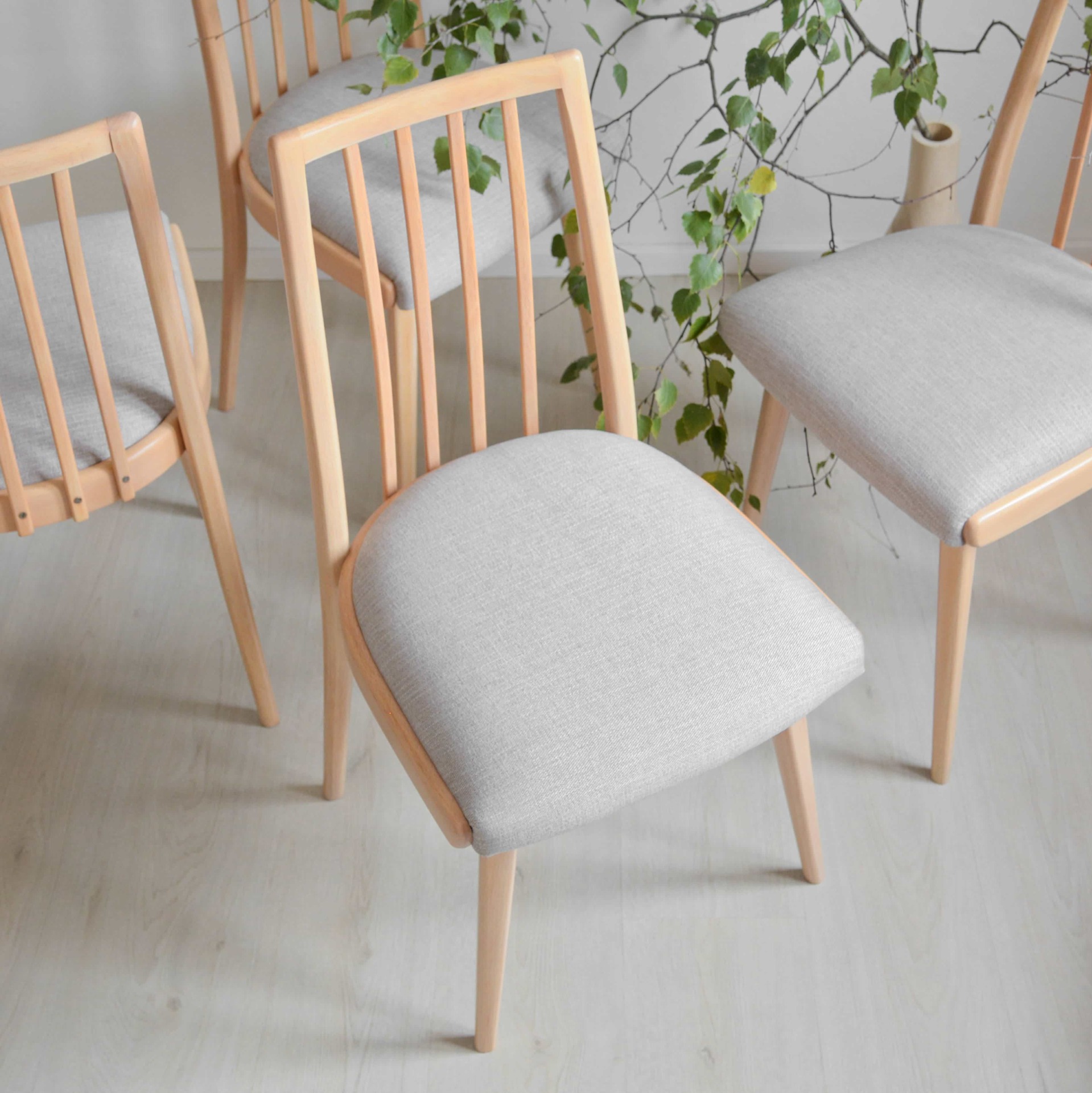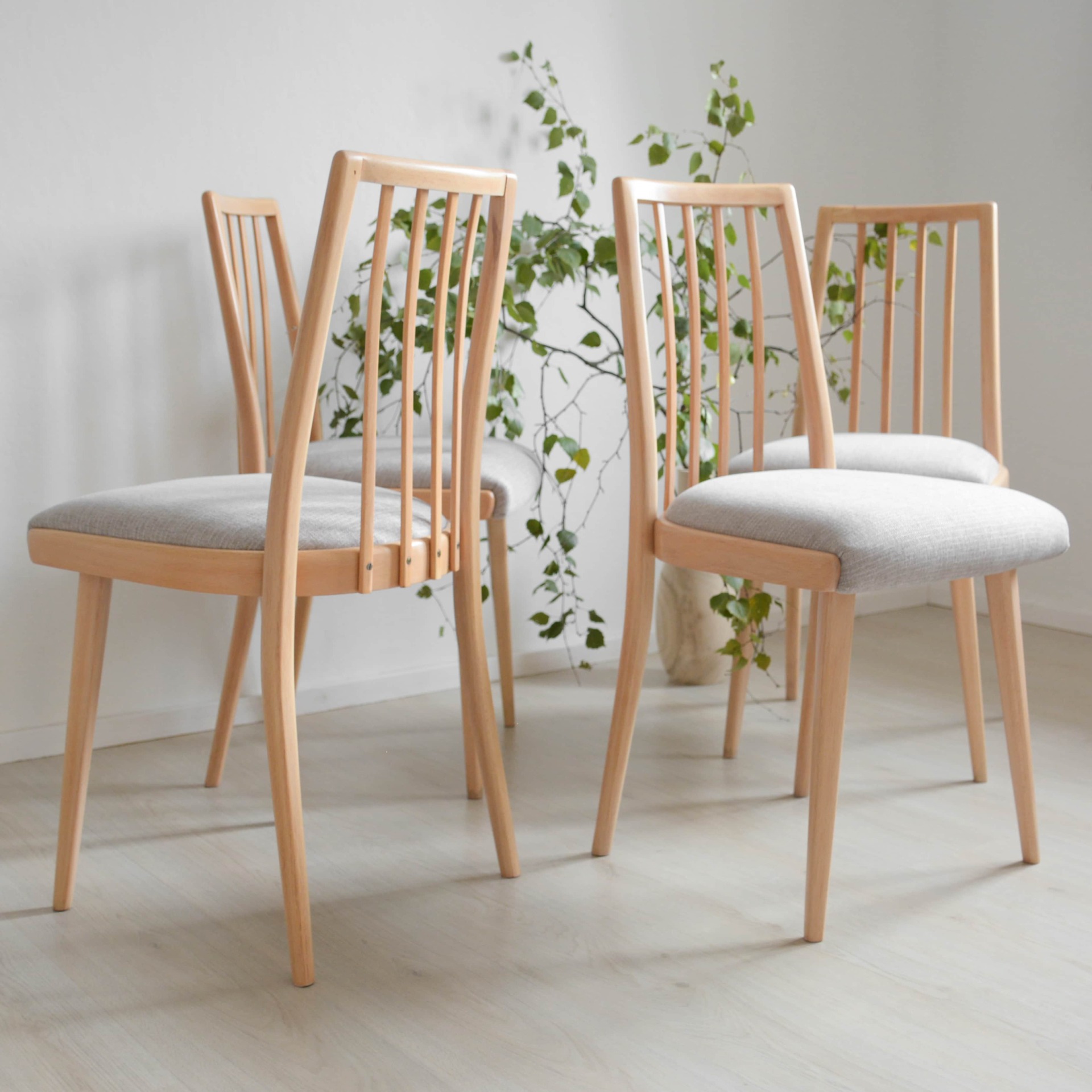 Židle z tvrdého bukového dřeva velmi elegantních tvarů. Po kompletní renovaci jsou pevné a bytelné, 60. léta. Vyznačují se jemně tvarovanou konstrukcí. U jídelního či pracovního stolu budou dokonalé.