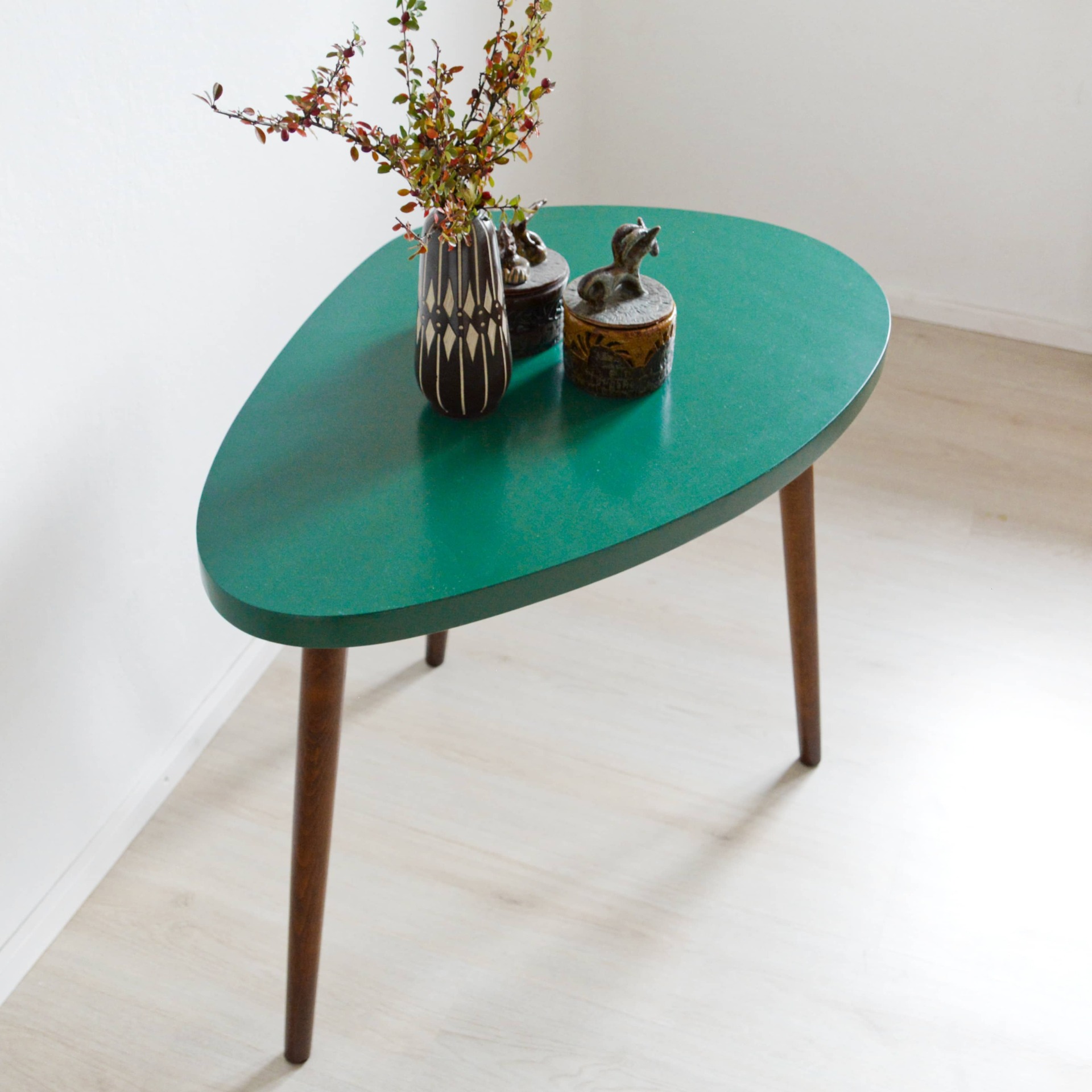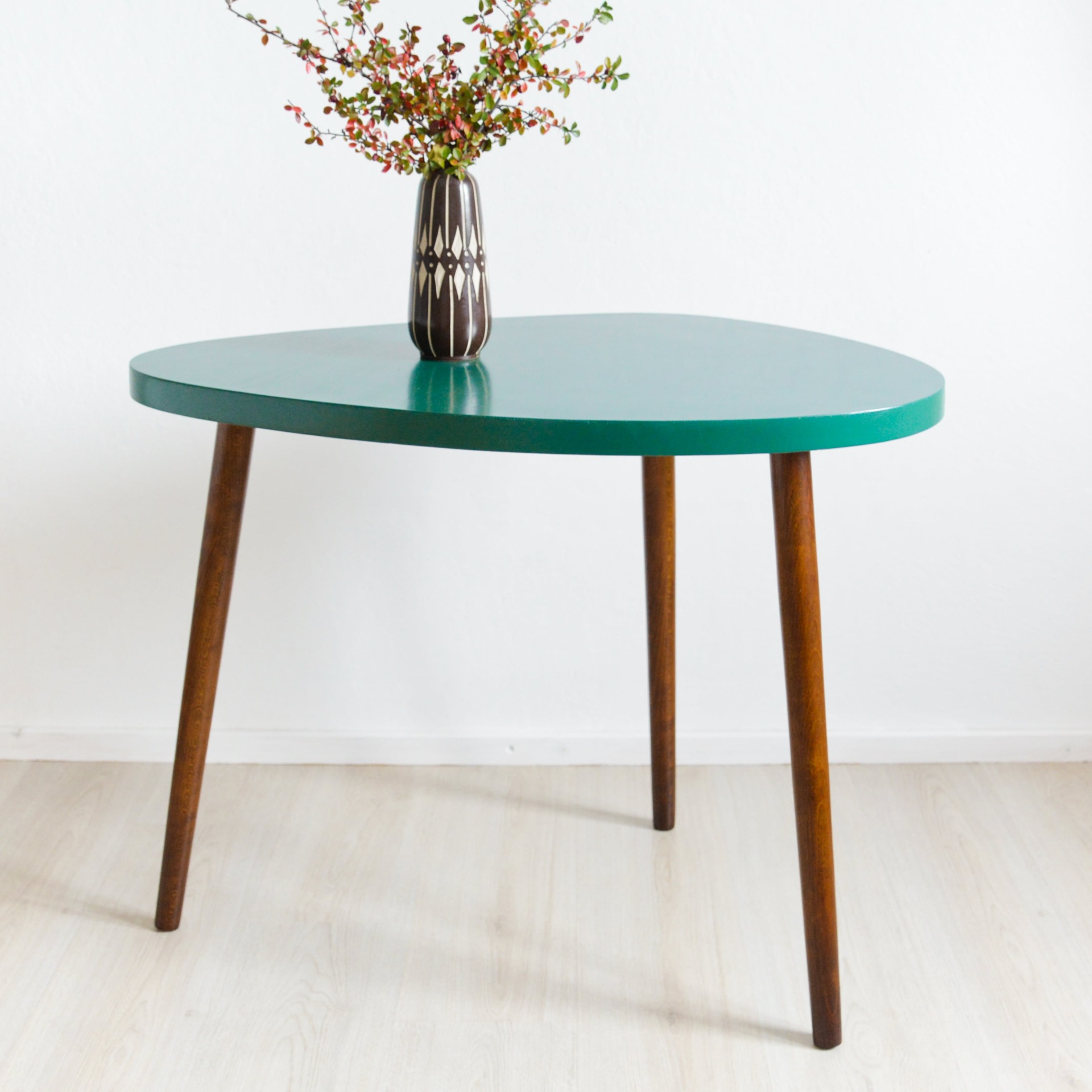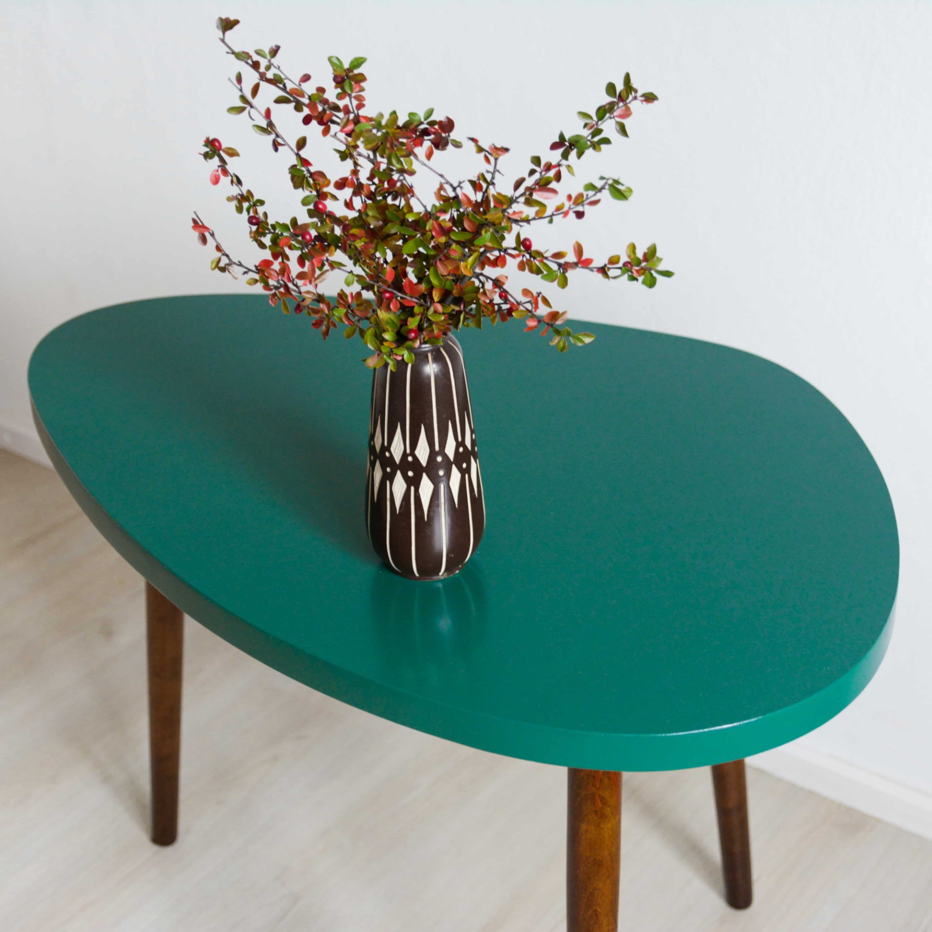 Opravený a oživený starý stolek. Elegantní kombinace masivních bukových nohou a organicky tvarované desky. Tu jsme opatřili tajemným odstínem tmavě zelené barvy, konkrétně se jedná o odstín borovicově zelené.