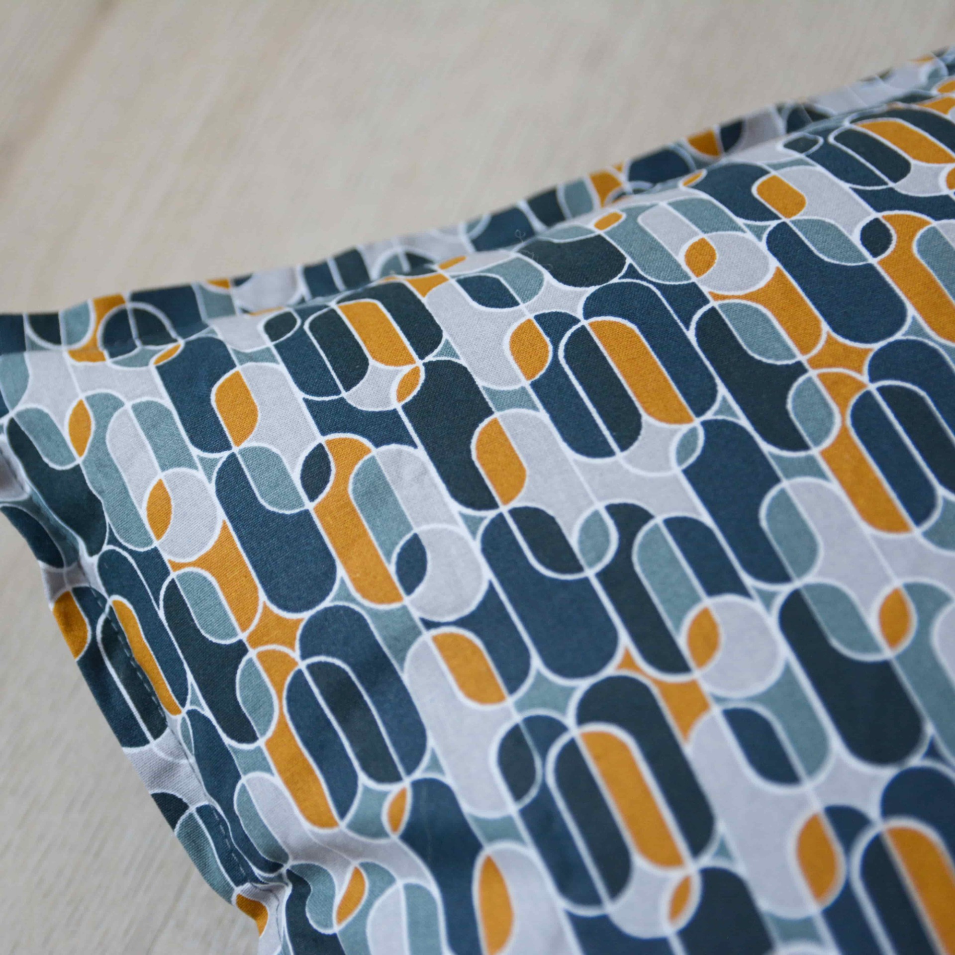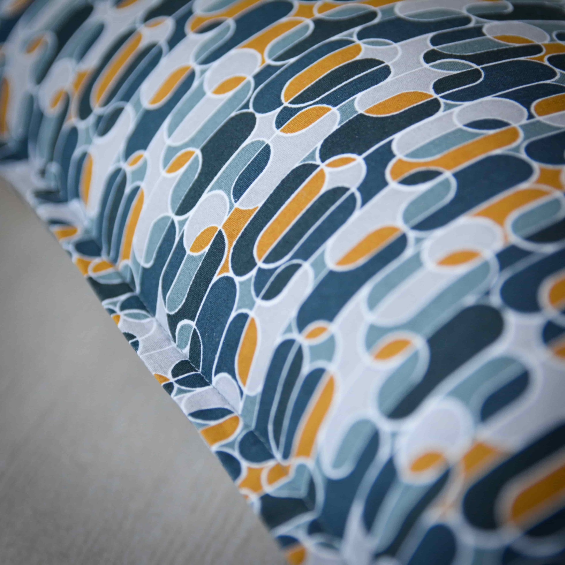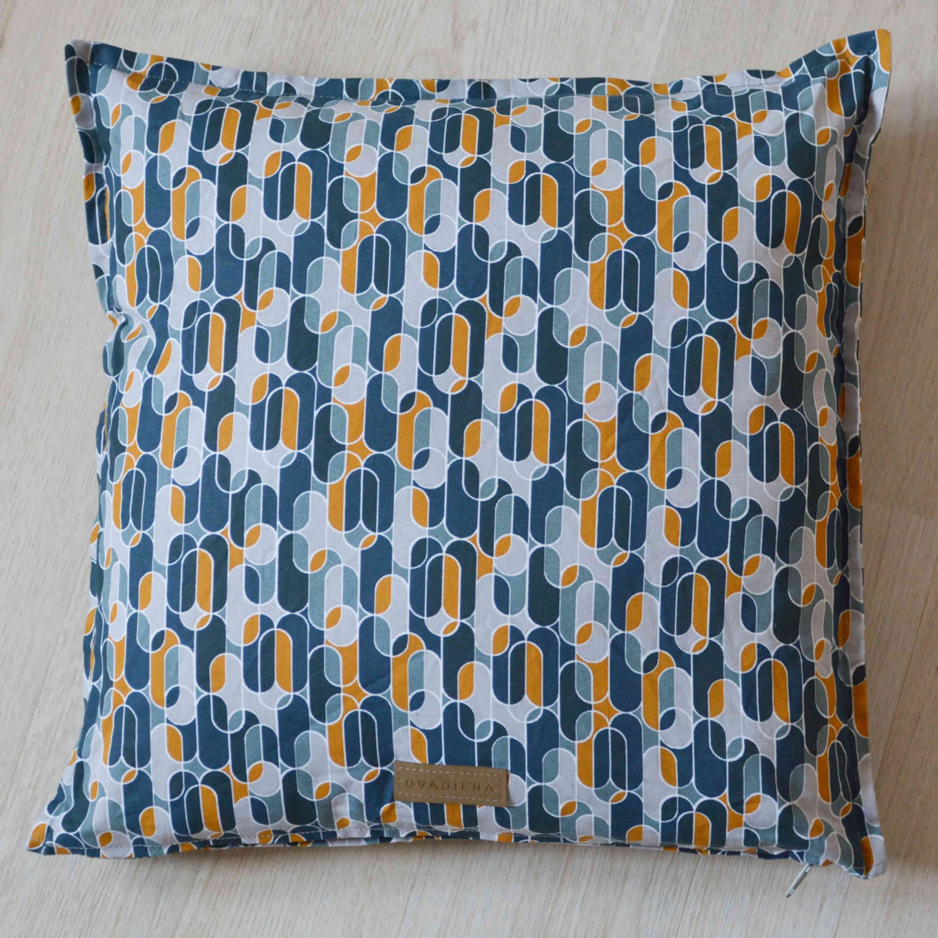 Měkký bavlněný potah na čtvercový polštář s přešívaným okrajem. Hravý výrazný vzor, který nepřehlédnete. Krásné modré akcenty s oranžovým detailem.