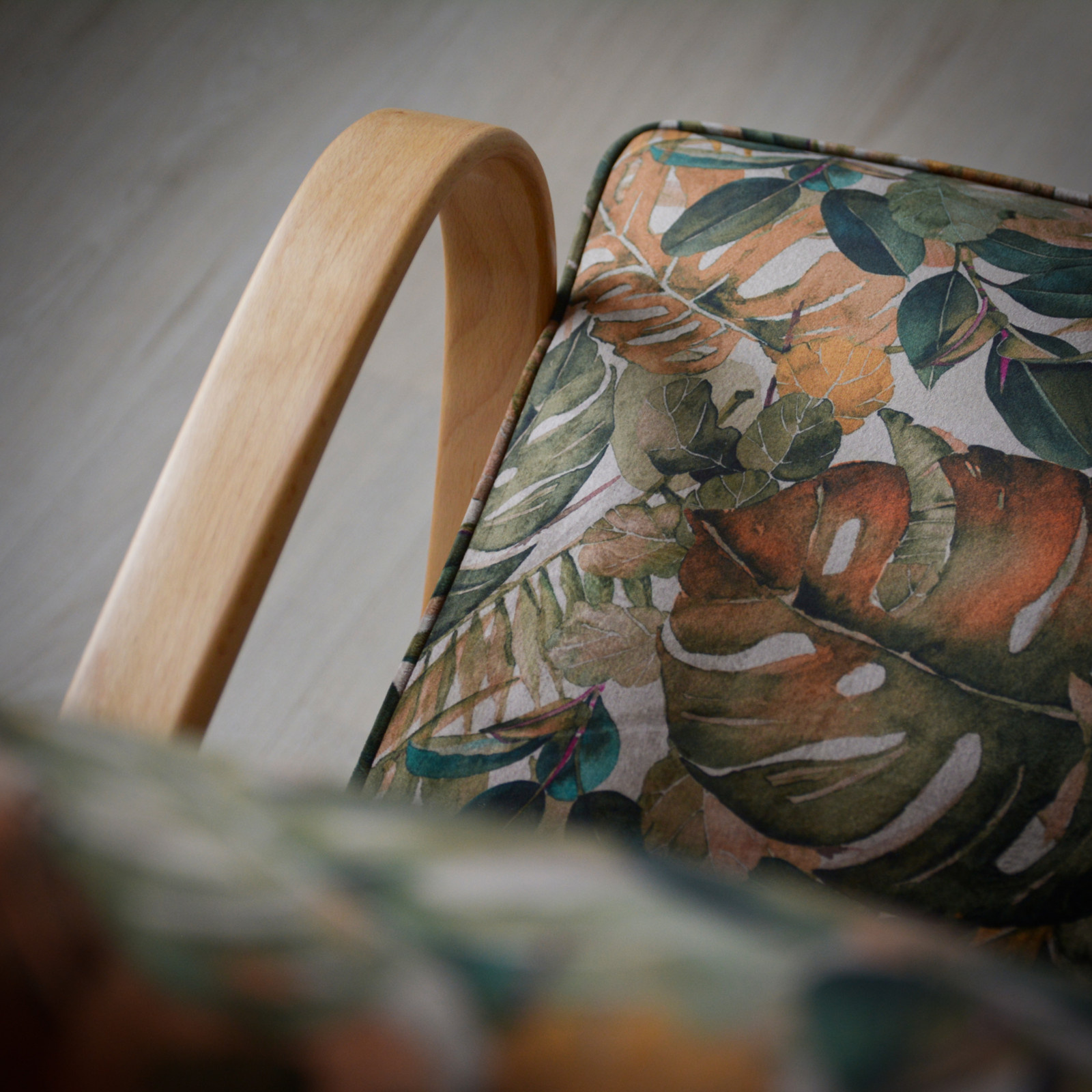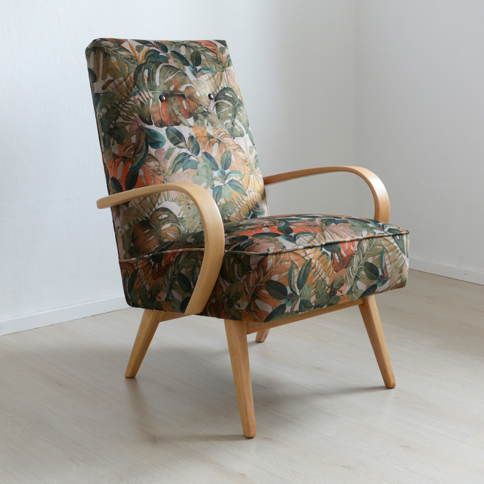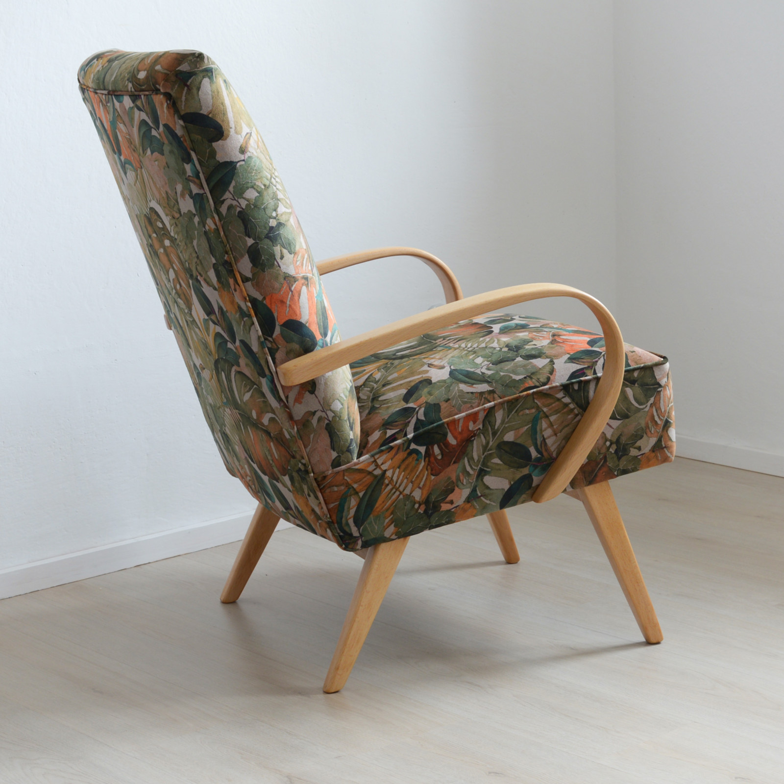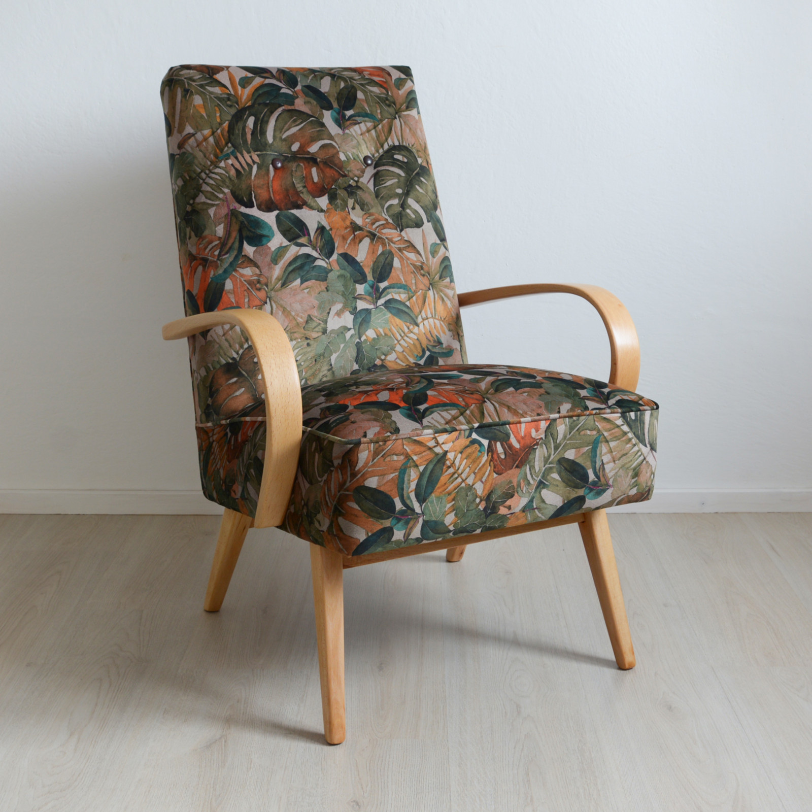 Křeslo je originál ze 60. let (TON - Bystřice p. Hostýnem) nyní po celkové renovaci a obnově - jak dřeva, tak i čalounění. Křeslo je velice pohodlné také díky tomu, že má pružinový sedák. Područky jsou z jednoho kusu ohýbaného bukového dřeva.