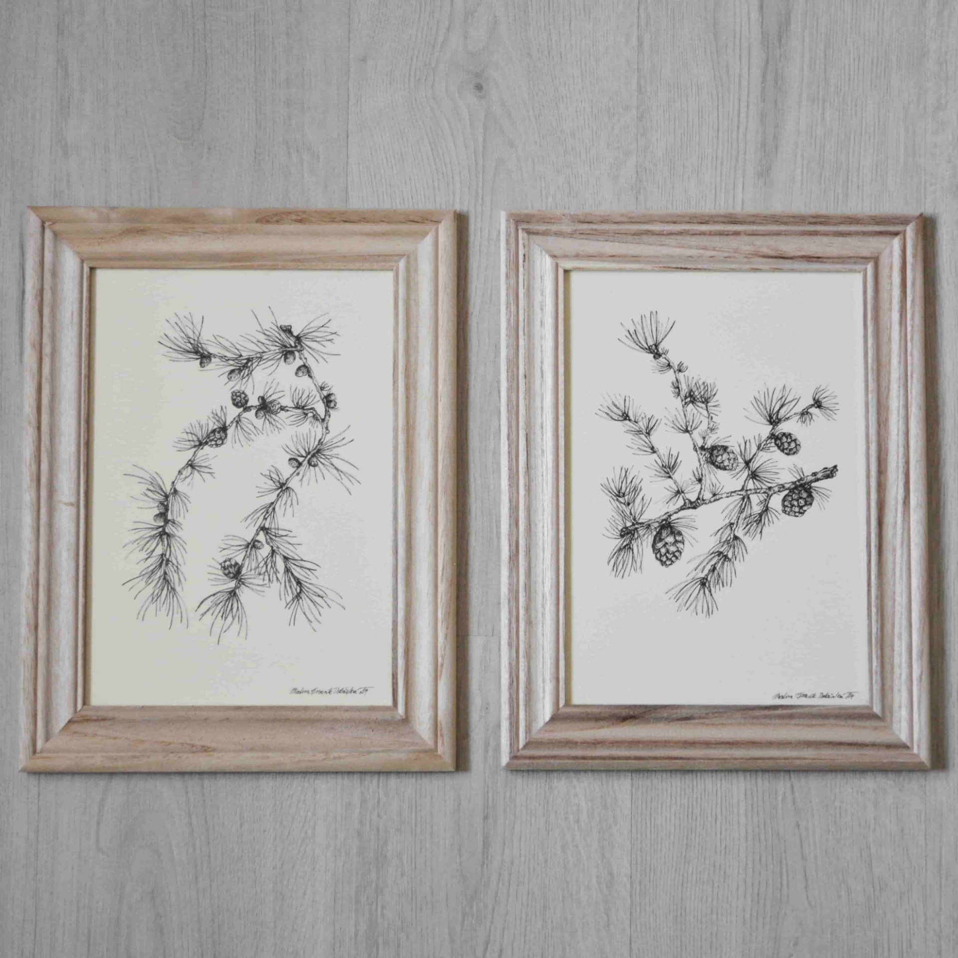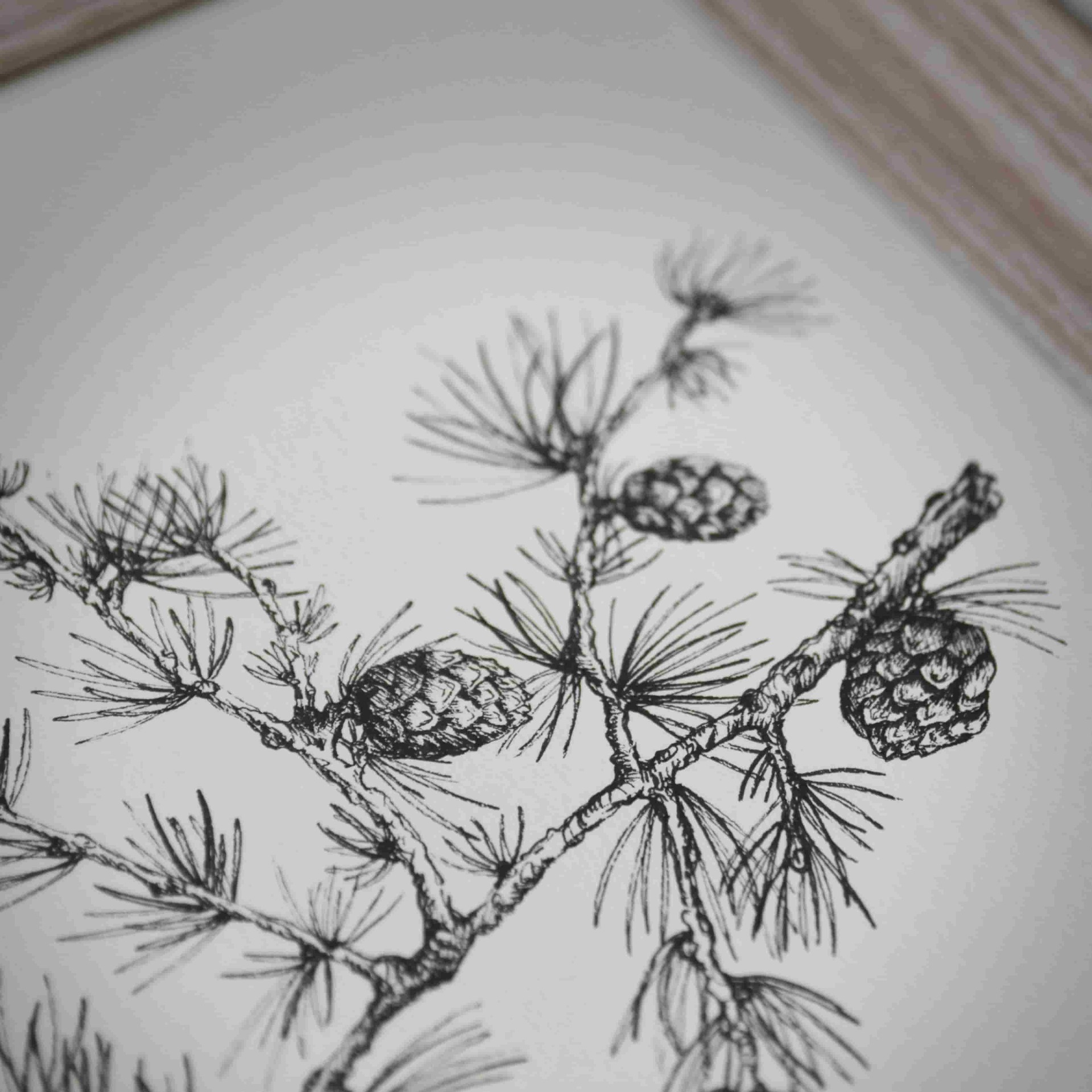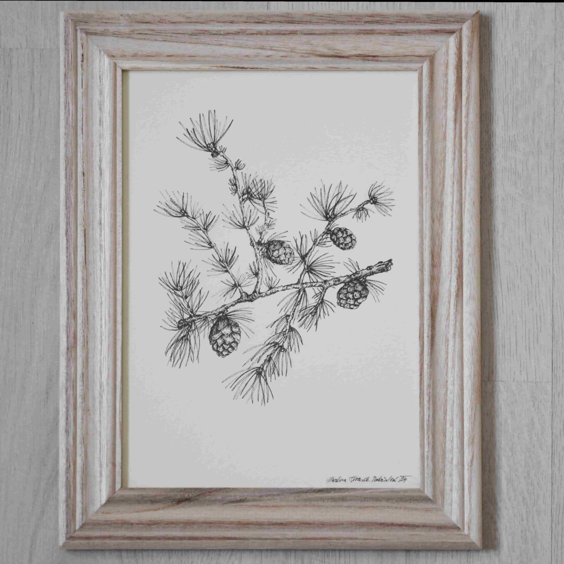 Jemná detailní kresba větvičky borovice se šiškami. Pro všechny milovníky přírodních námětů.