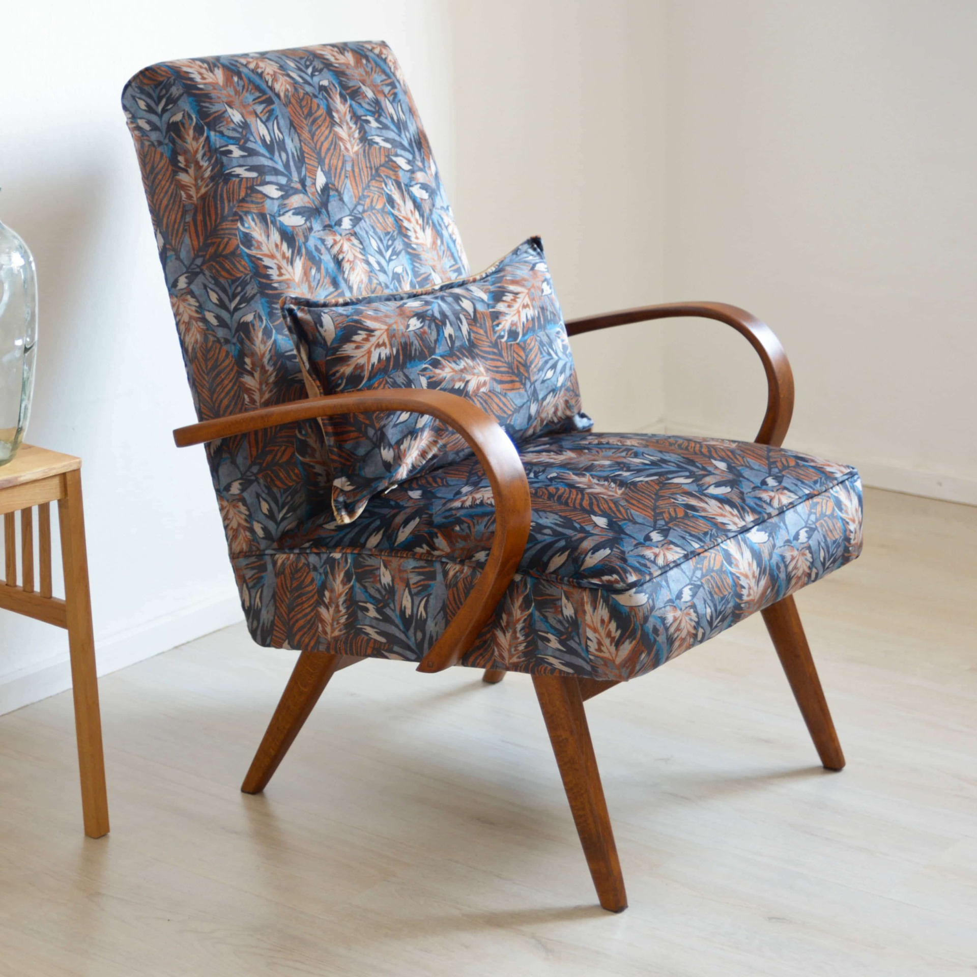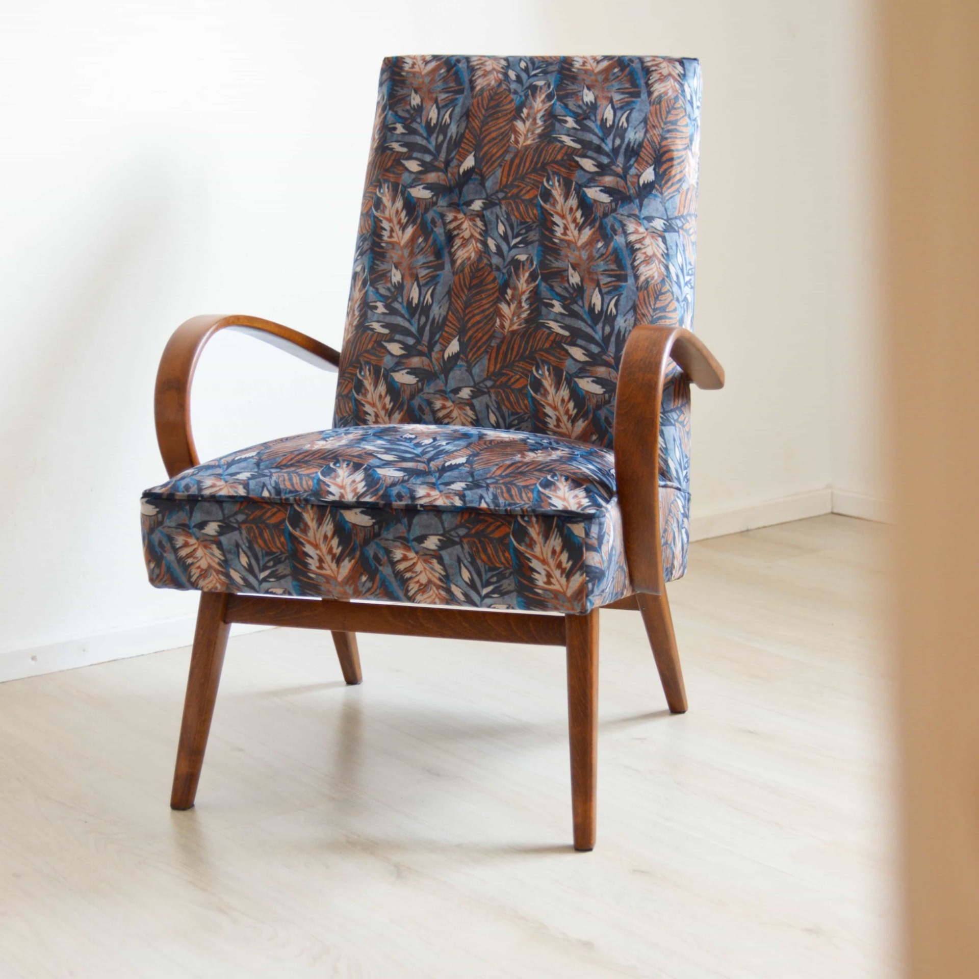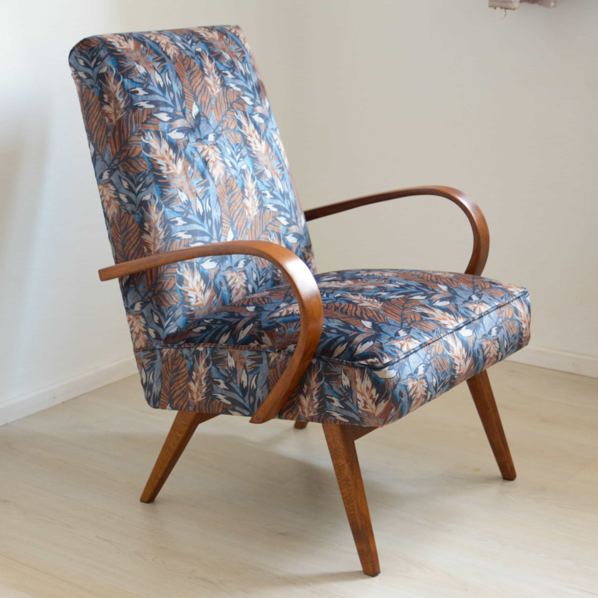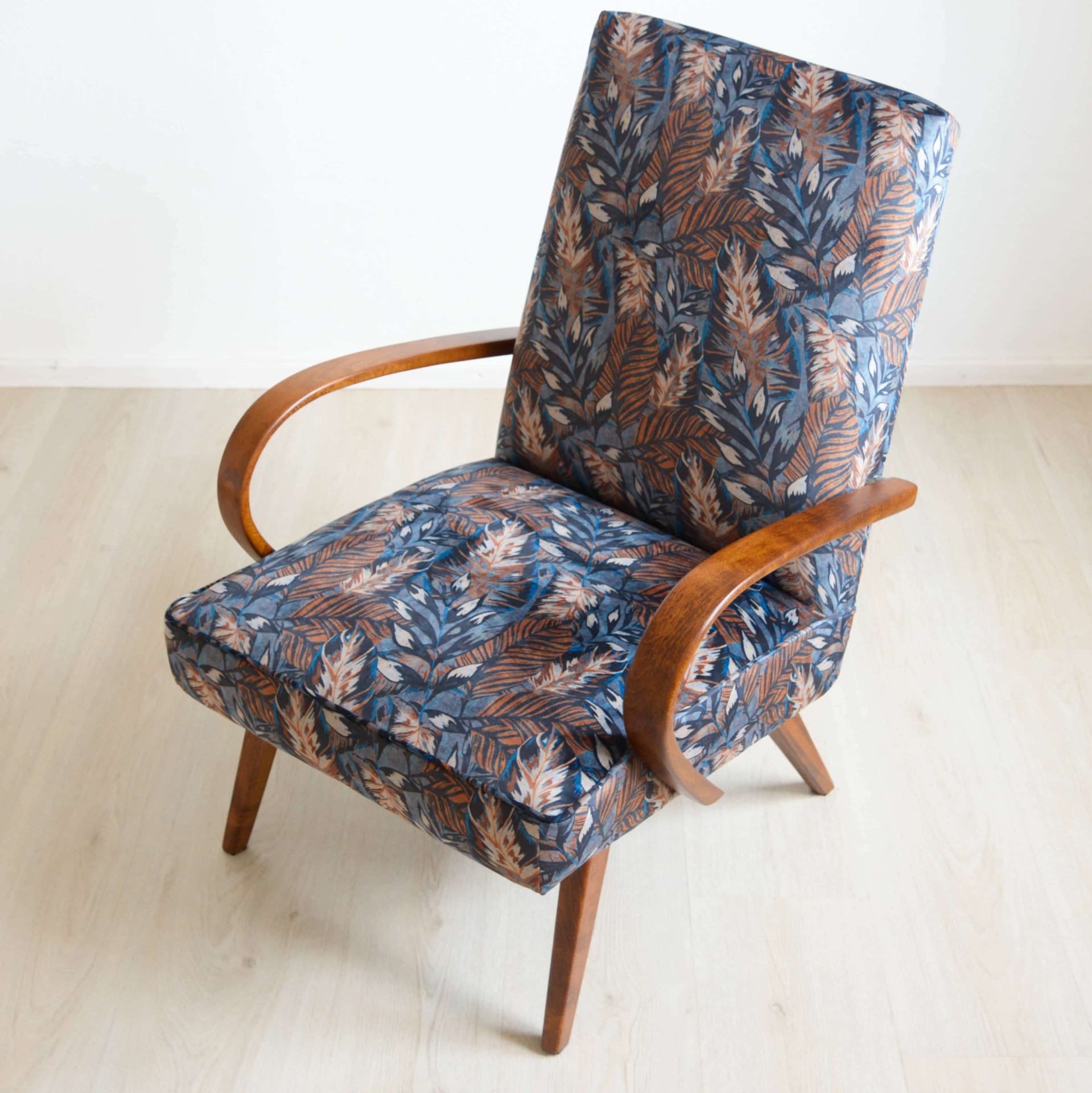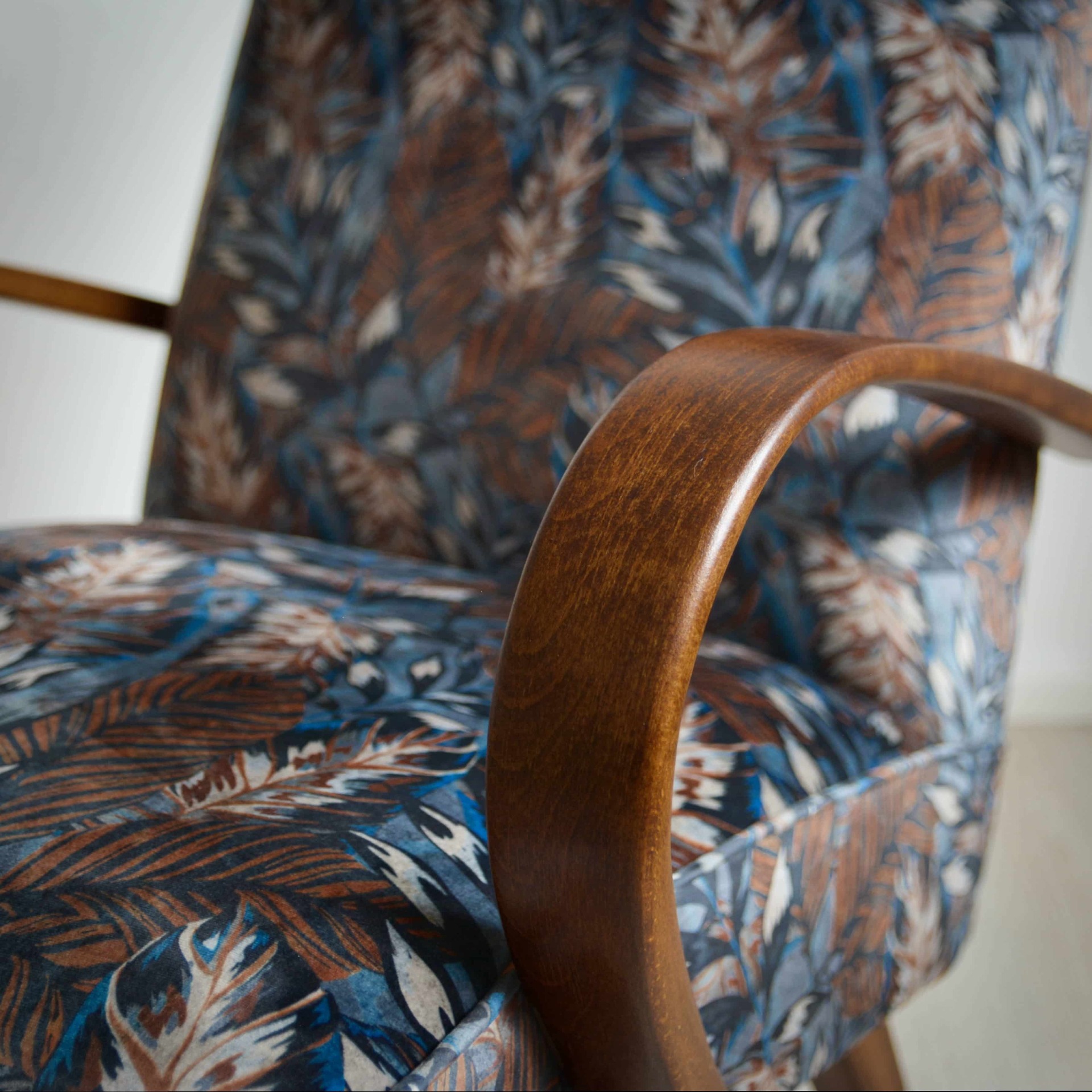 Křeslo je originál ze 60. let (TON - Bystřice p. Hostýnem) nyní po celkové renovaci a obnově - jak dřeva, tak i čalounění. Křeslo je velice pohodlné také díky tomu, že má pružinový sedák. Područky jsou z jednoho kusu ohýbaného bukového dřeva.