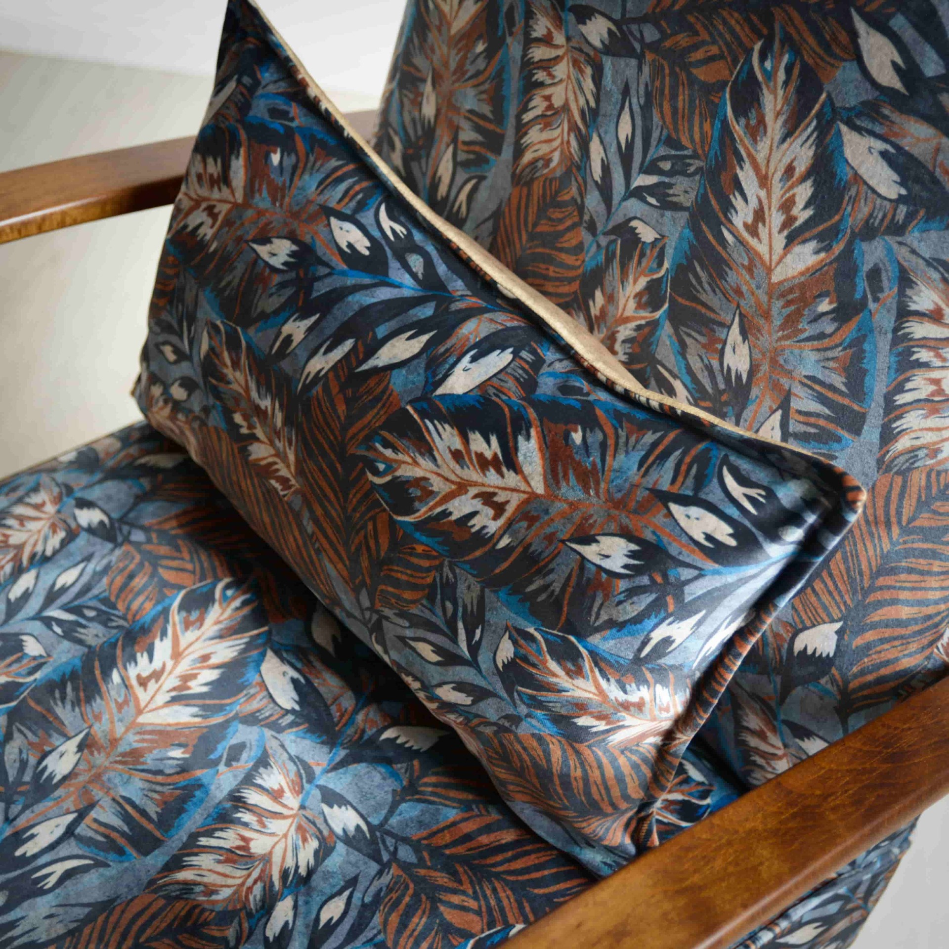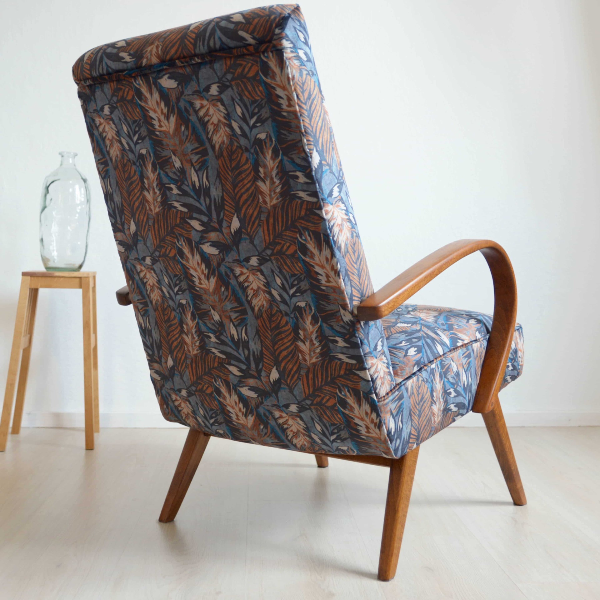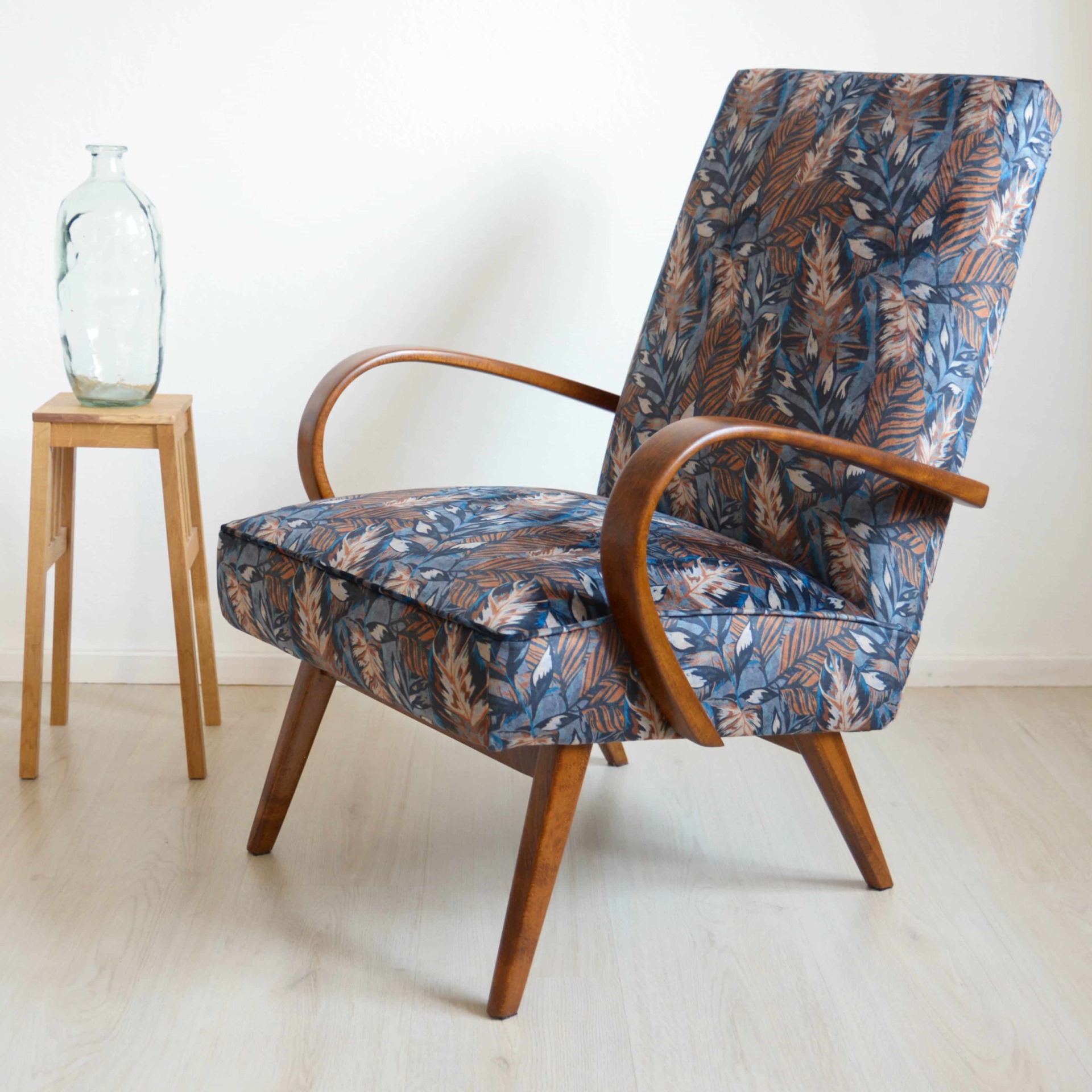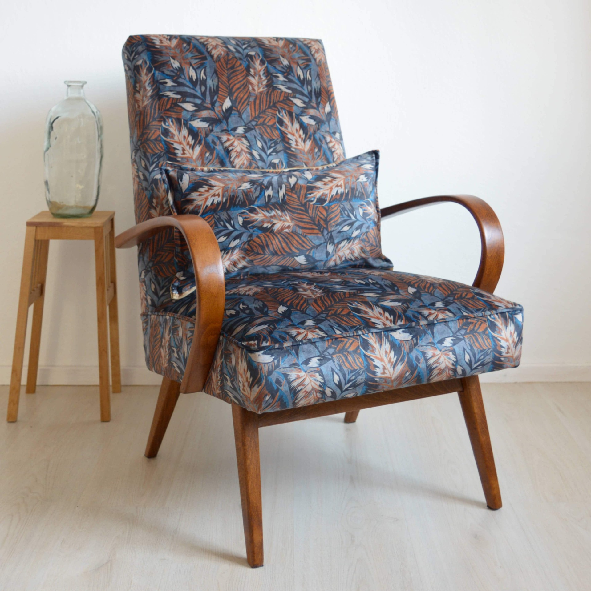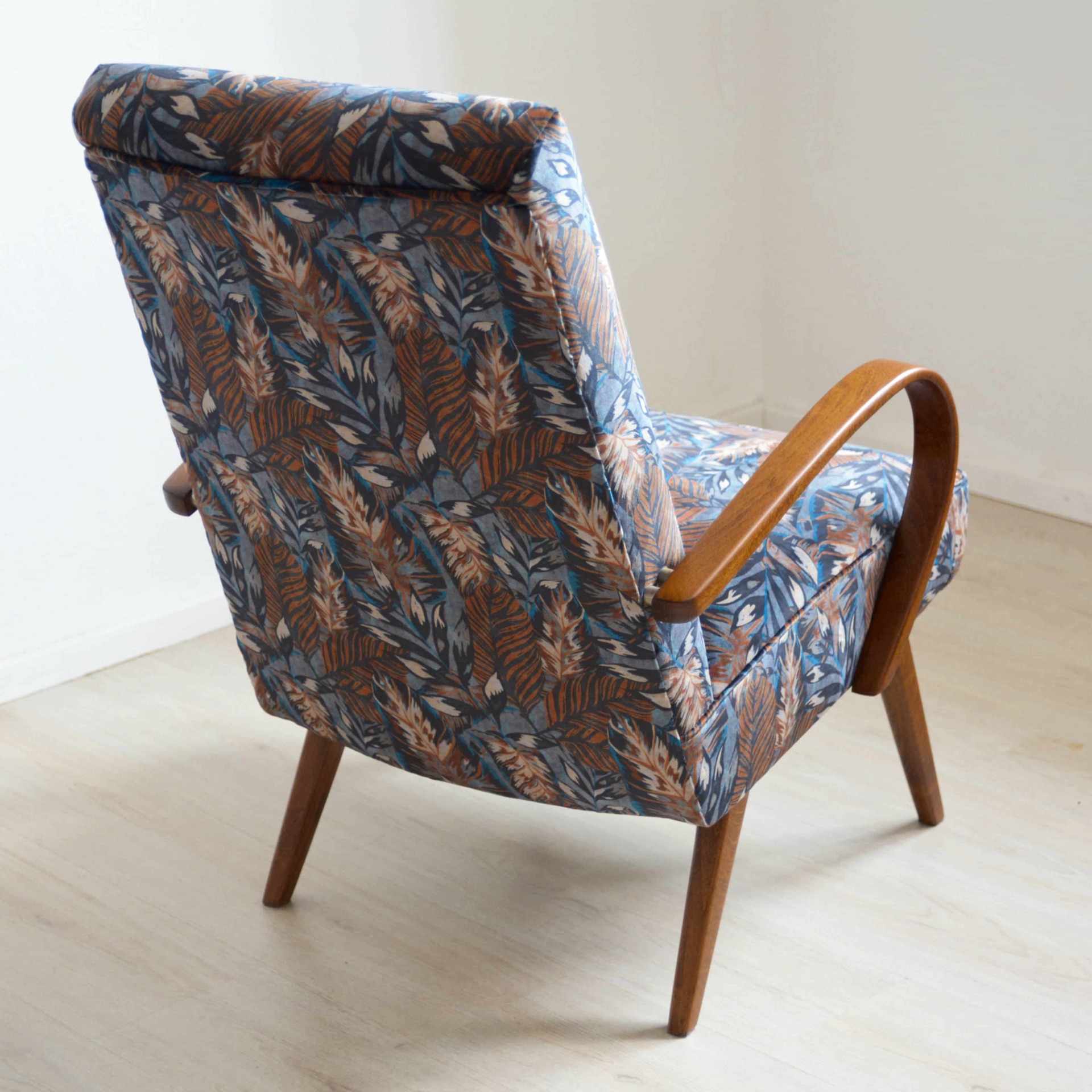 Křeslo je originál ze 60. let (TON - Bystřice p. Hostýnem) nyní po celkové renovaci a obnově - jak dřeva, tak i čalounění. Křeslo je velice pohodlné také díky tomu, že má pružinový sedák. Područky jsou z jednoho kusu ohýbaného bukového dřeva.