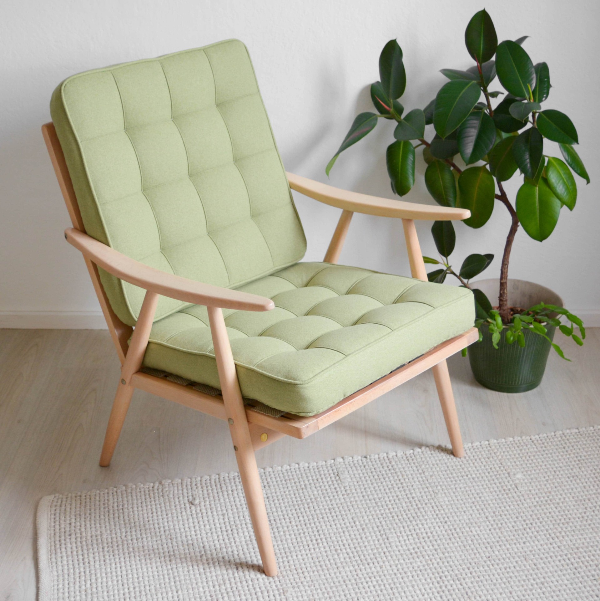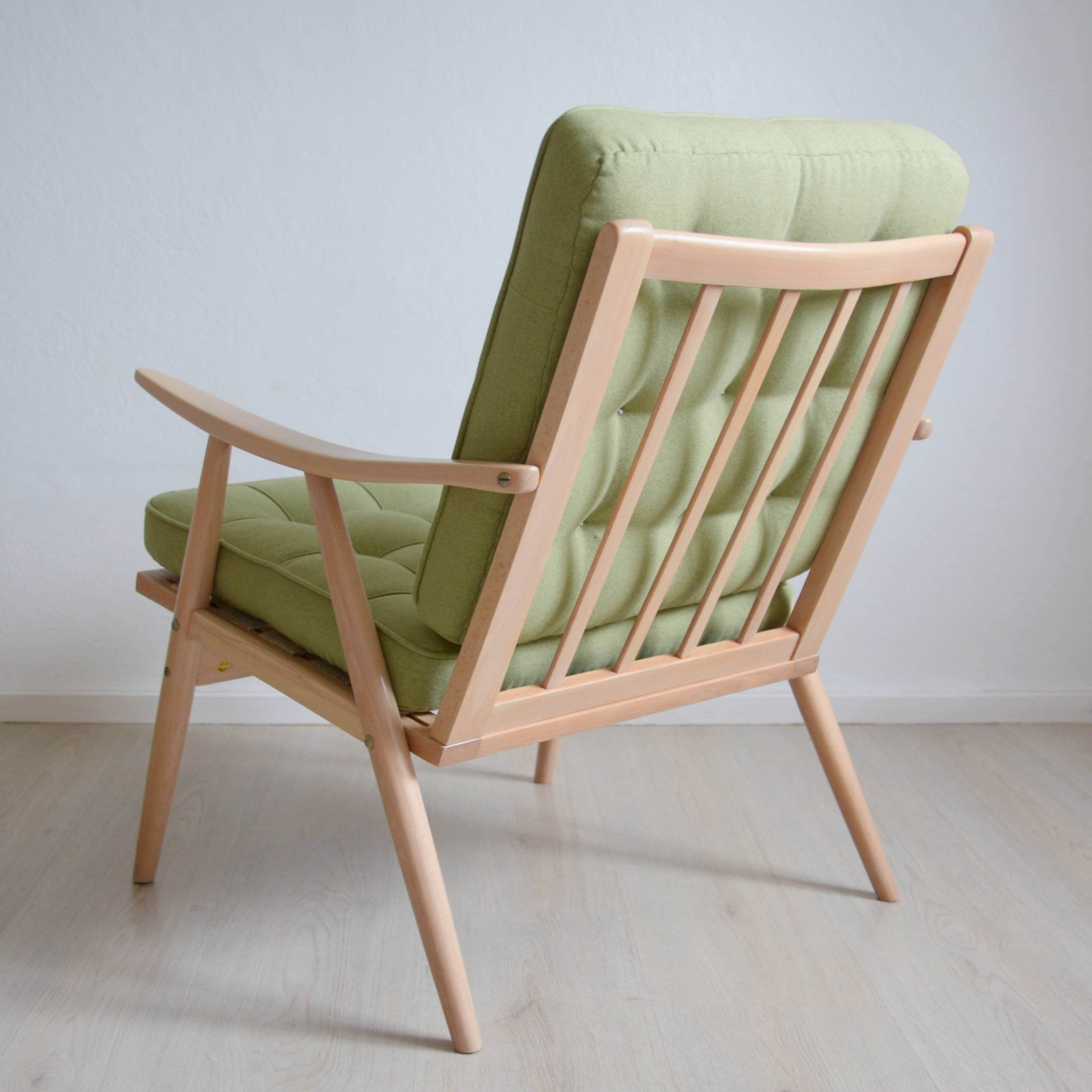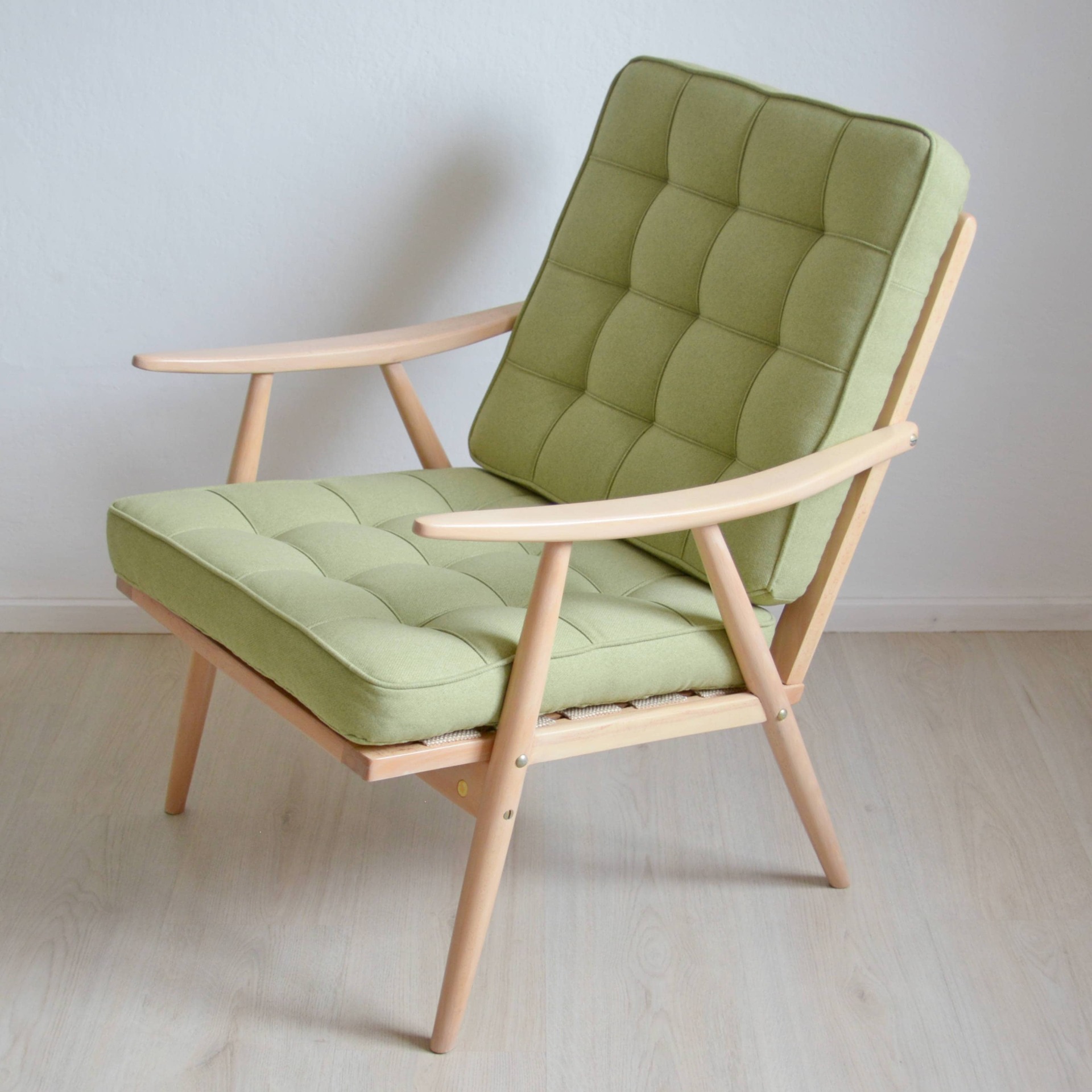 Jak probíhala renovace? Staré čalounění jsme odstranili, bukovou konstrukci rozložili a dali se do broušení. Zbavili jsme jí tlusté vrstvy nevzhledného oranžového laku, který je typický pro retro nábytek. Povrchy ošetřujeme tvrdým olejem na nábytek, který dřevu dodává přirozený vzhled a je velmi odolný. Tady je přidaná ještě bělící složka. Křeslo je opraveno pečlivě, s důrazem na detail a díky tomu vydrží další léta používání.