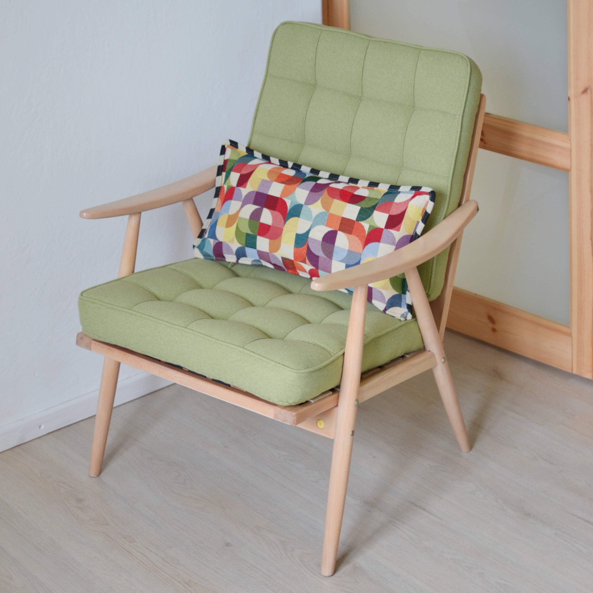 Hravá jemná elegance. Takové je naše nejnovější zrenovované křeslo. Zaujme vás tvrdé bukové dřevo a nově vyrobené čalounění s prošíváním a stažením.