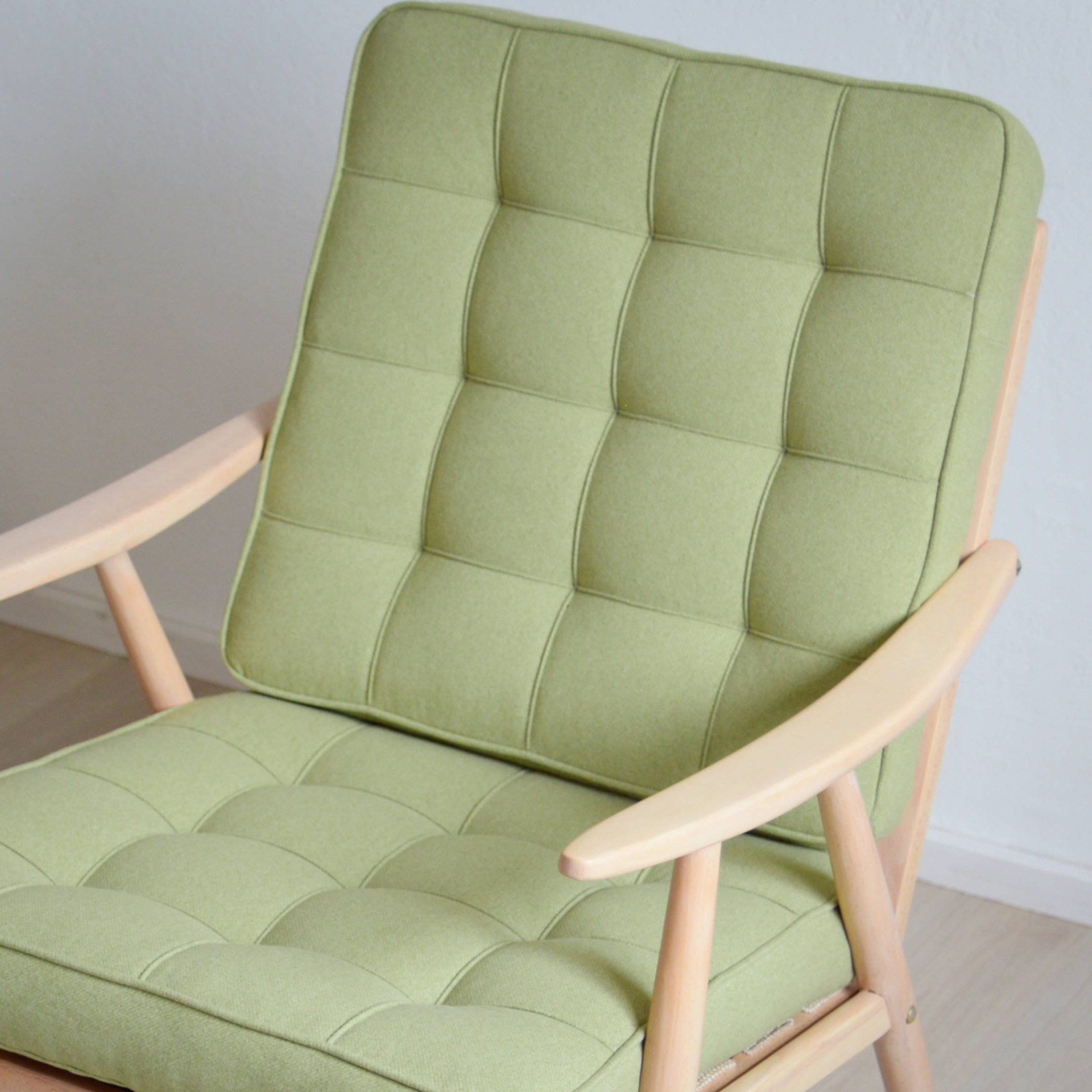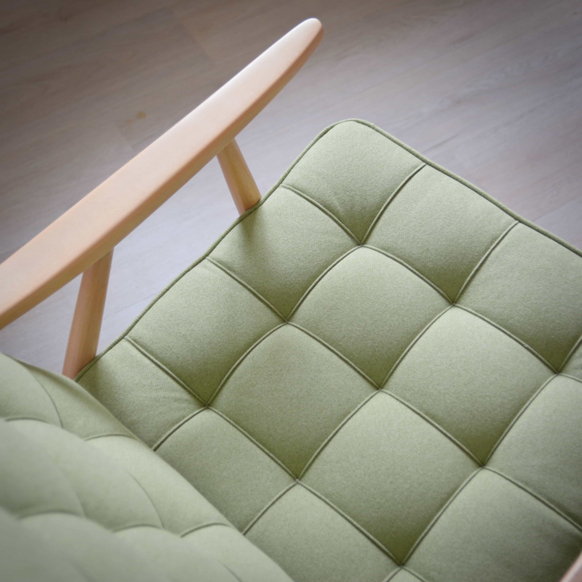 Látka má svěží odstín hráškově zelené, i proto jsme zvolili název Lusk. Žádné vzory, žádné výrazné odstíny, křeslo zaujme čistotou designu a provedení.