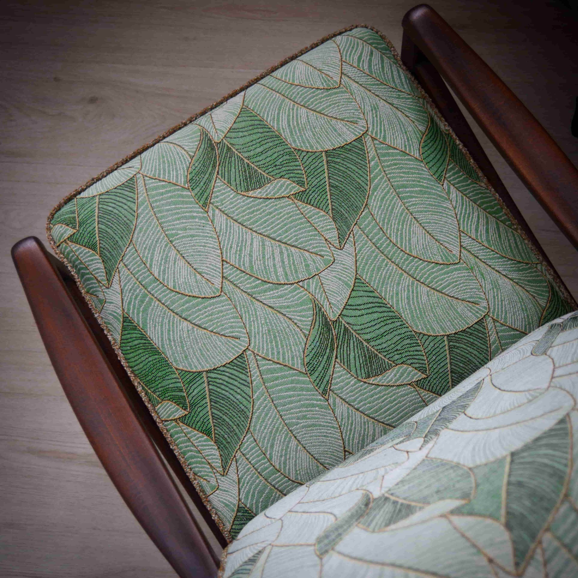 Jak u nás probíhá renovace? Staré čalounění jsme nejprve celé odstranili a pustili se do důkladného broušení dřeva. Následuje zpevnění konstrukce a nová povrchová úprava. Tady jsme volili ořechové moření, abychom podtrhli přírodní odstín látek a zvýraznili tak listové vzory. Nové jsou také popruhy v sedáku a v opěráku včetně kvalitních moderních výplní.