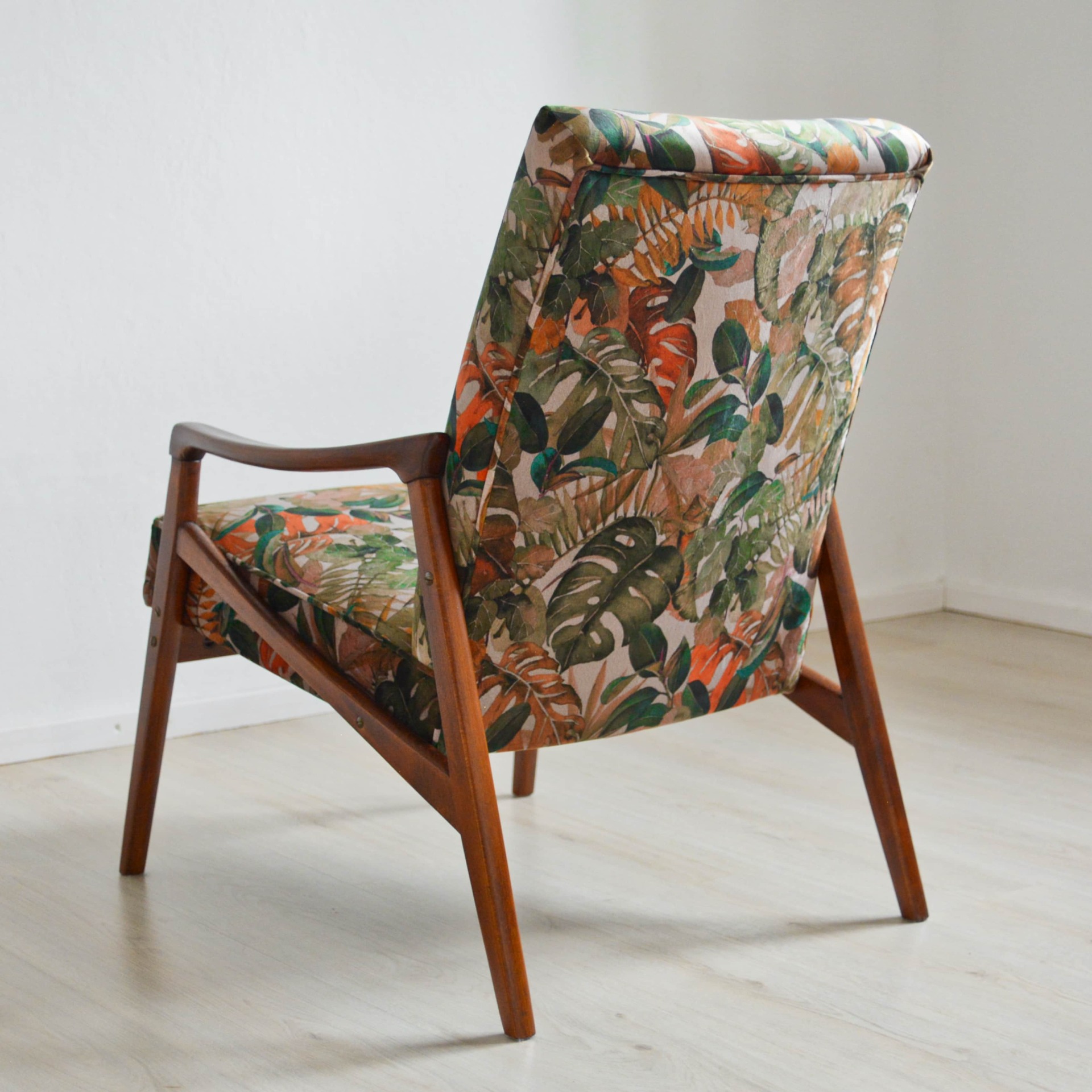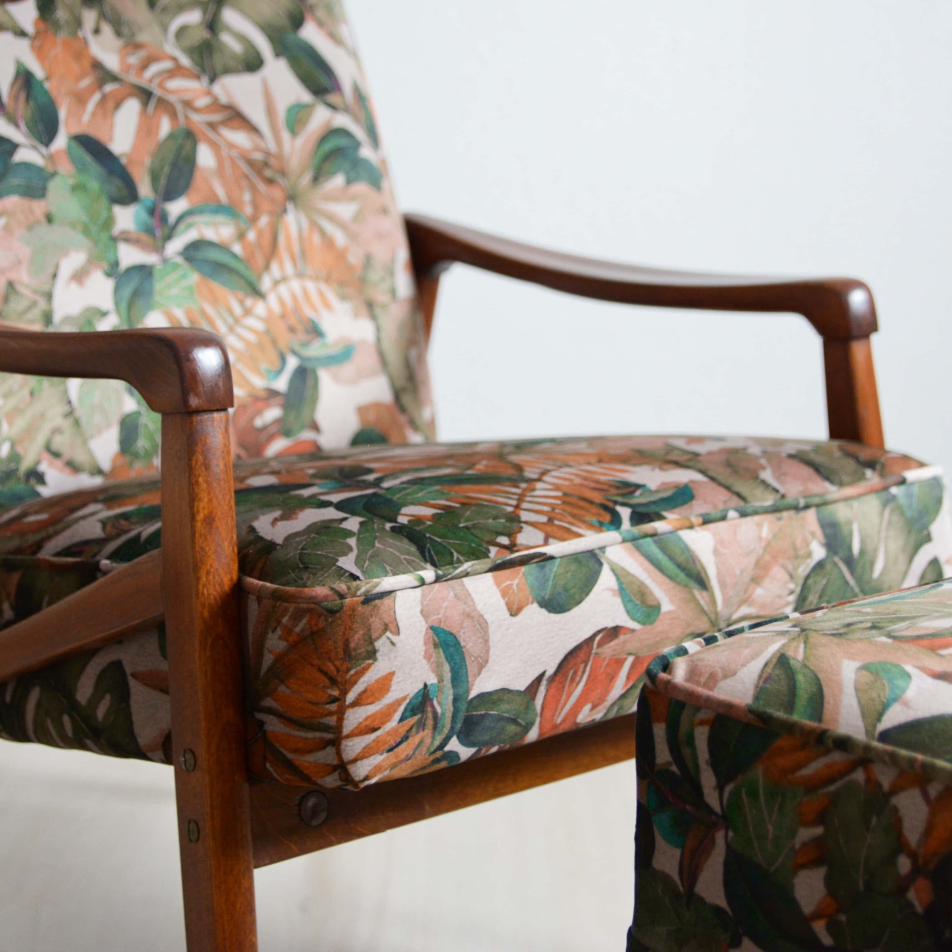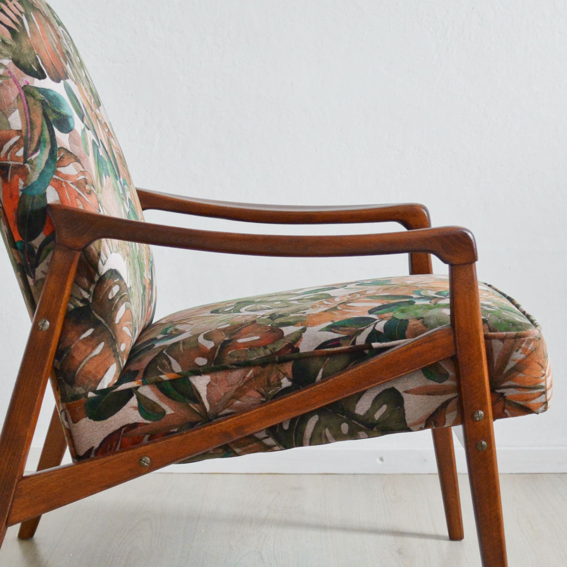 Křeslo je originál ze 60. let, nyní po celkové renovaci a obnově - jak dřeva, tak i čalounění. Design křesla vás zaujme vás jednoduchým tvarem, pohodlným sezením. Područky jsou z bukového dřeva.