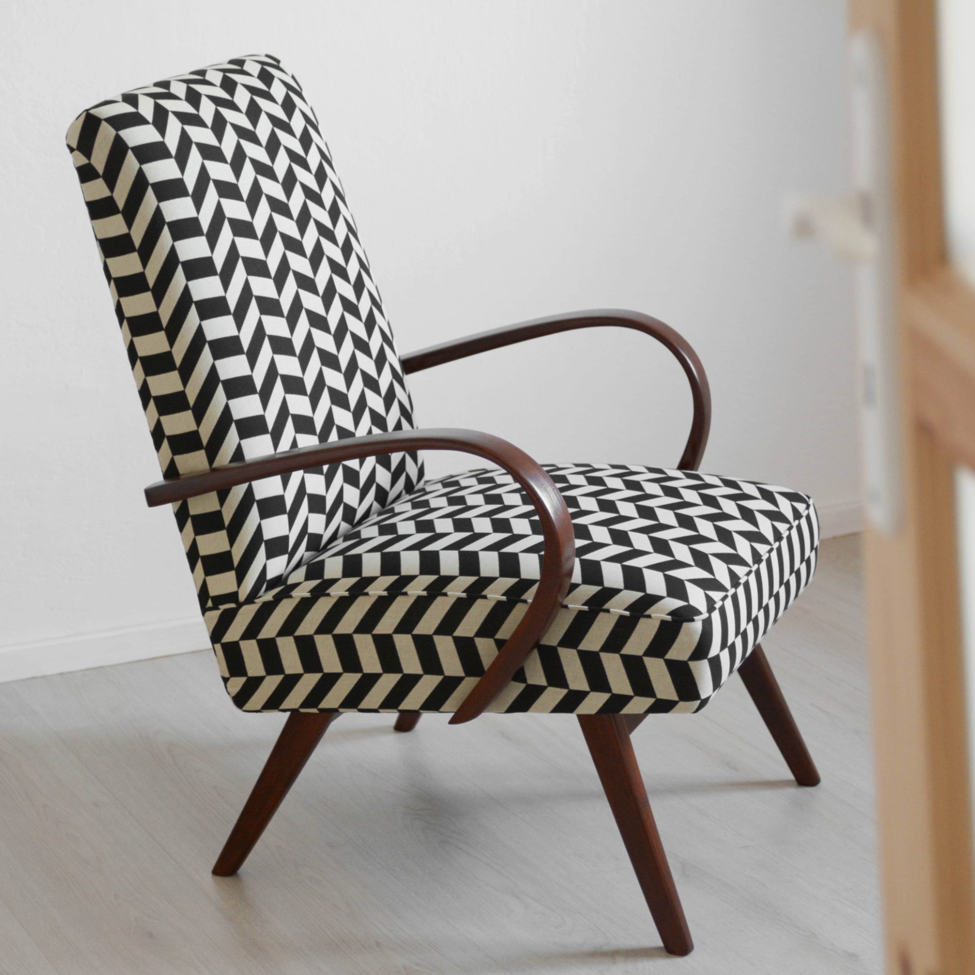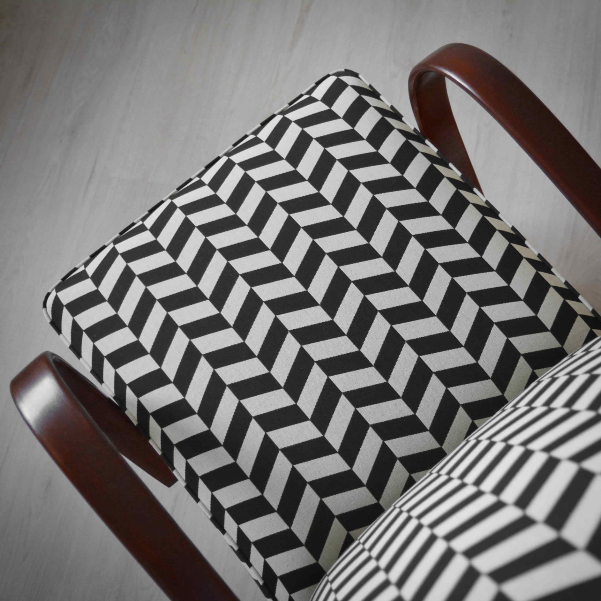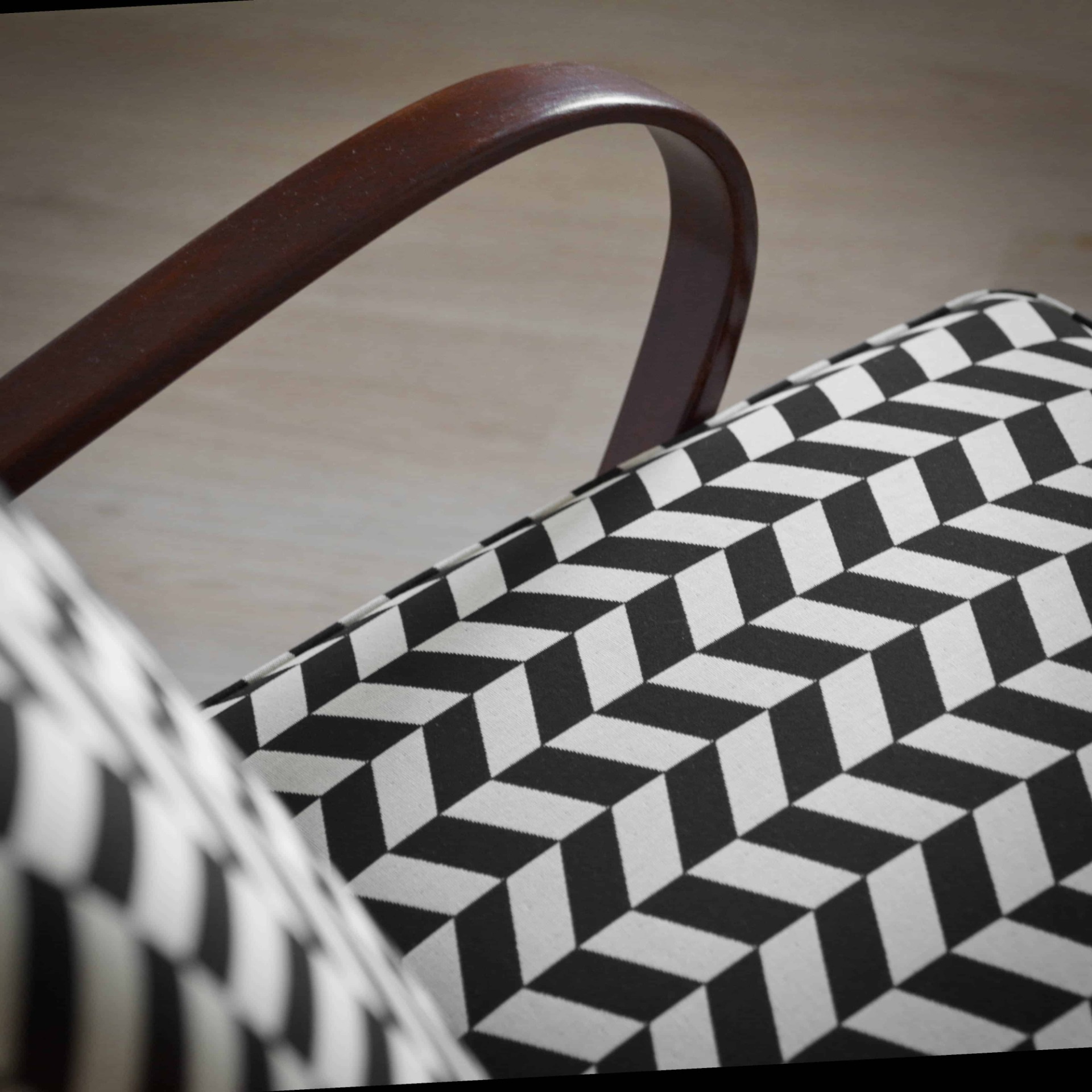 Ohýbané bukové dřevo na područkách je nově v odstínu ořech a doplňuje ho výrazný vzor v černobílé kombinaci. Látka je určená pro čalounění a nabídne vám tak odolný povrch, který se snadno udržuje, navíc s vodoodpudivou úpravou.