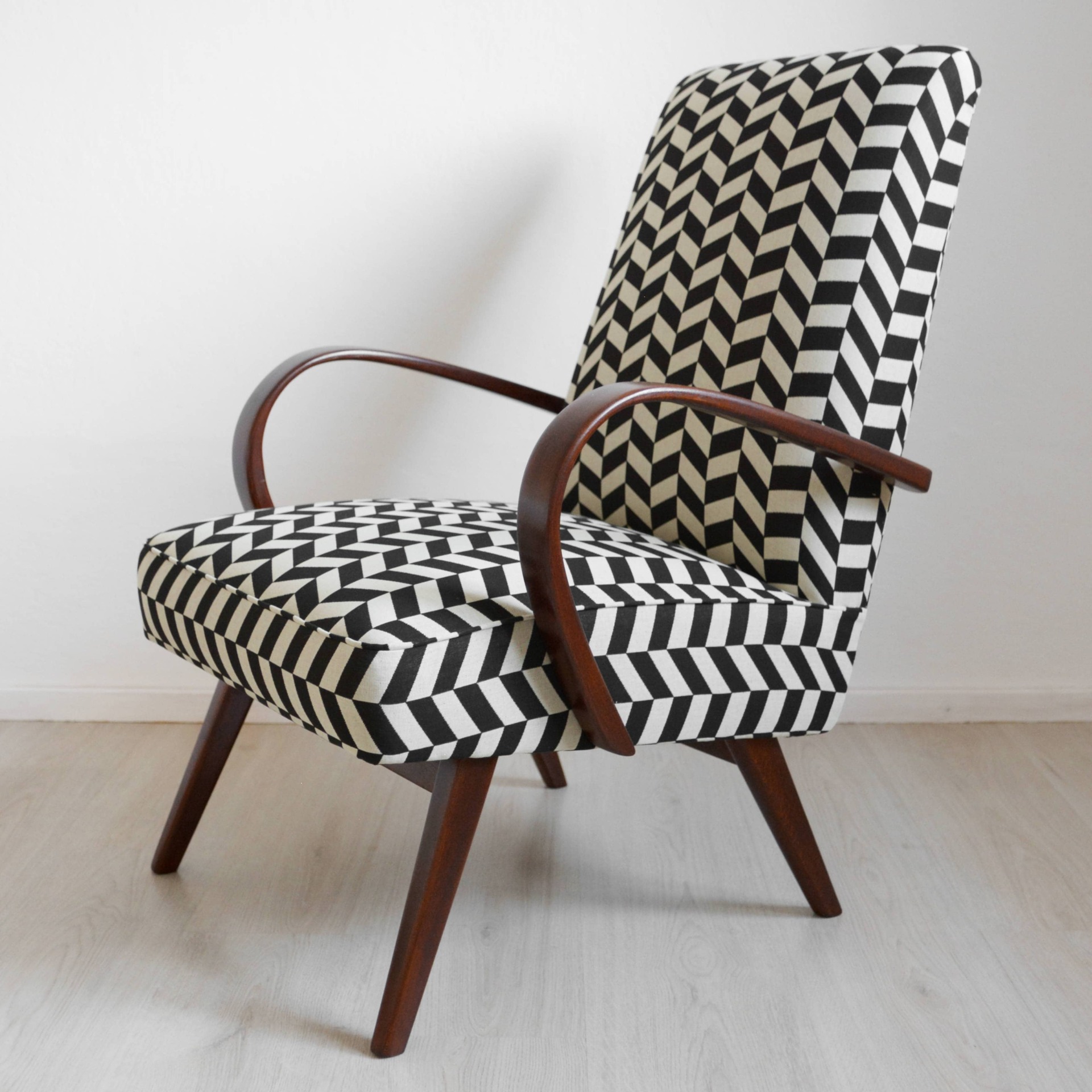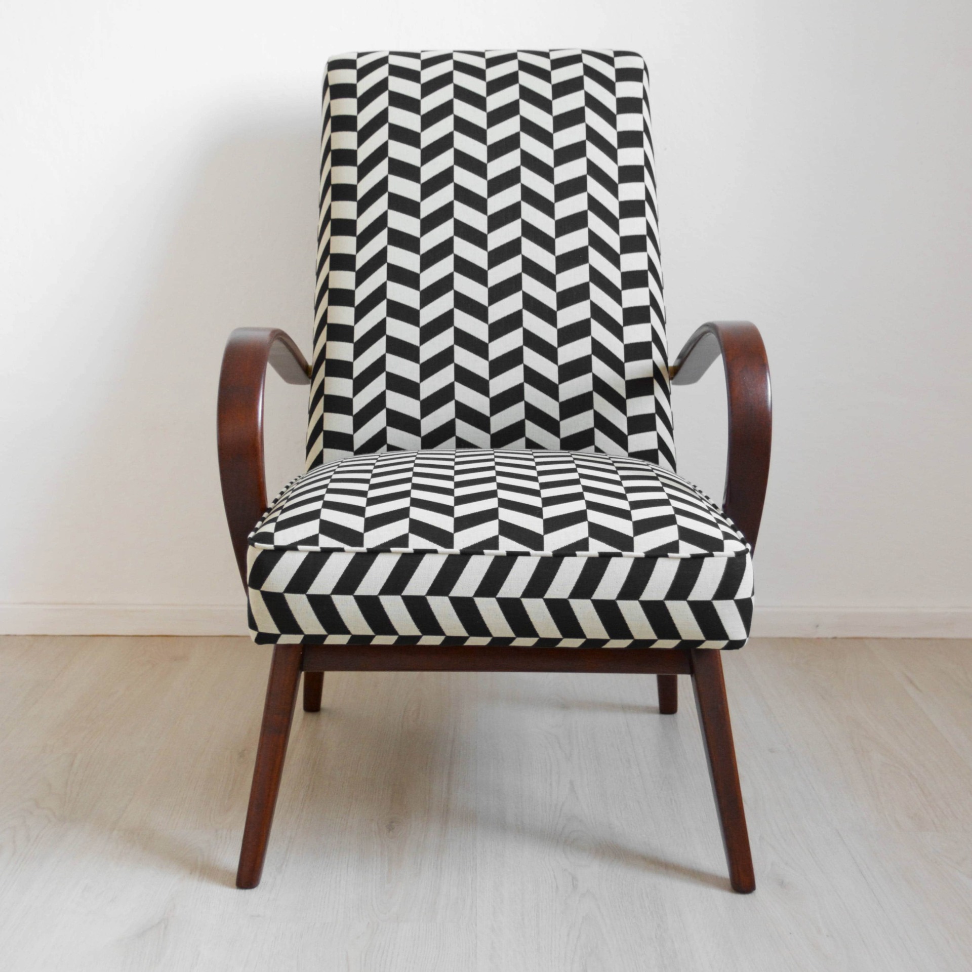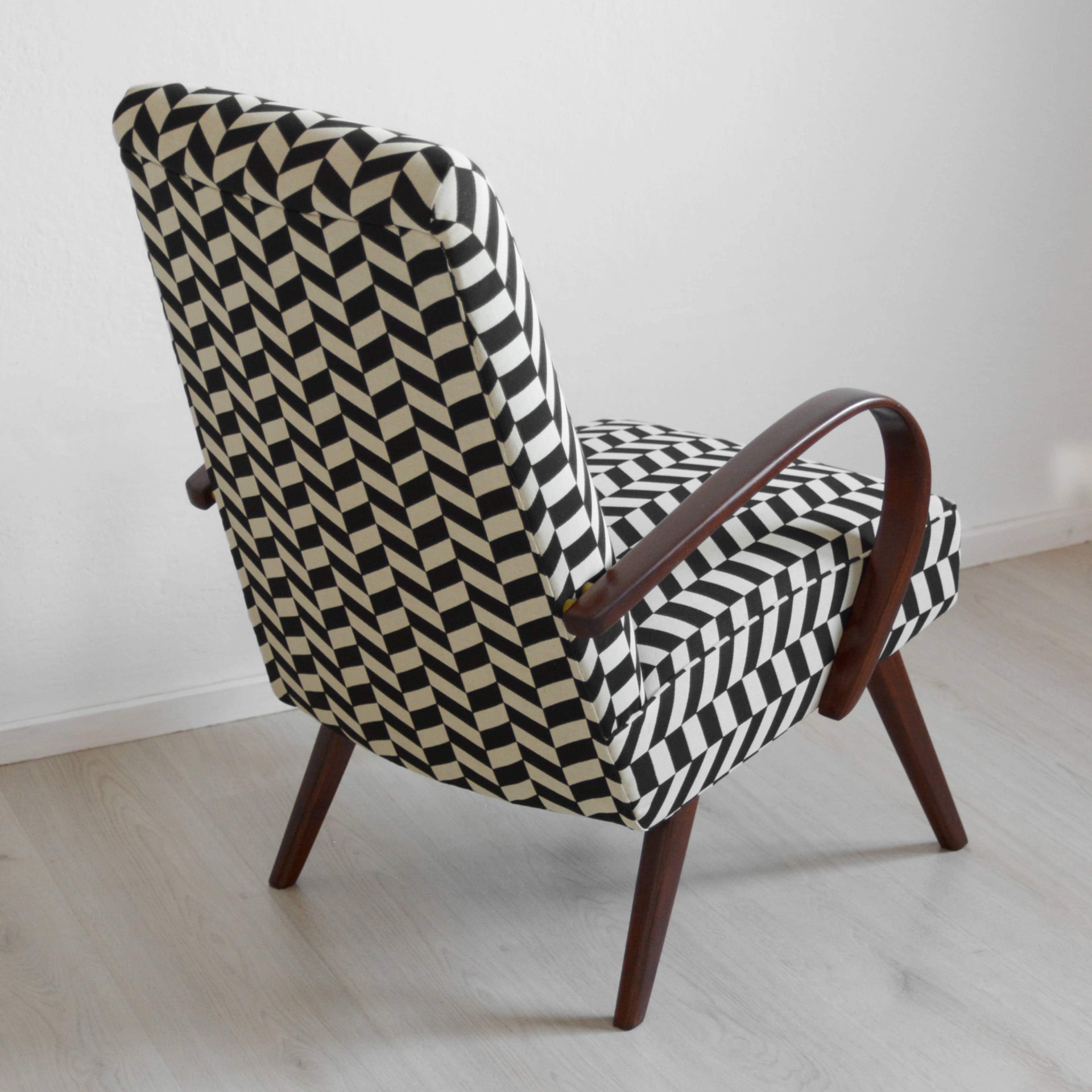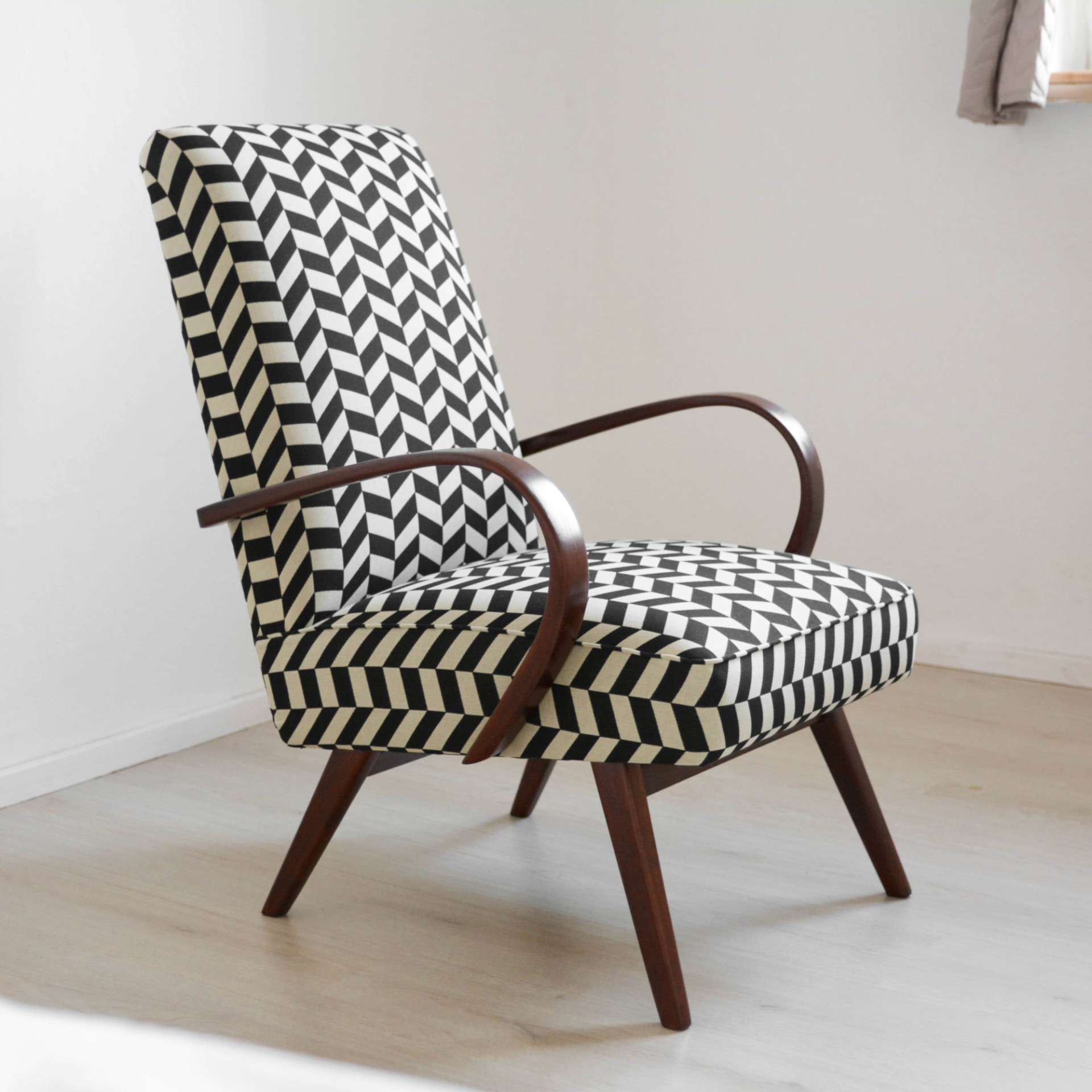 Ohýbané bukové dřevo na područkách je nově v odstínu ořech a doplňuje ho výrazný vzor v černobílé kombinaci. Látka je určená pro čalounění a nabídne vám tak odolný povrch, který se snadno udržuje, navíc s vodoodpudivou úpravou.
