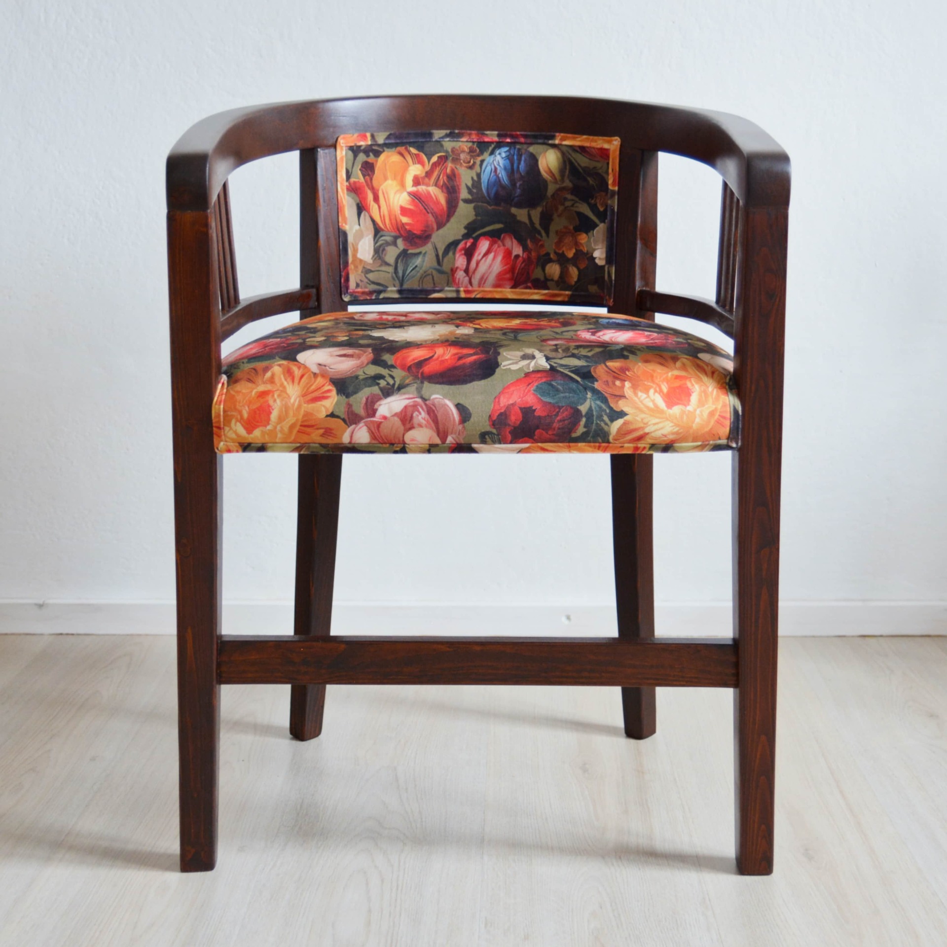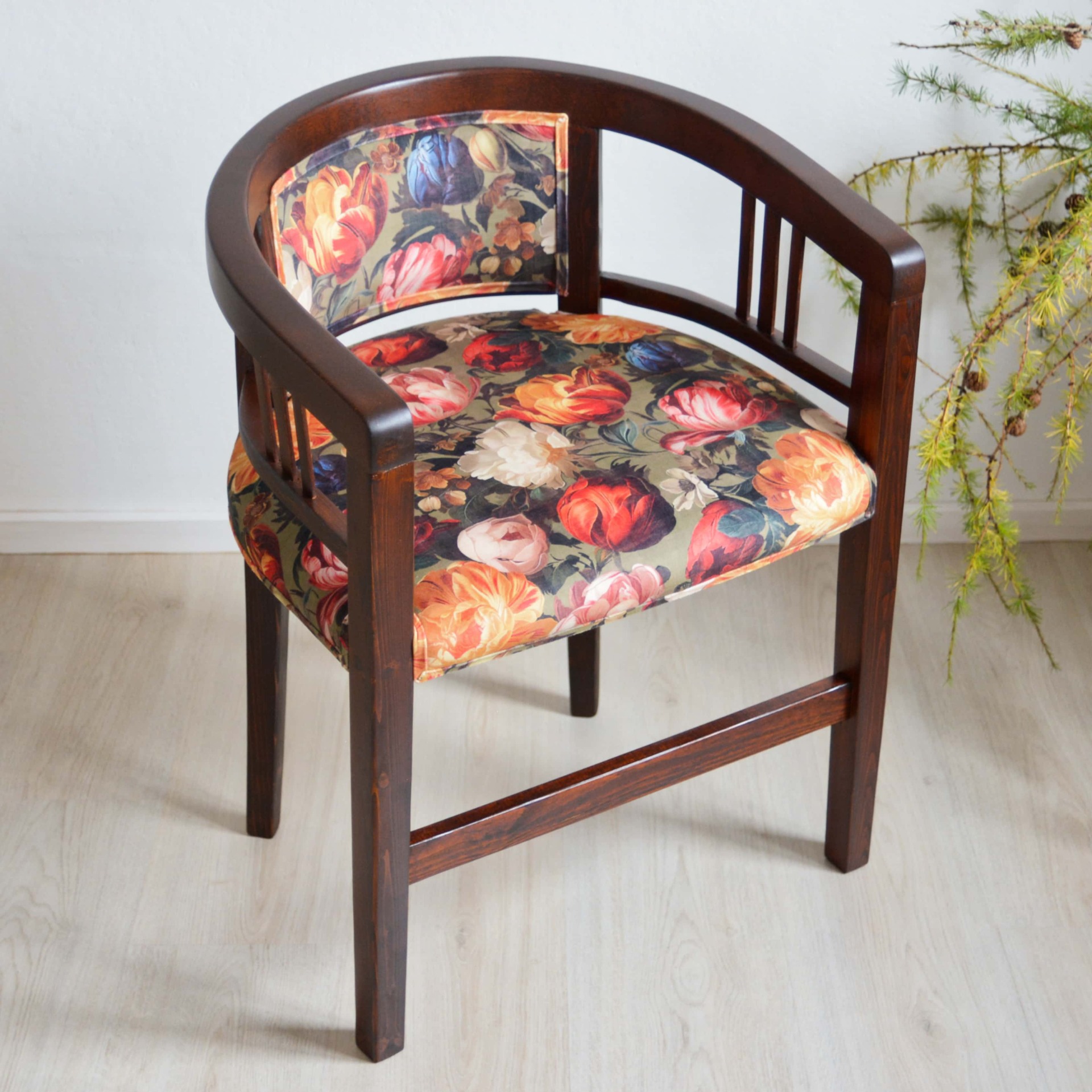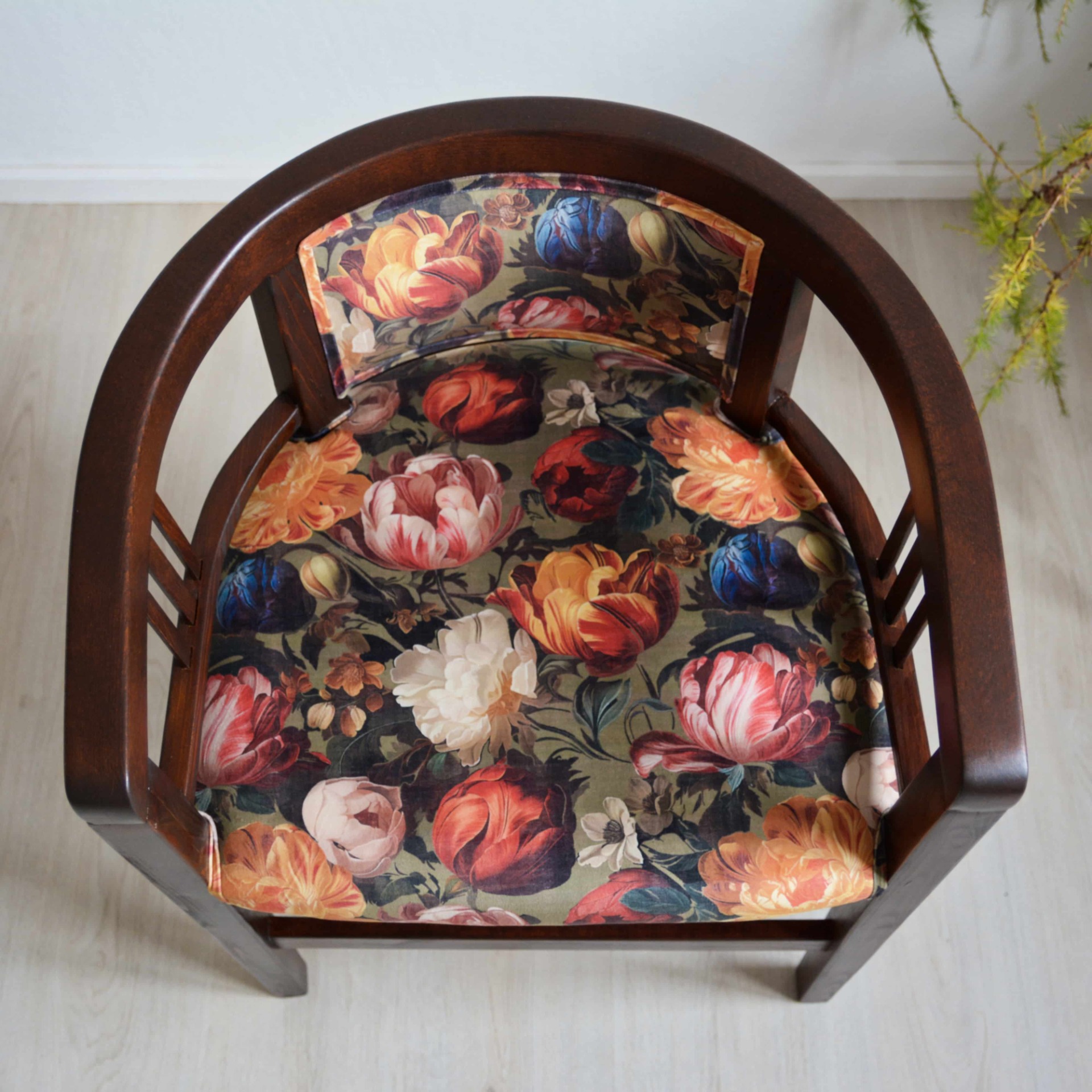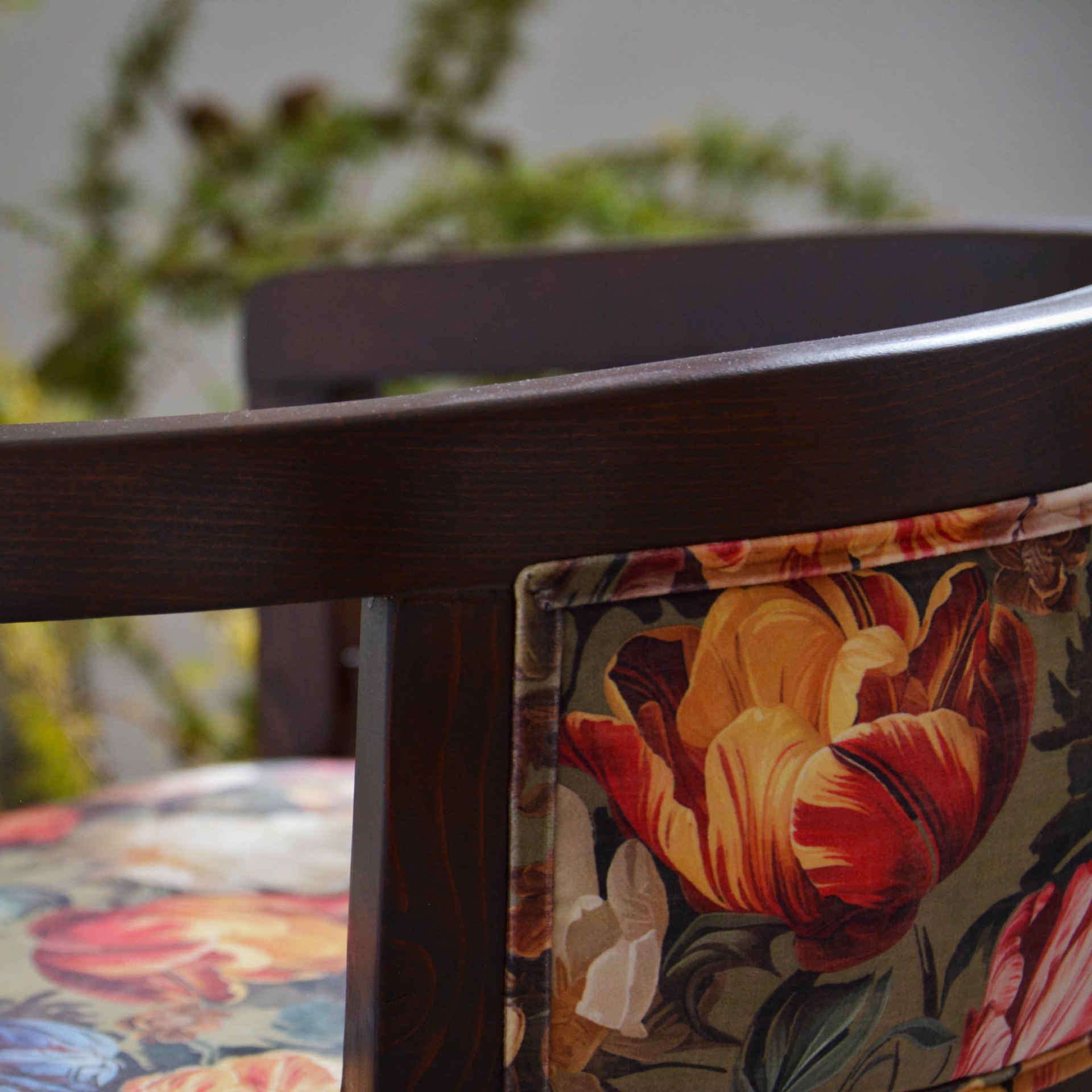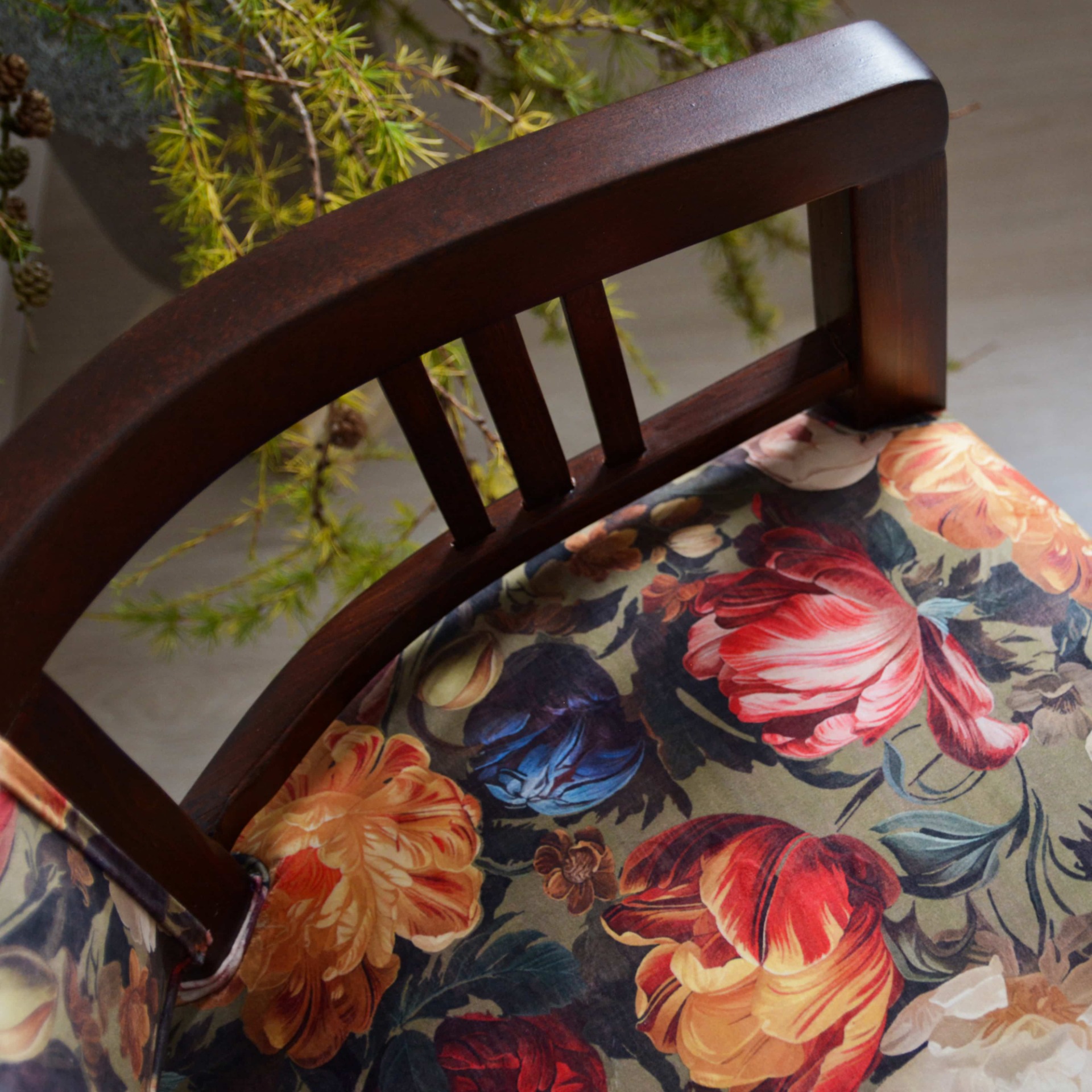 Čalounění je zcela nové. Vybrali jsme stylový čalounický samet s oku lahodícím výrazným vzorem. Bohatý motiv malovaných květů udělal z židle malé umělecké dílo.