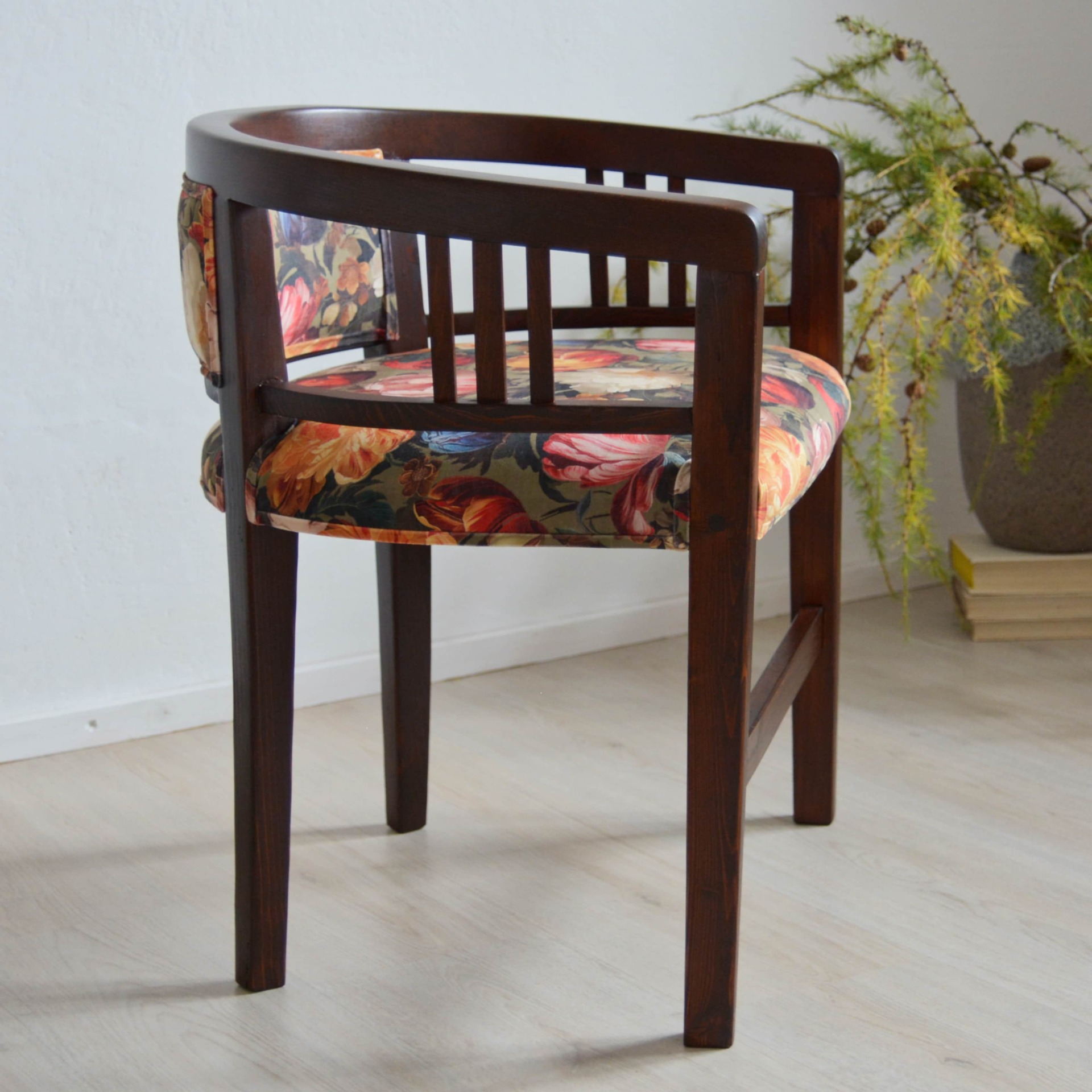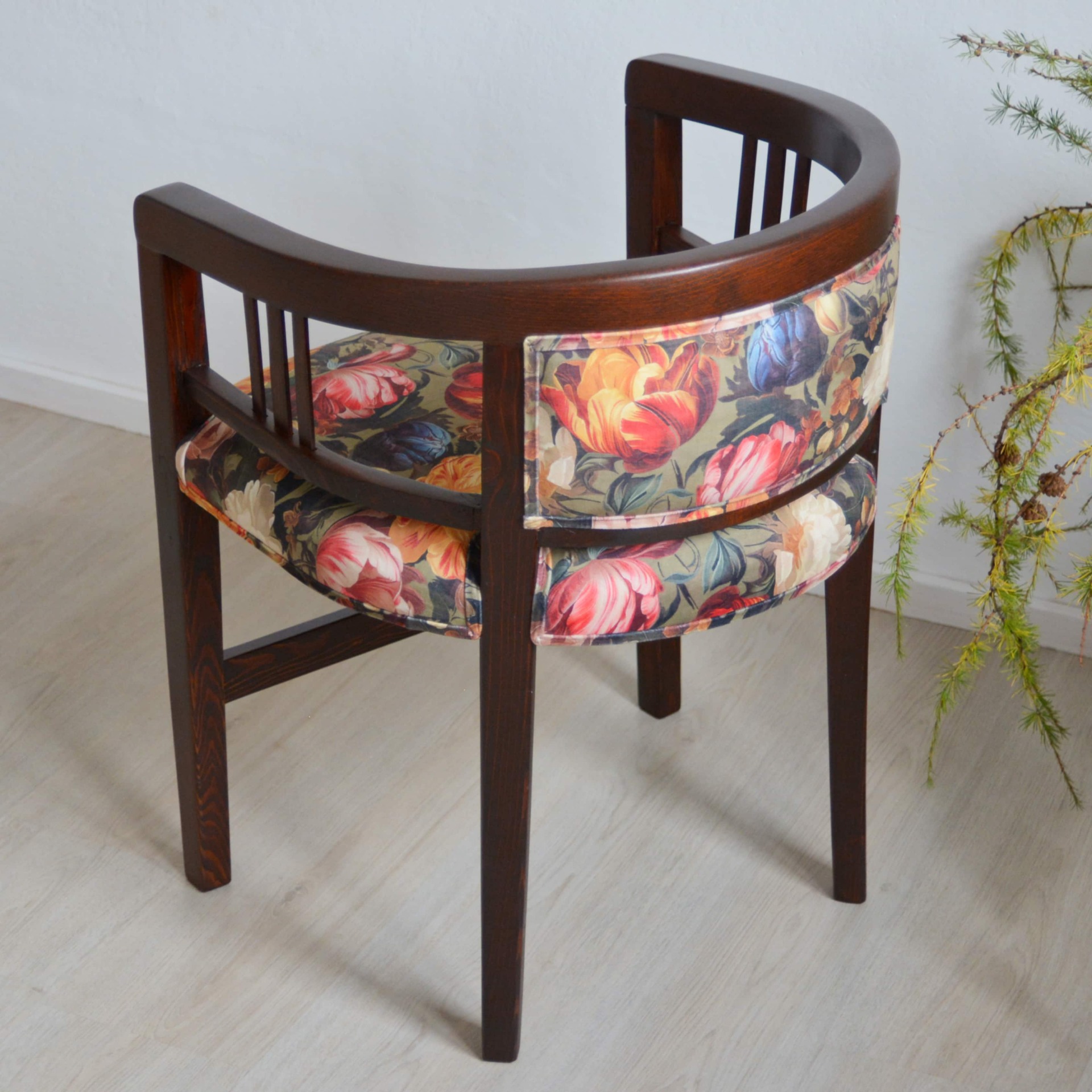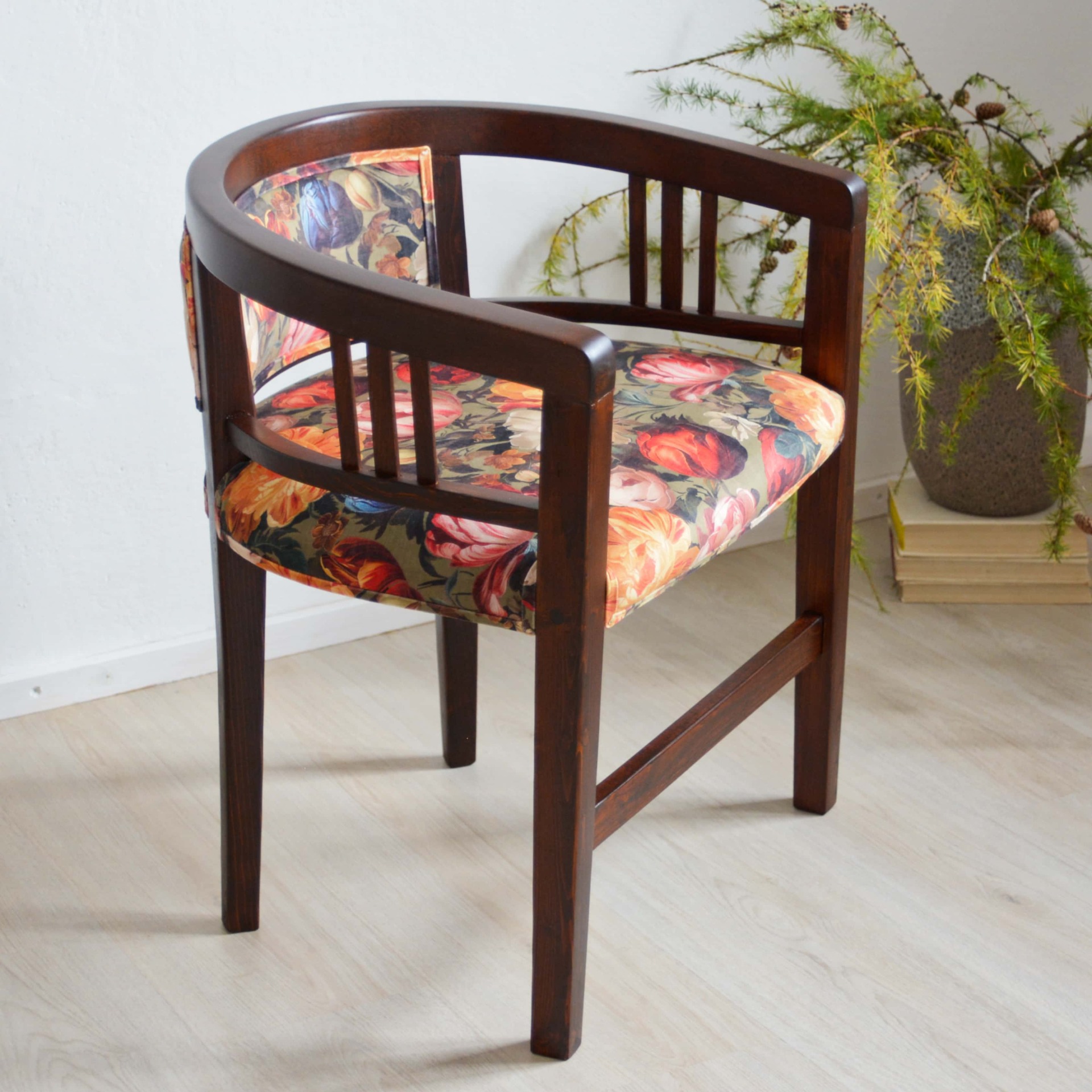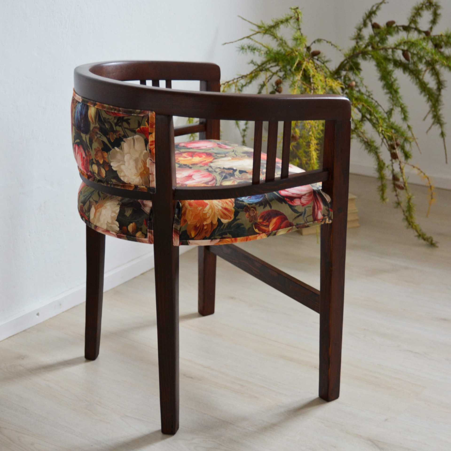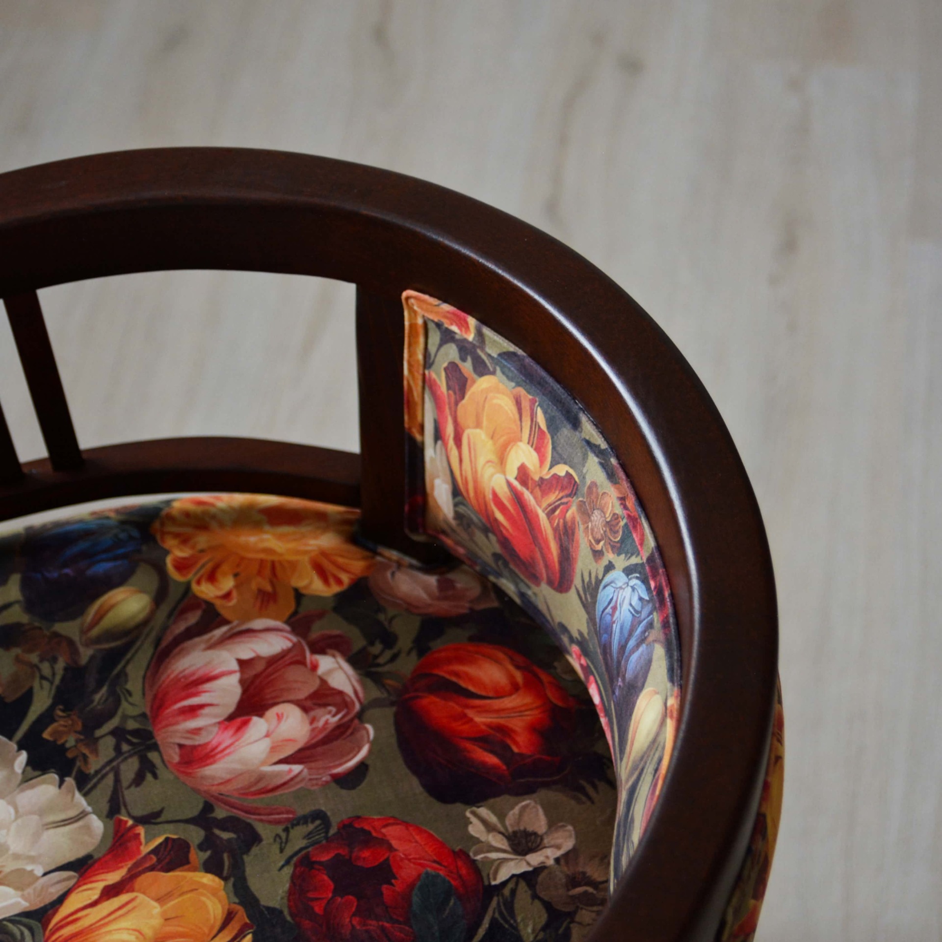 Čalounění je zcela nové. Vybrali jsme stylový čalounický samet s oku lahodícím výrazným vzorem. Bohatý motiv malovaných květů udělal z židle malé umělecké dílo.