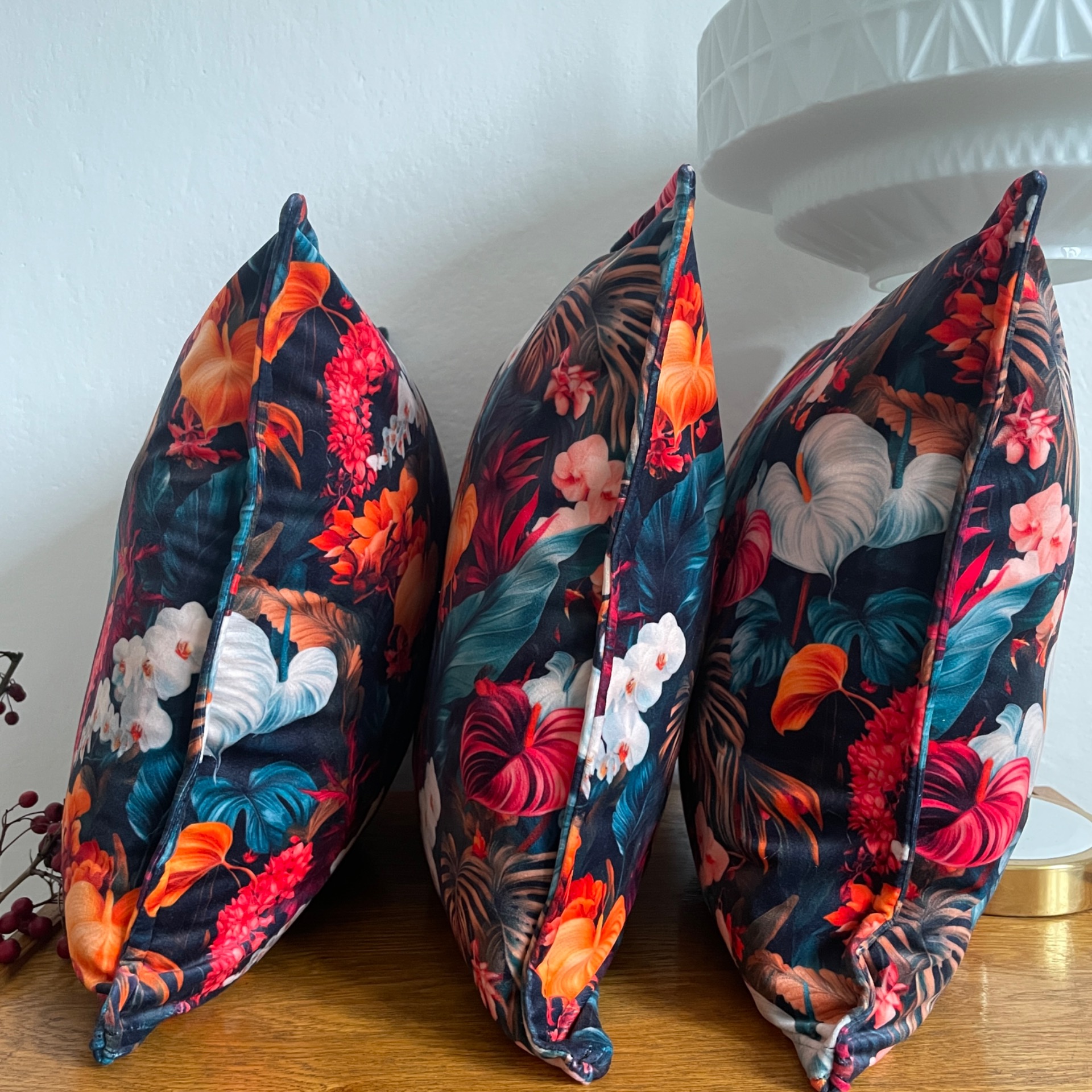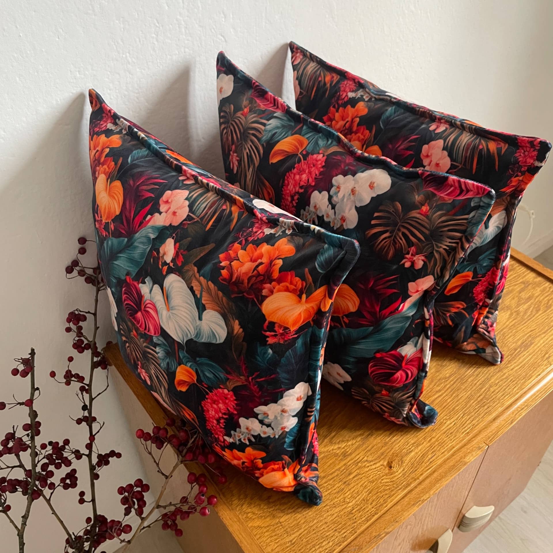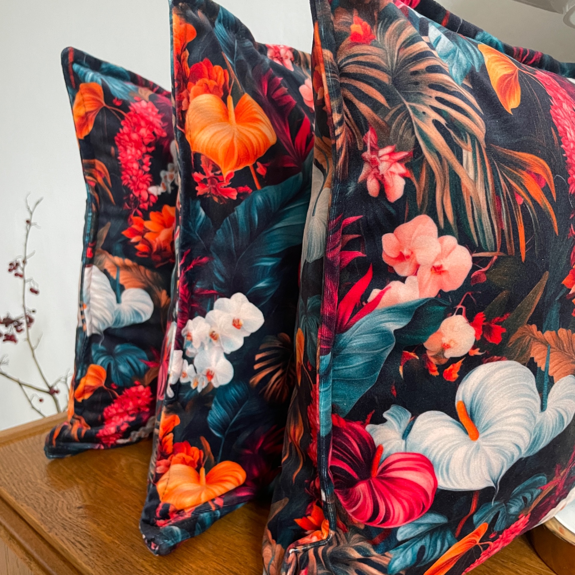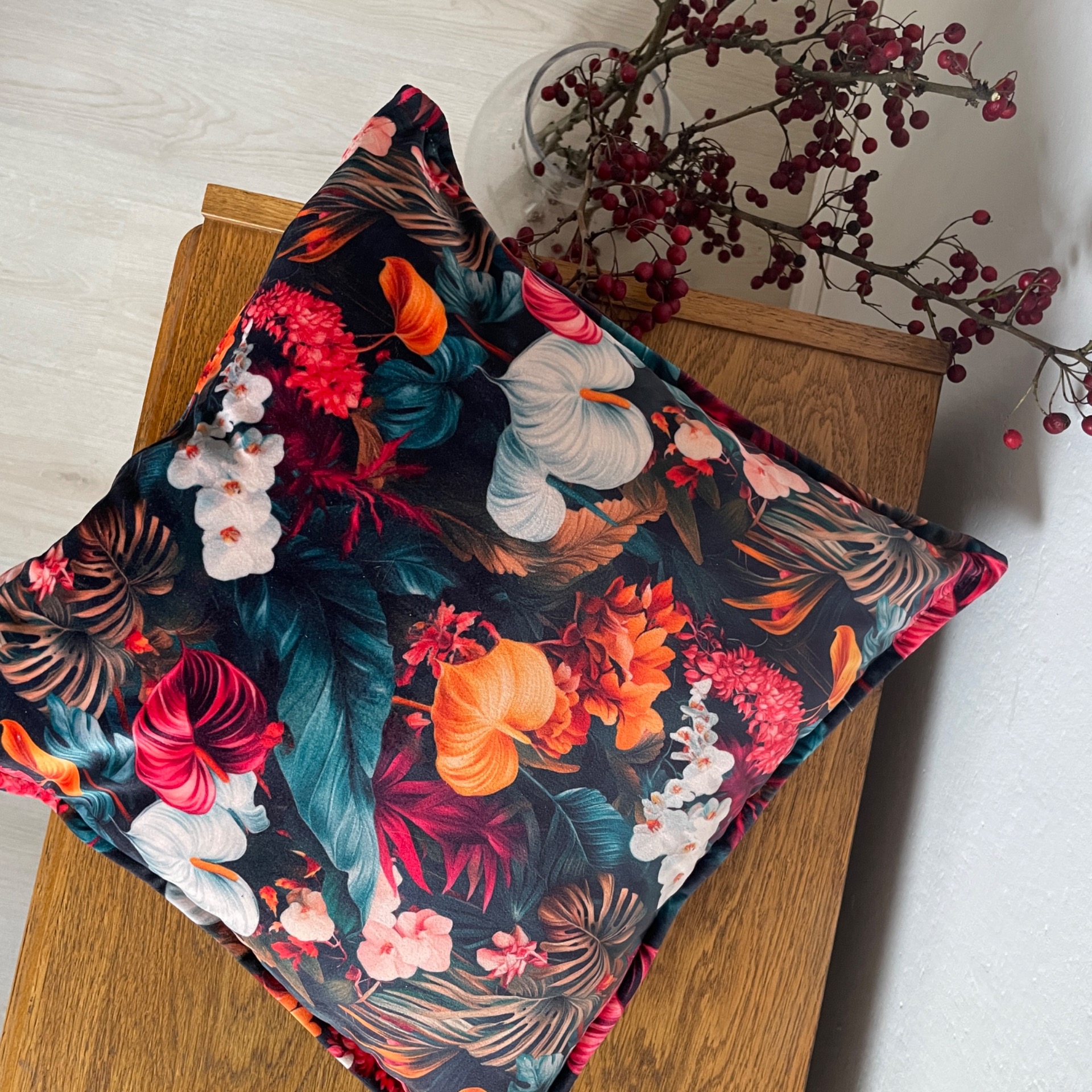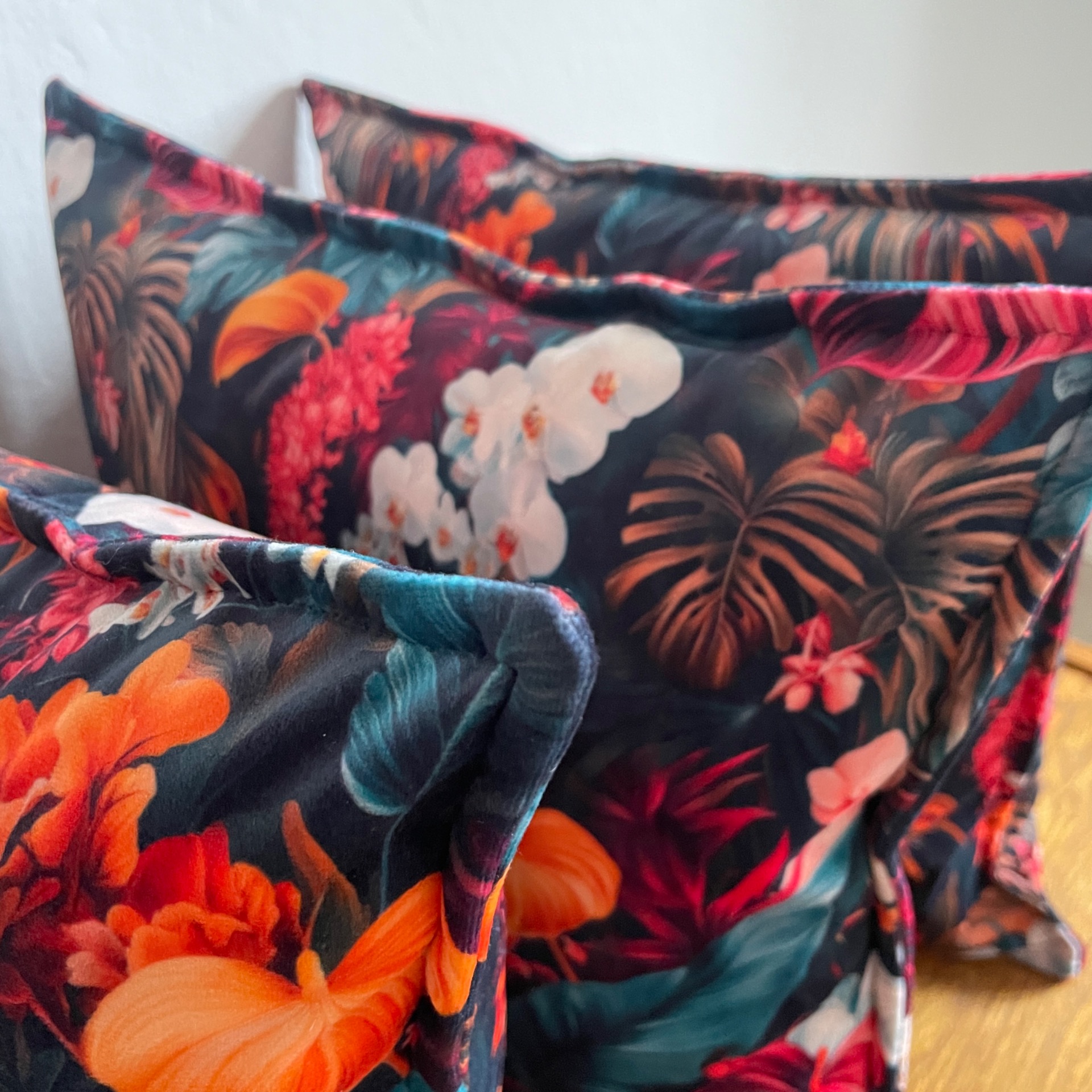 Měkký sametový materiál je ideální na designový čtvercový polštář. S oblíbeným přešívaným okrajem. Výrazný vzor velkých květů a kvítků. Krásné syté barevné akcenty v nejrůznějších odstínech.