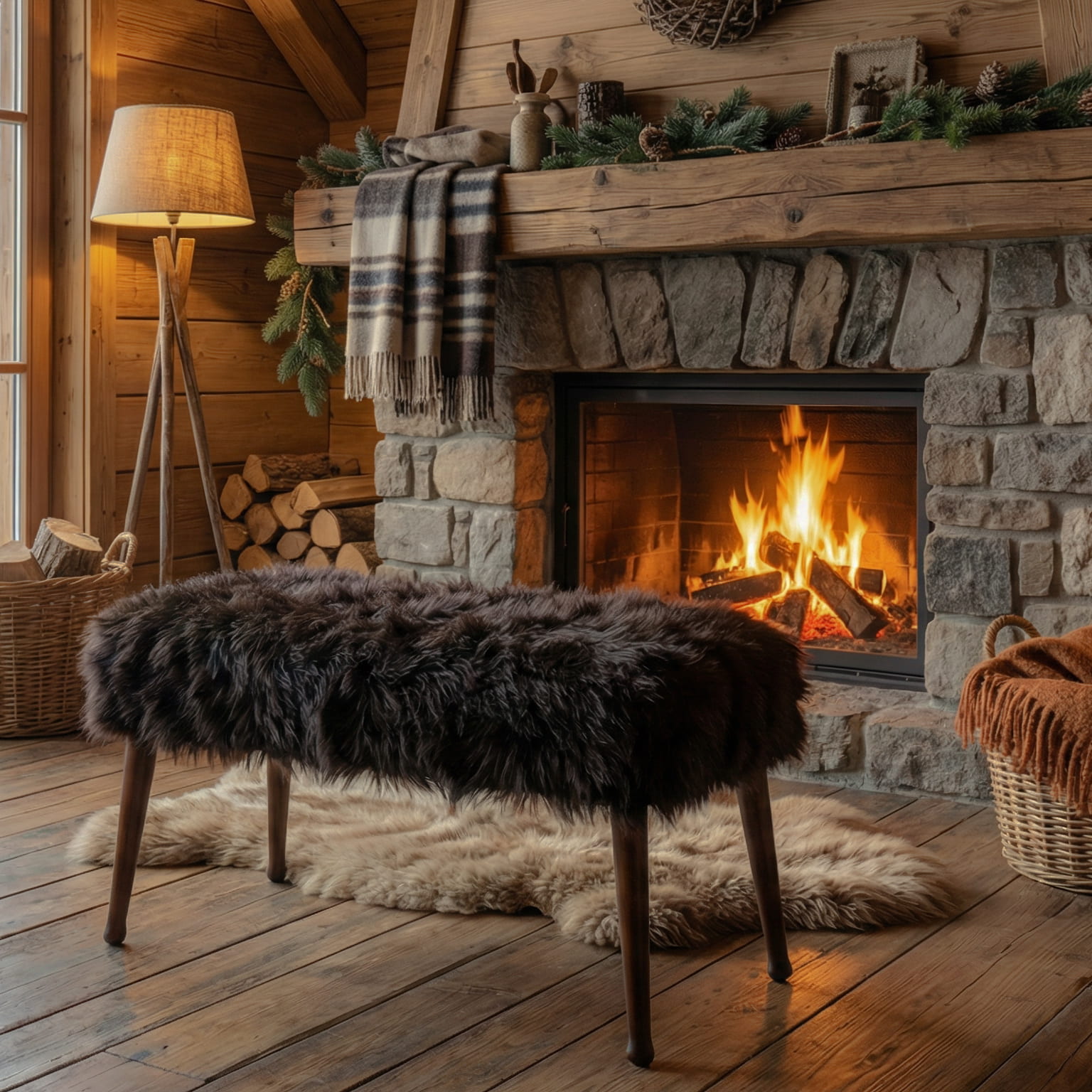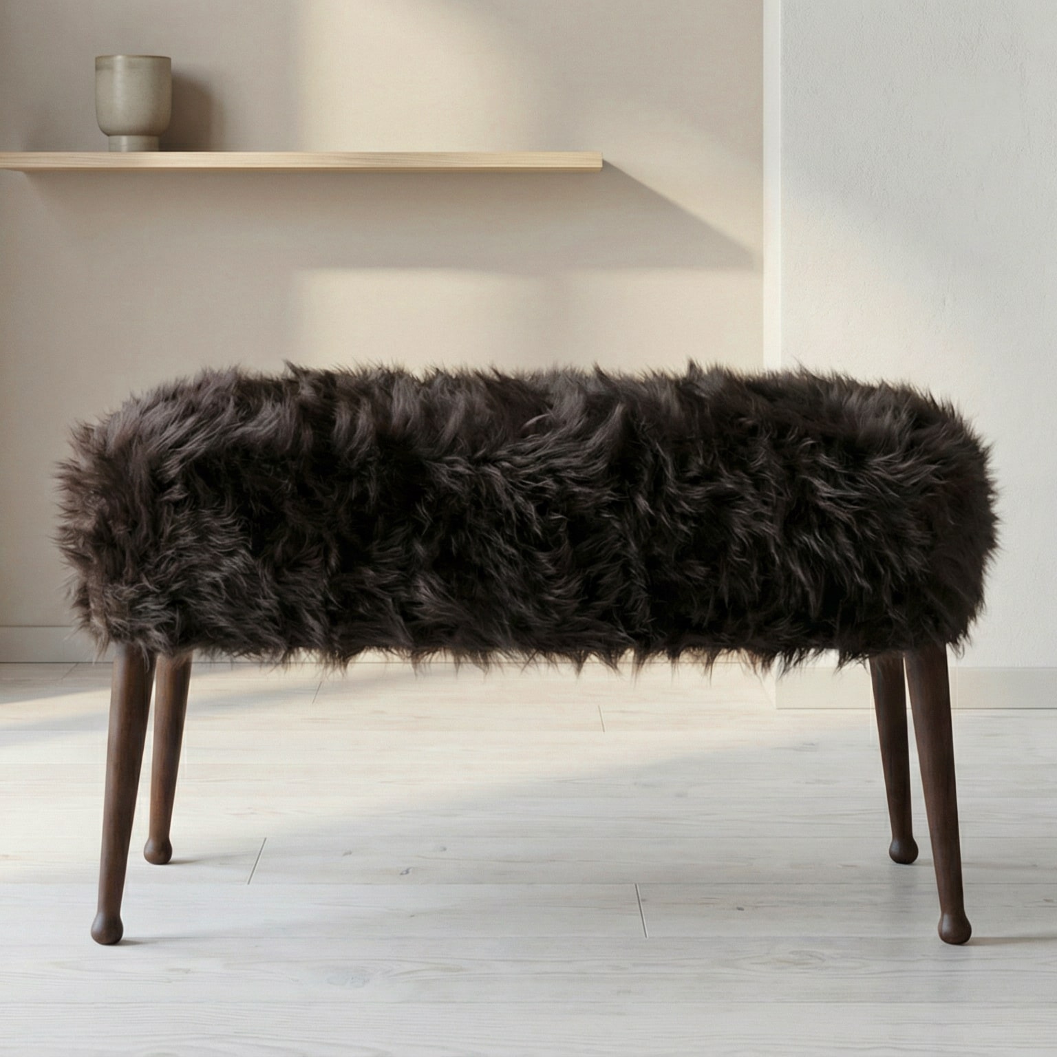 Chlupatý rozverný kus nábytku se čtyřmi kopýtky. Tvarově minimalistická a praktická lavice. Huňatá látka s dlouhým chlupem je v tmavě hnědé a doplňuje ořechový odstín dřeva.