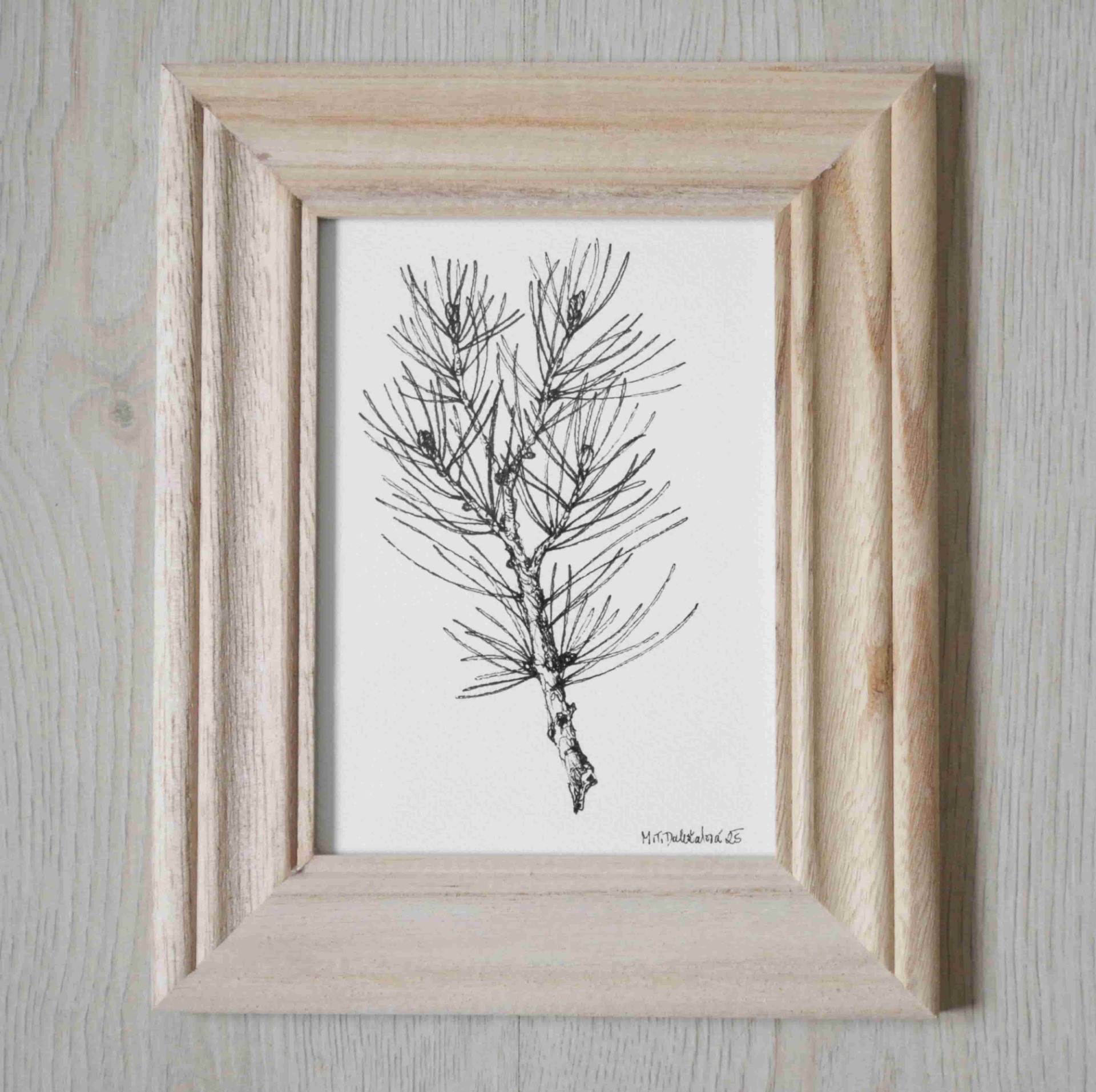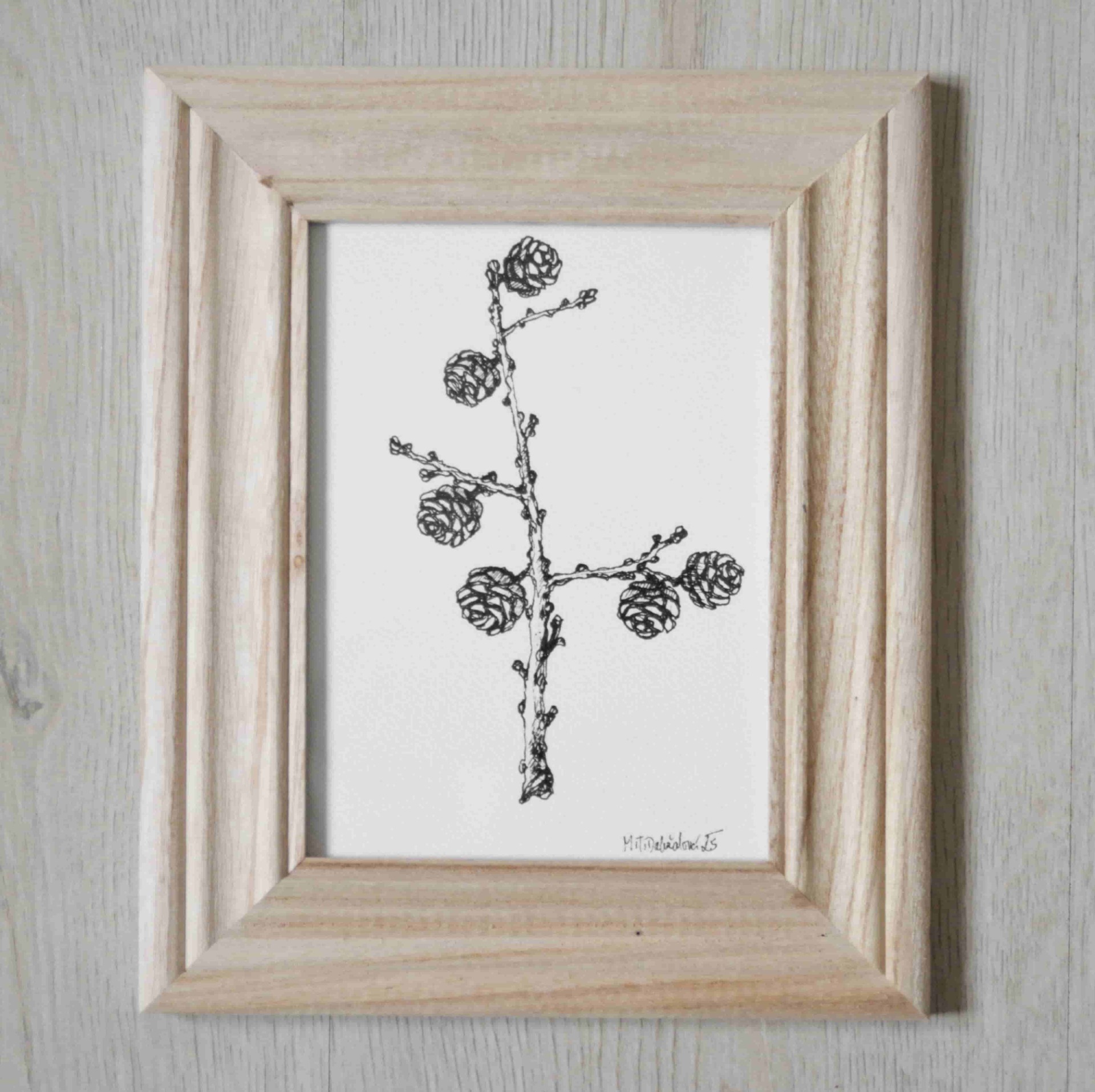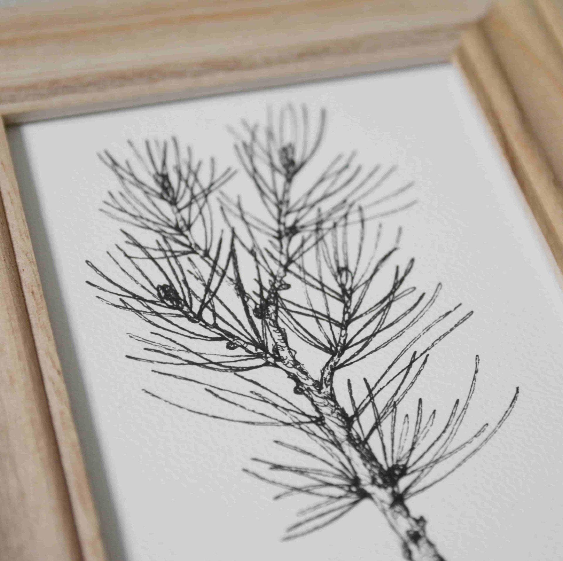 Jemná detailní studie větviček modřínu, borovice a šišek. Pro milovníky milých přírodních námětů. Skvěle vypadají všechny čtyři vedle sebe na zdi.