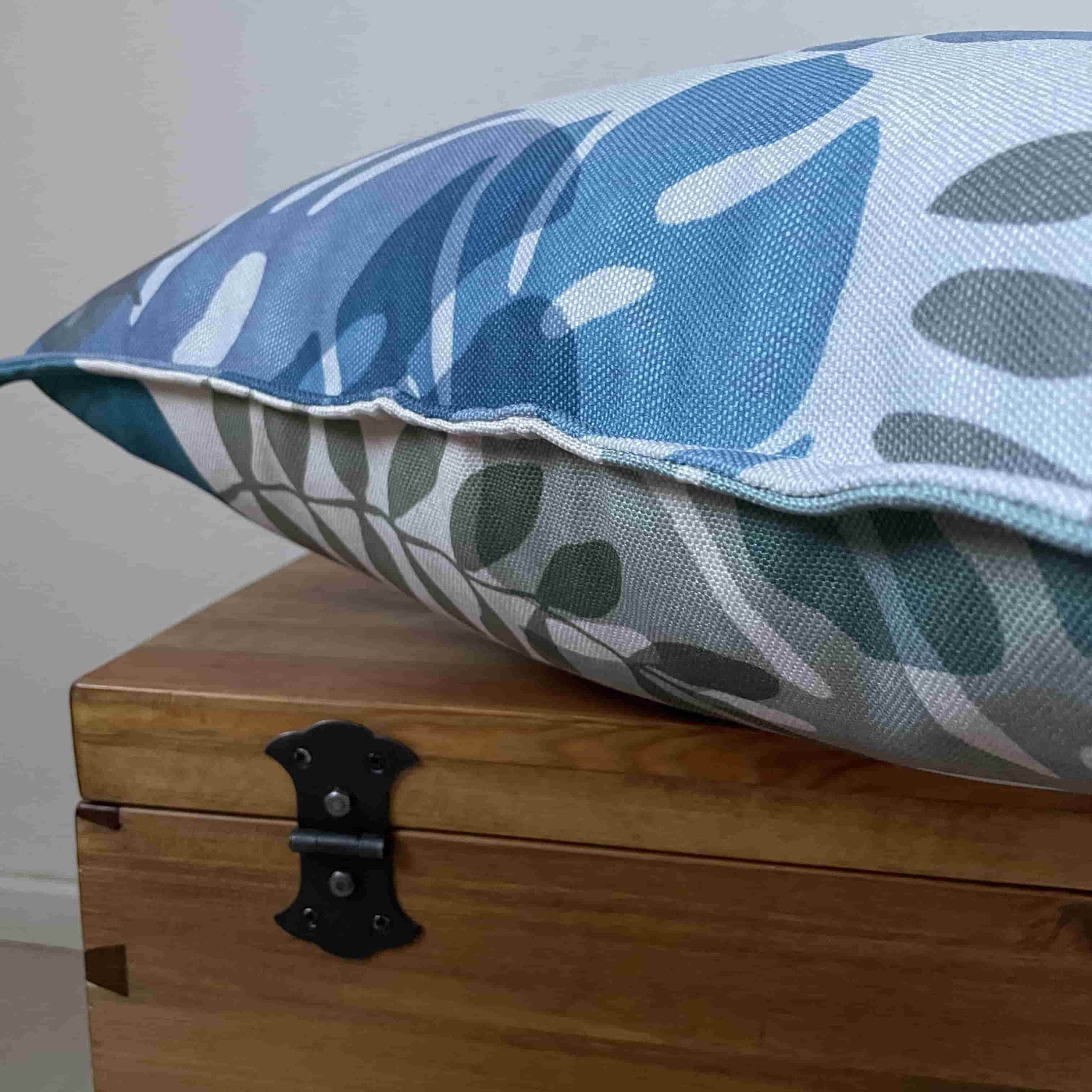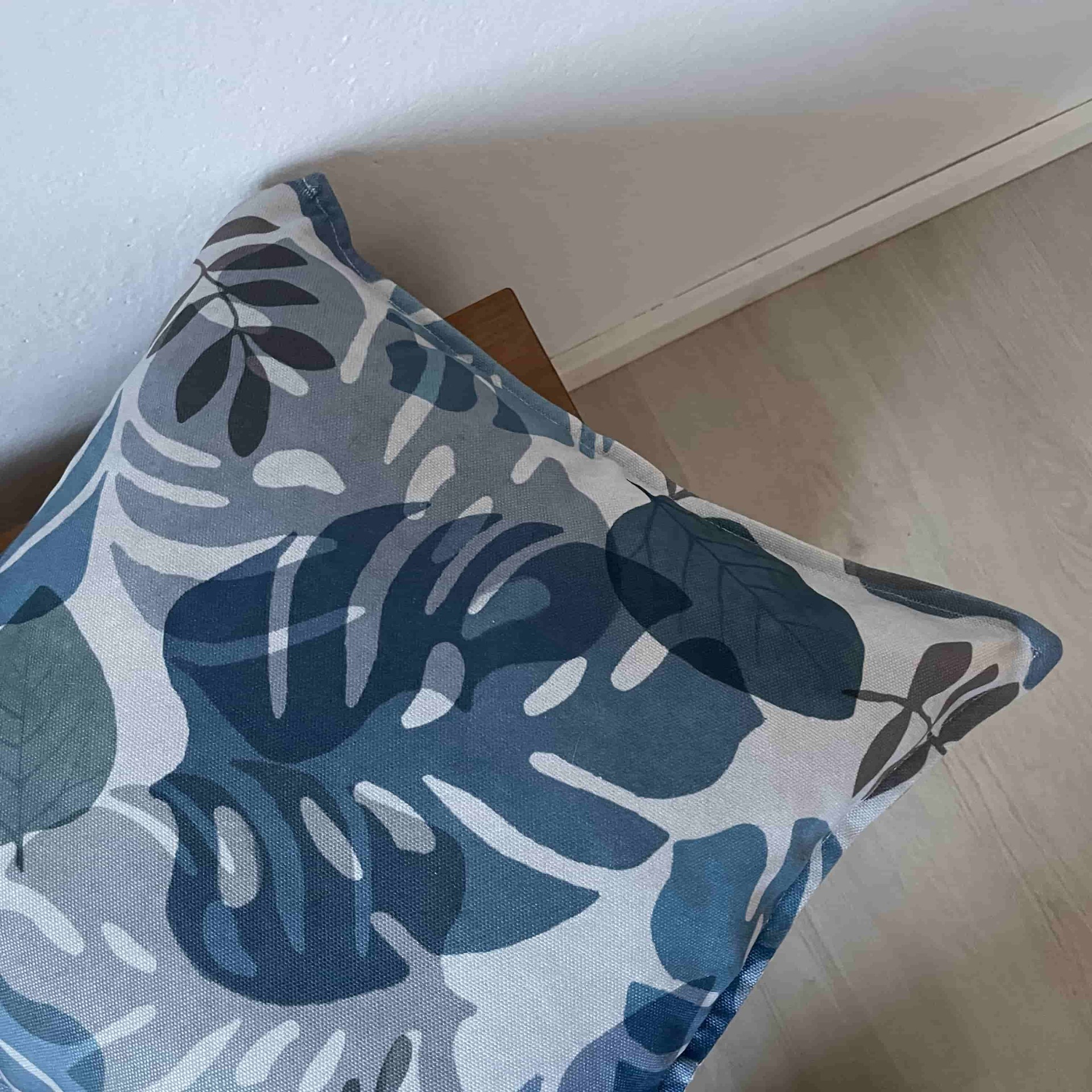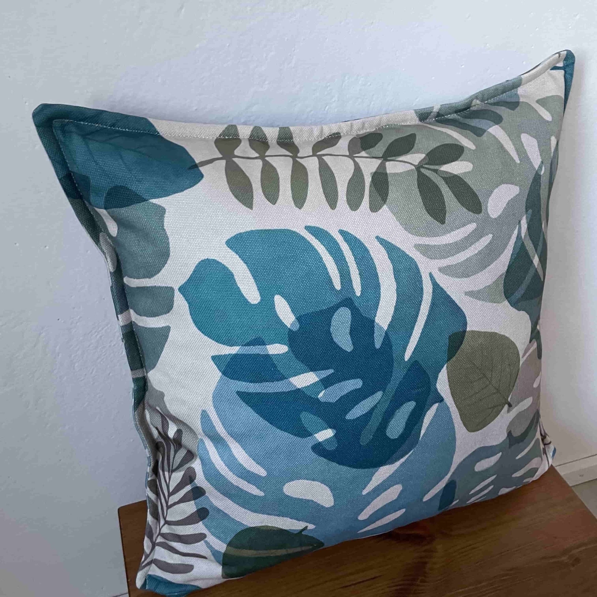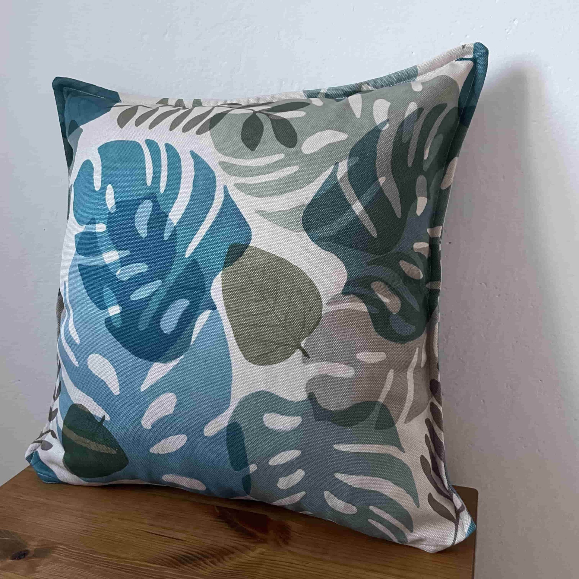 Měkký bavlněný potah na čtvercový polštář s přešívaným okrajem. Výrazný vzor velkých listů monstery. Krásné modré akcenty v nejrůznějších odstínech.