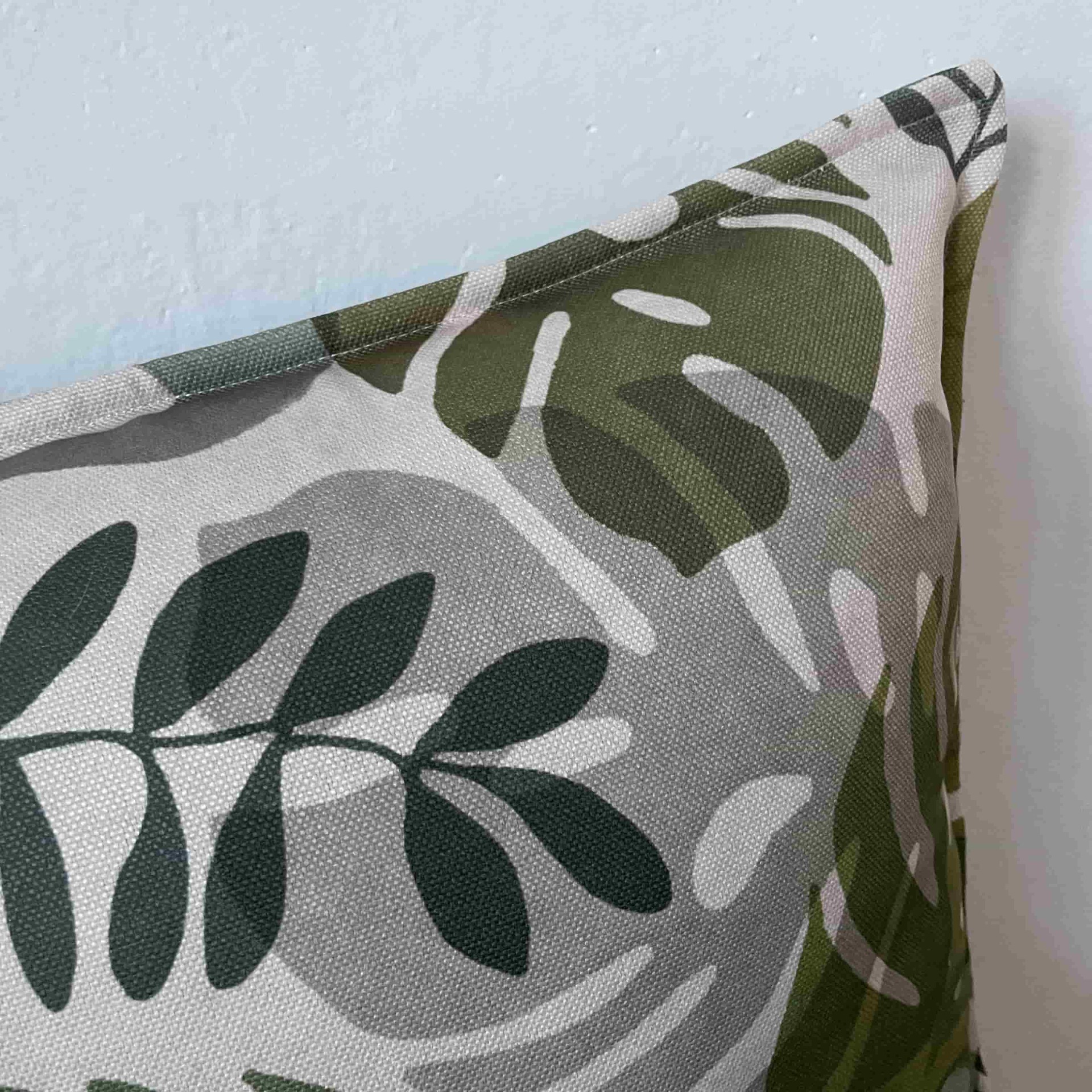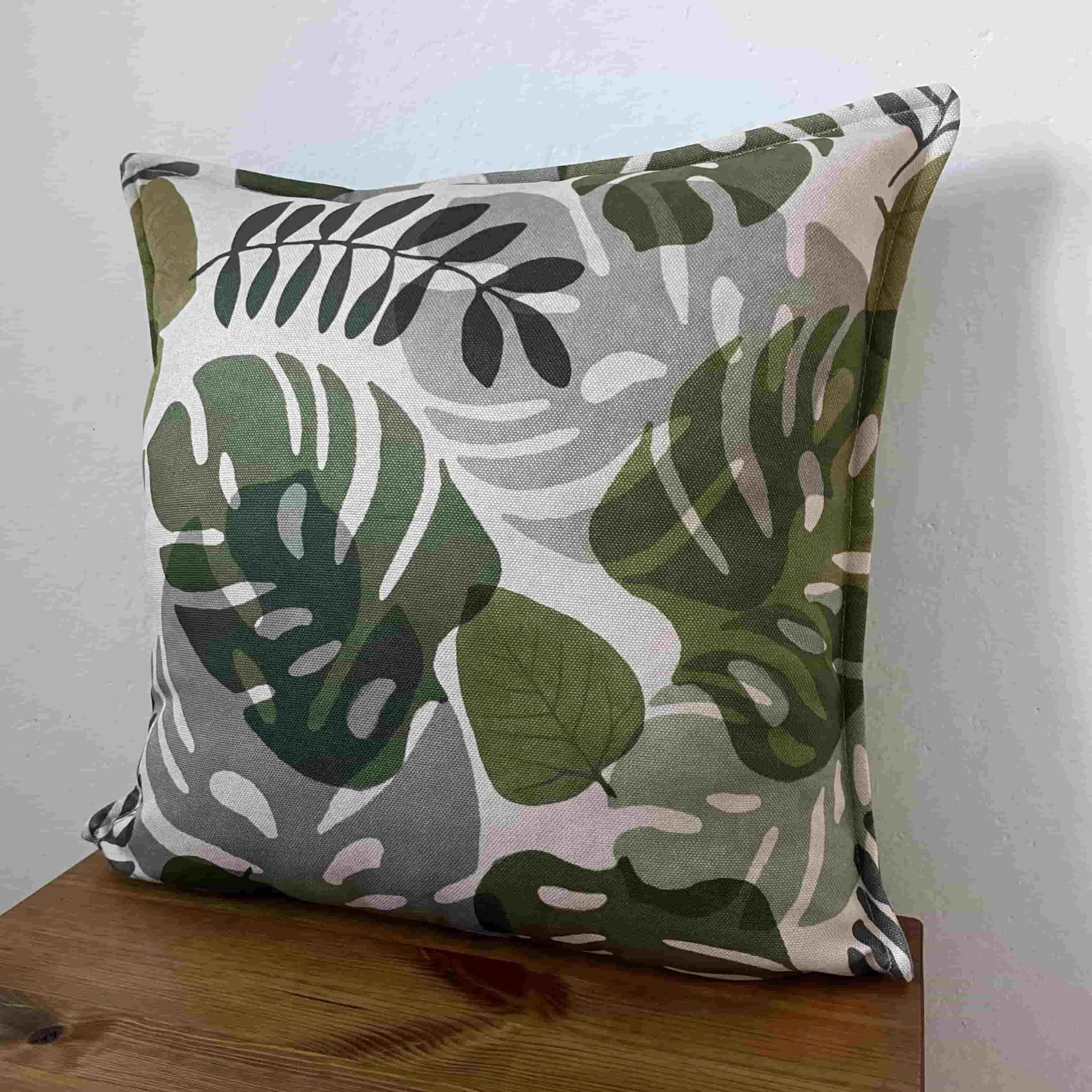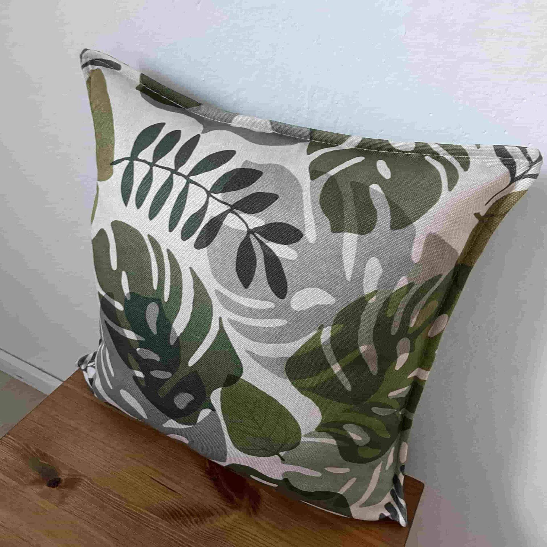 Měkký bavlněný potah na čtvercový polštář s přešívaným okrajem. Výrazný vzor velkých listů monstery. Krásné zelené akcenty v nejrůznějších odstínech.