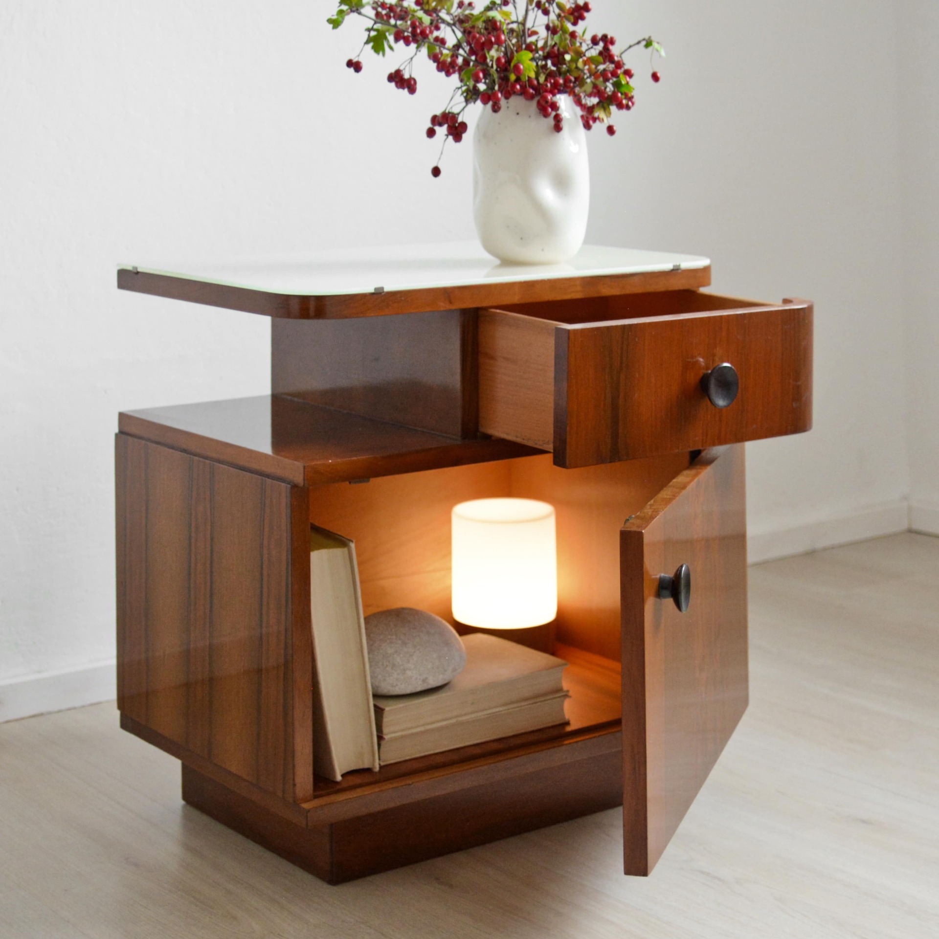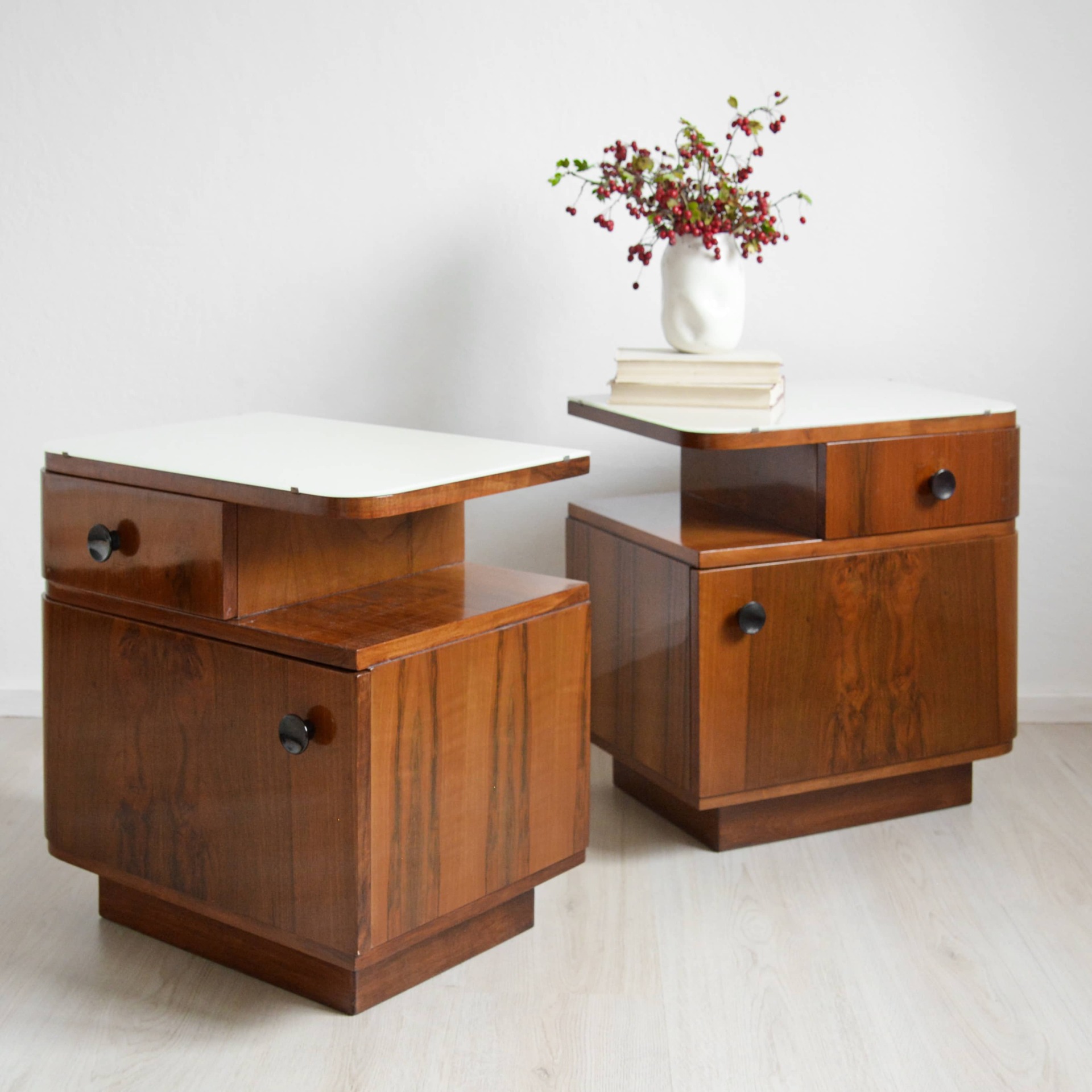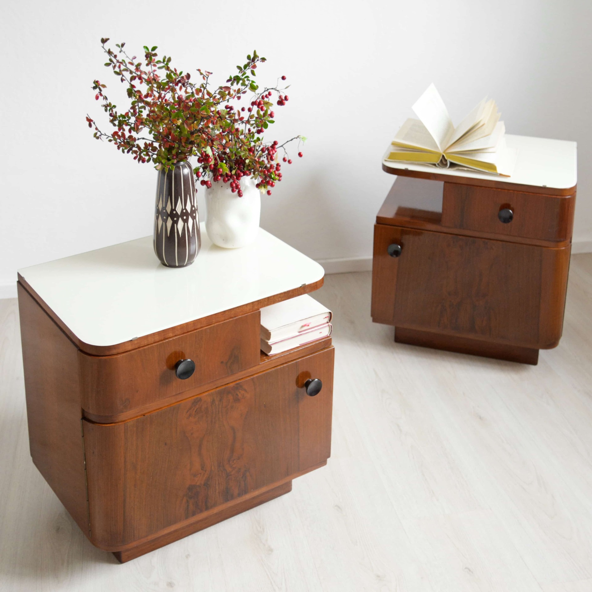Dýhované noční stolky z 50. let po kompletním oživení. Tyto kousky vynikají výraznou krásně prokreslenou ořechovou dýhou. Měli jsme s nimi spoustu práce, ale výsledkem jsou elegantní kousky, které stylově doplní vaši ložnici.