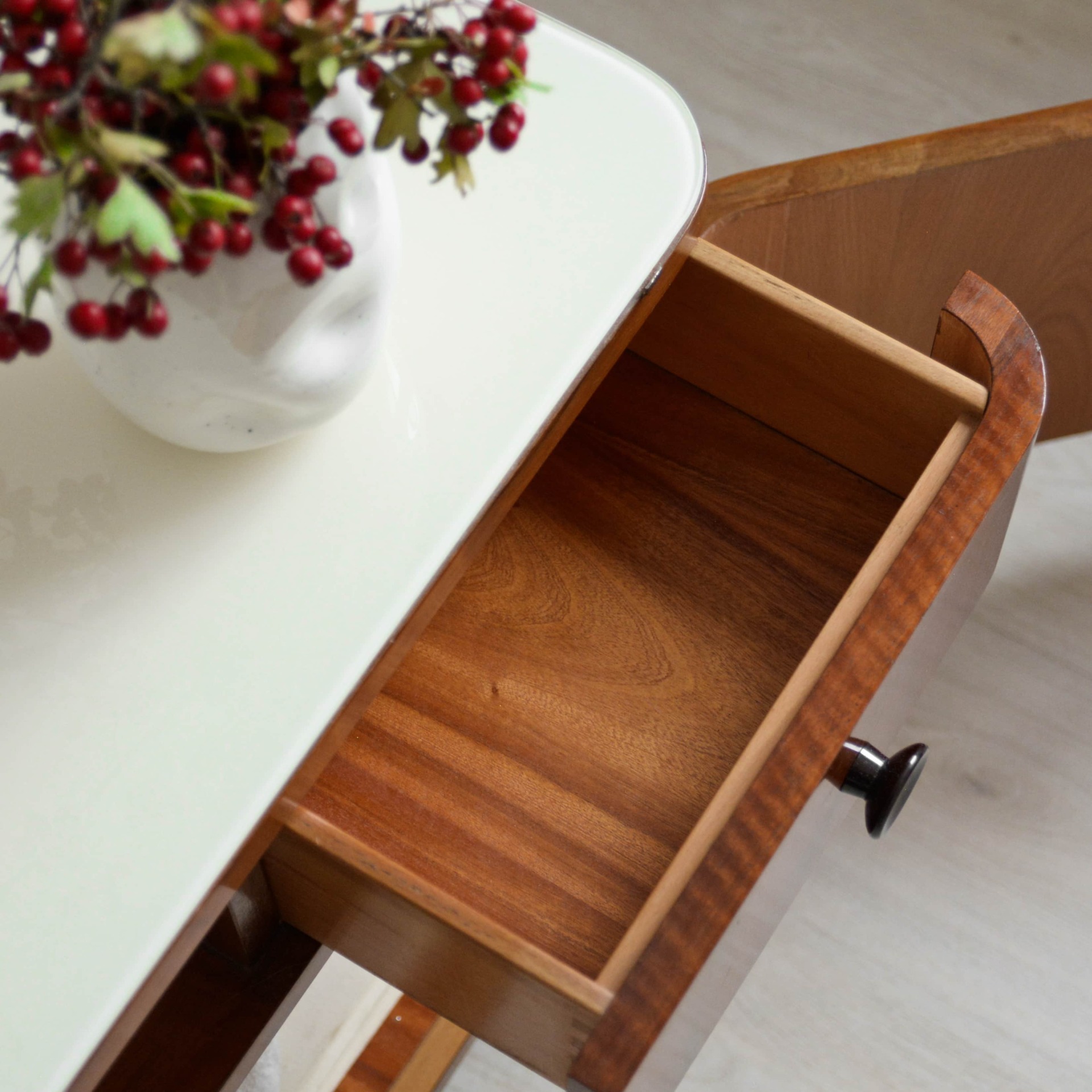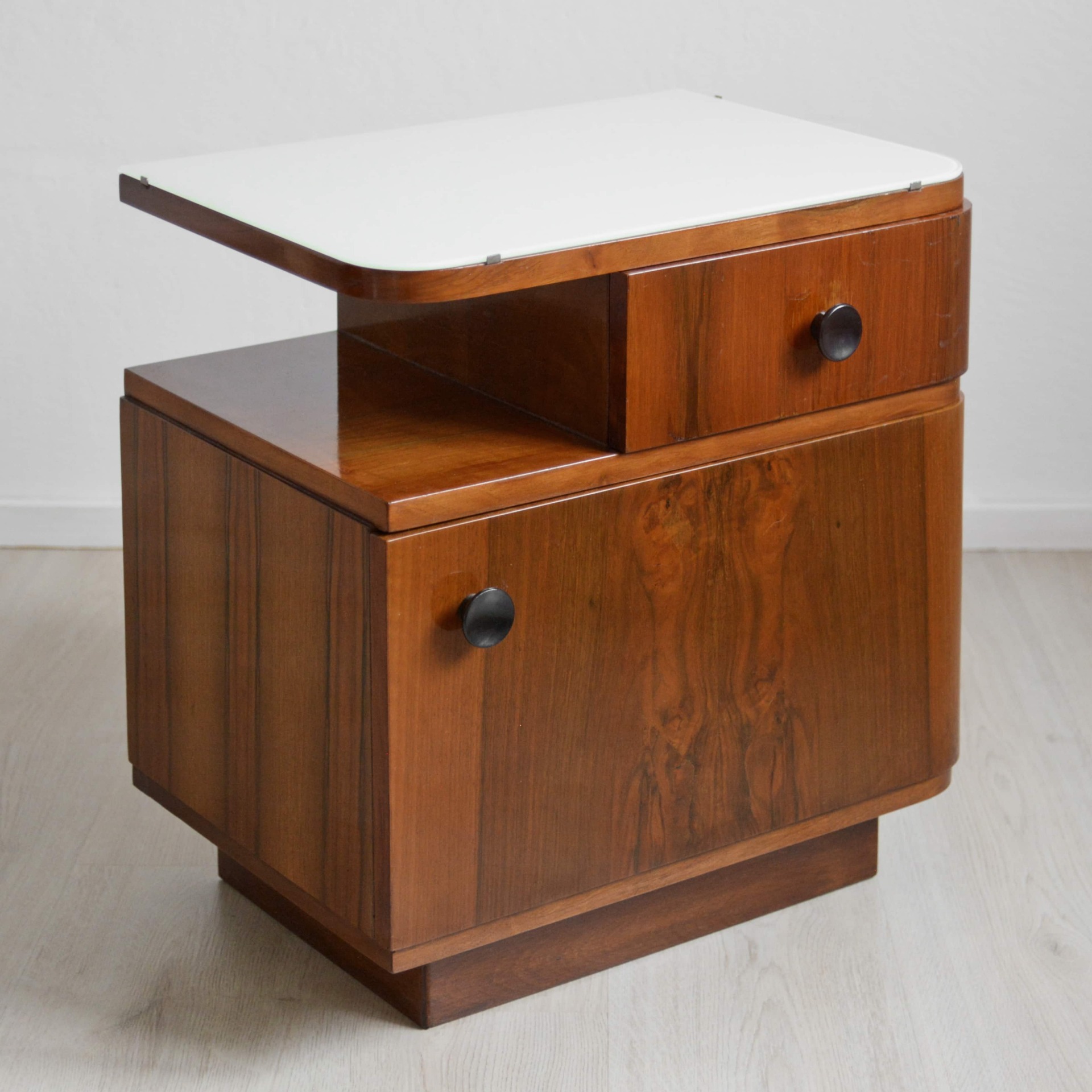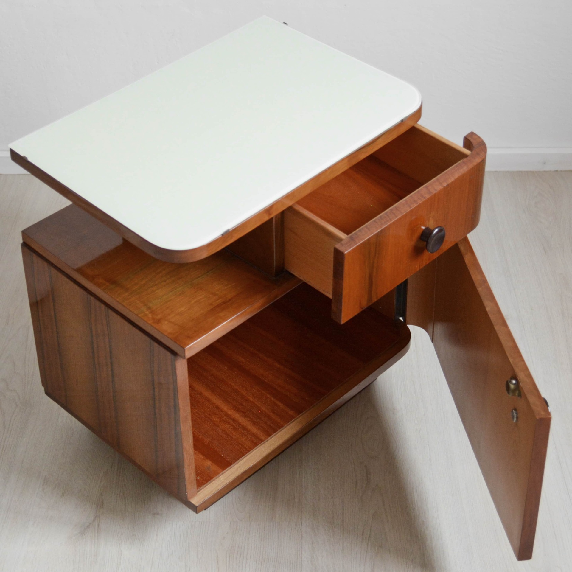 Dýhované noční stolky z 50. let po kompletním oživení. Tyto kousky vynikají výraznou krásně prokreslenou ořechovou dýhou. Měli jsme s nimi spoustu práce, ale výsledkem jsou elegantní kousky, které stylově doplní vaši ložnici.