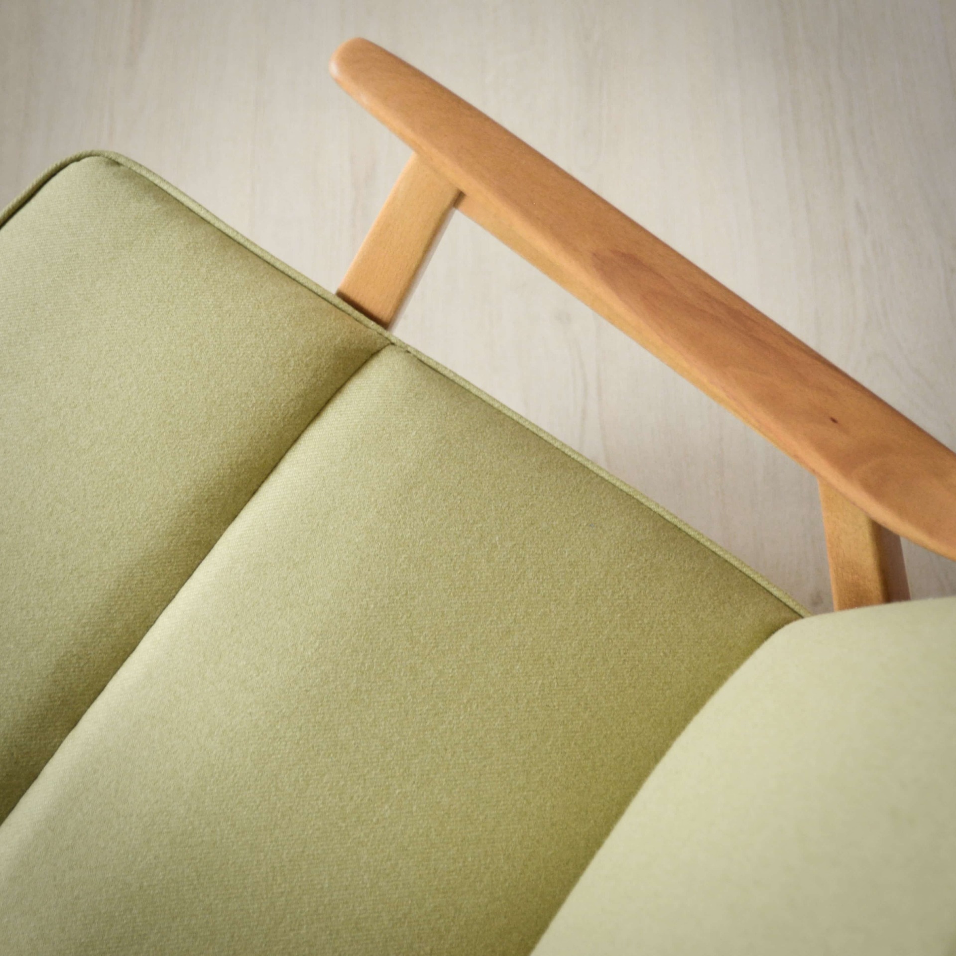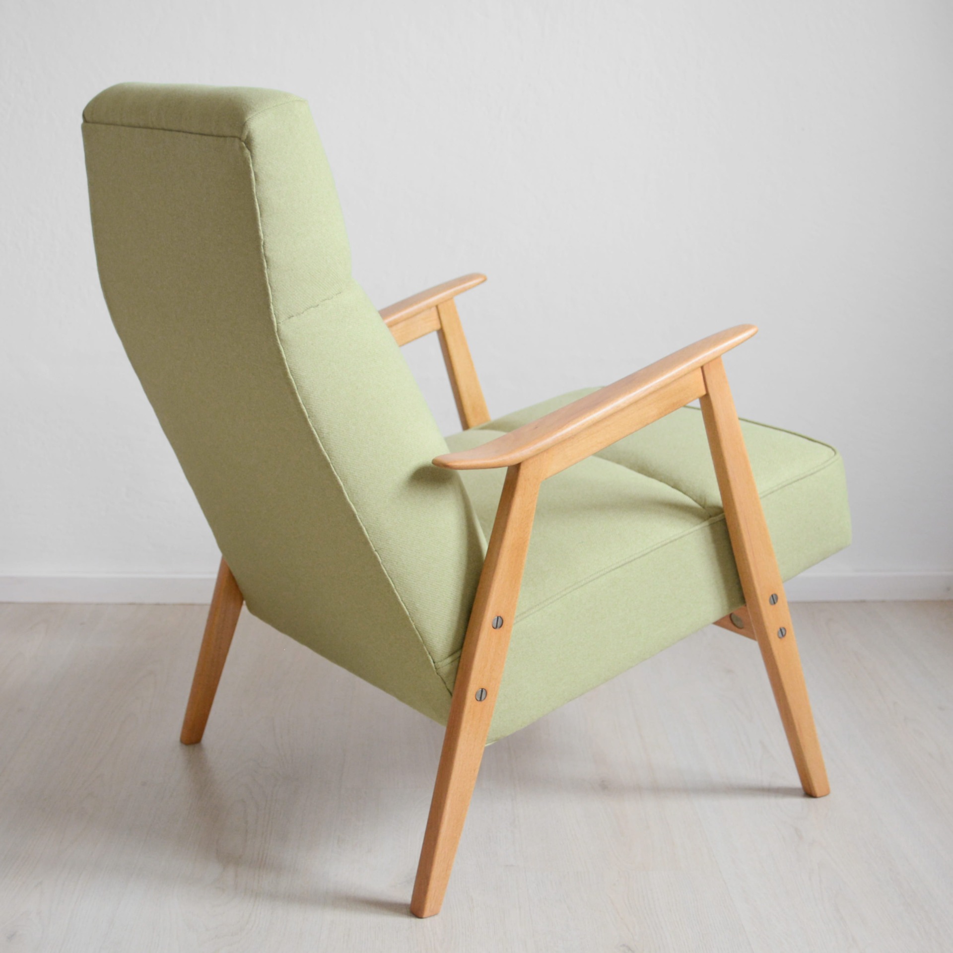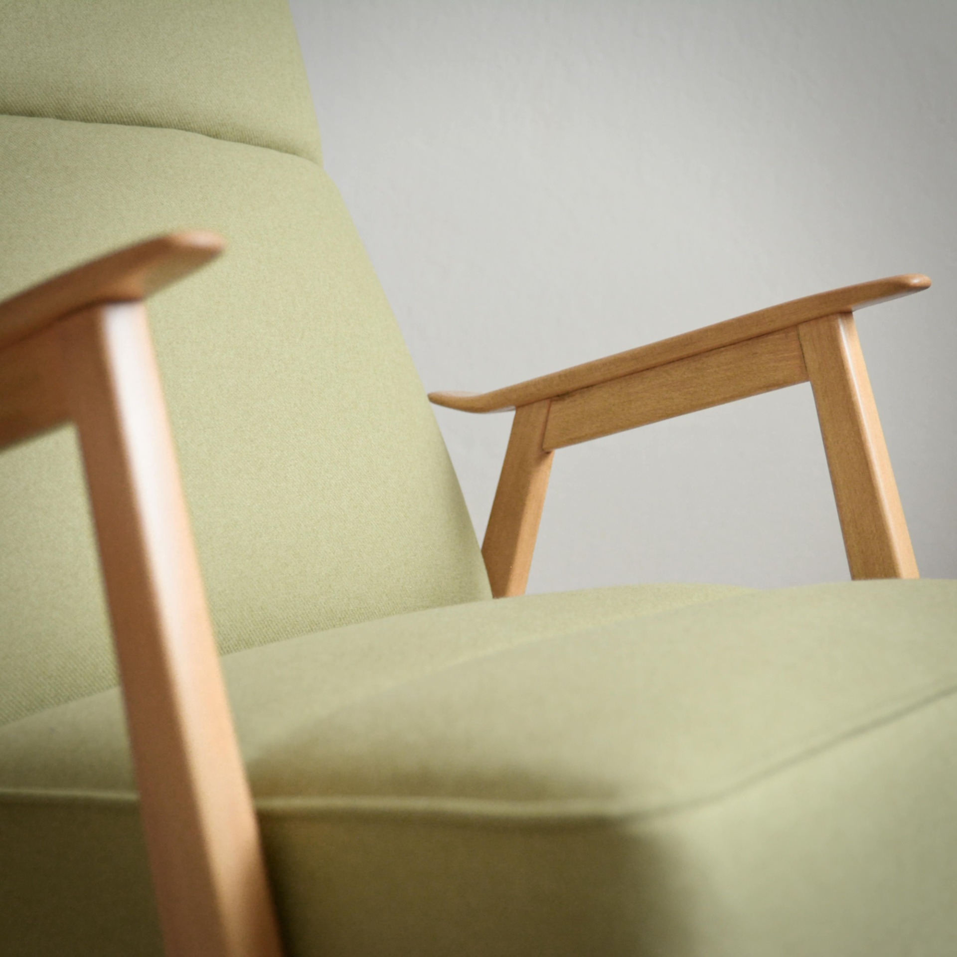 Krásné jemné křeslo s tvarovaným čalouněním v pastelové zelené barvě. Konstrukce je z bukového tvrdého dřeva.