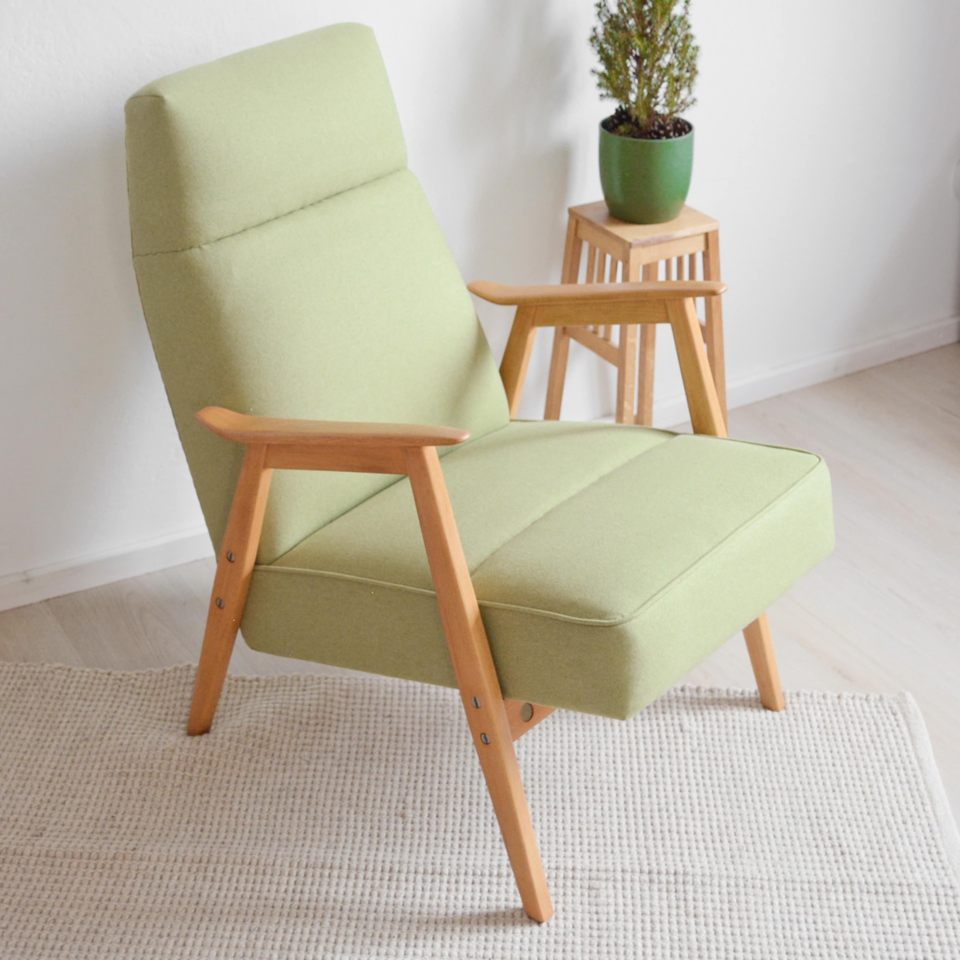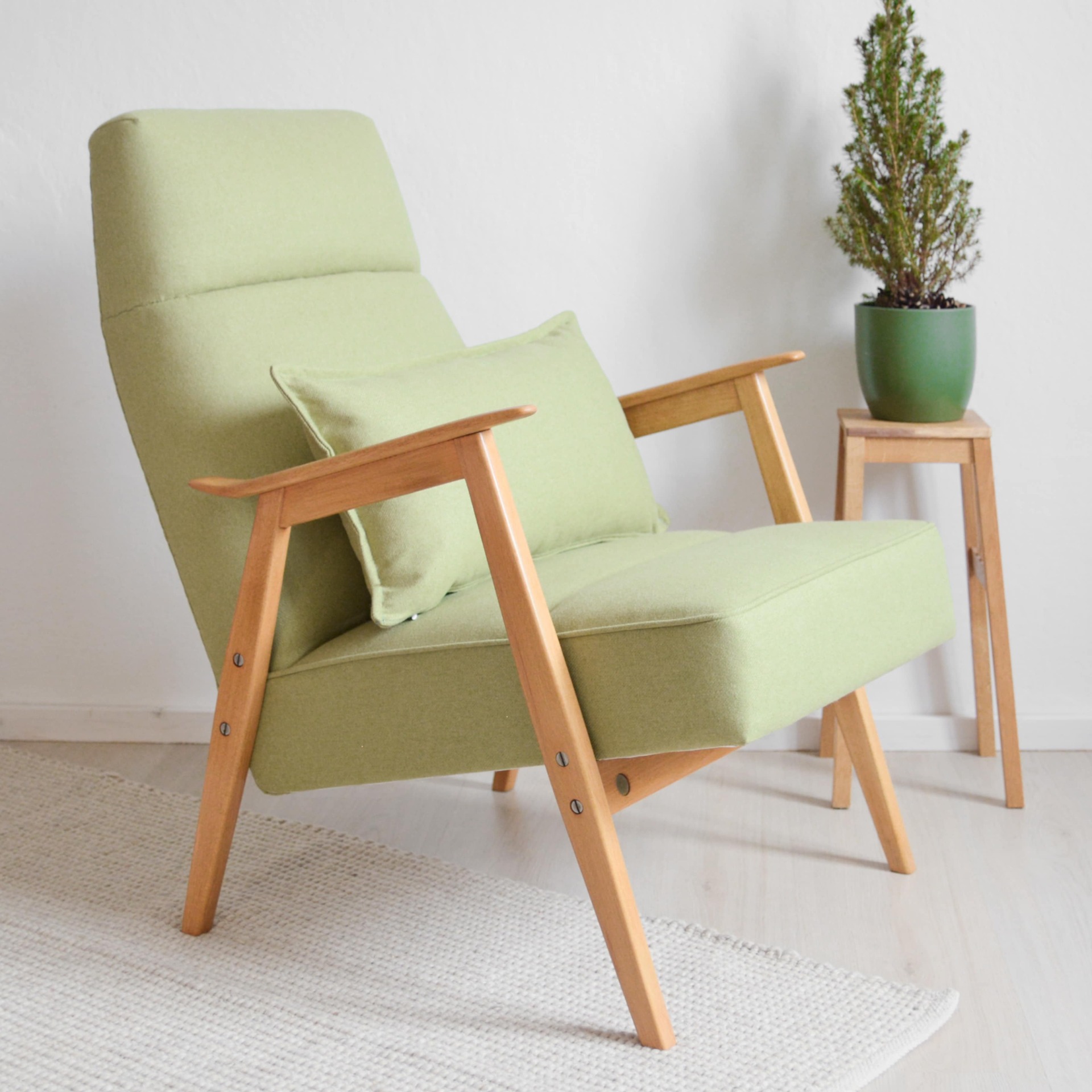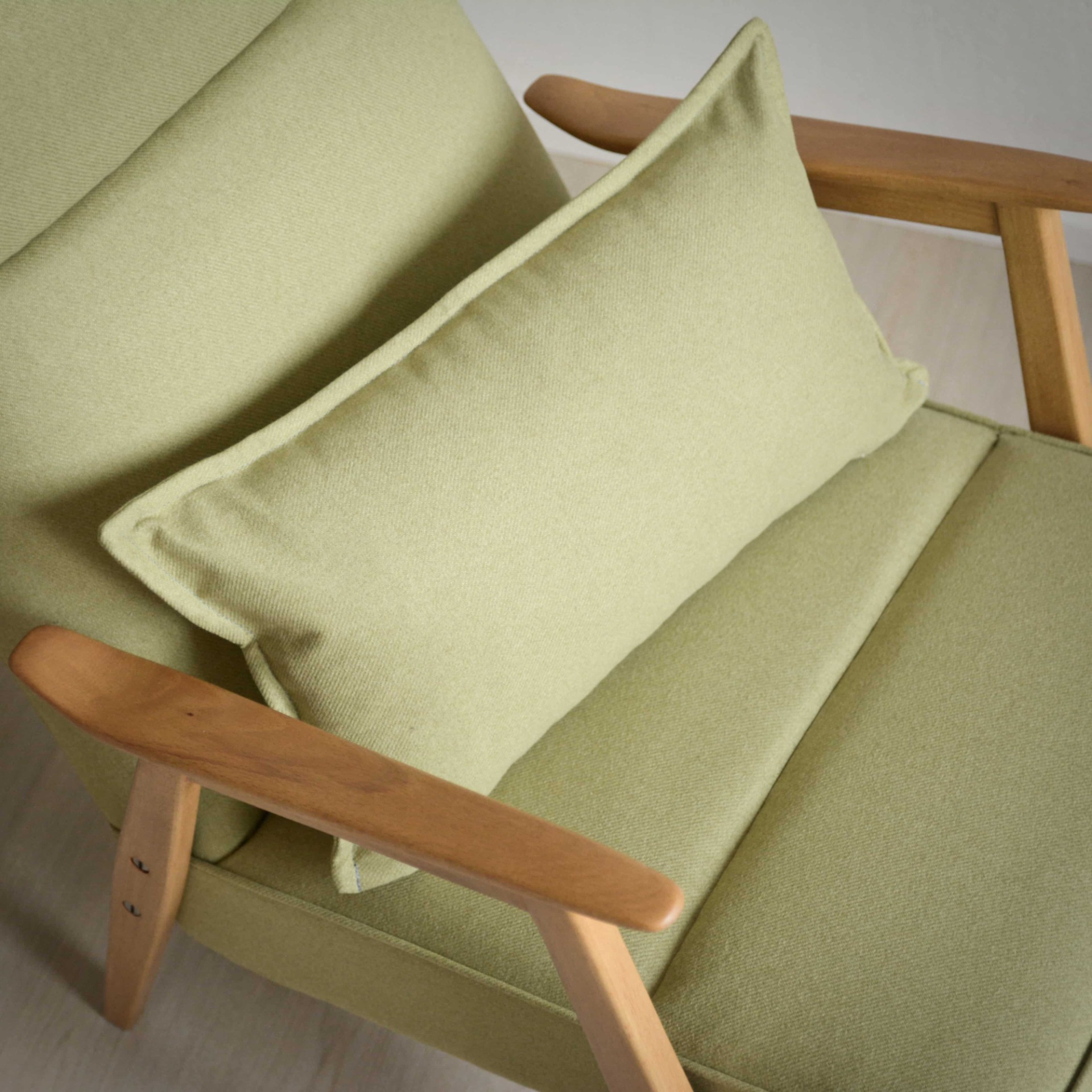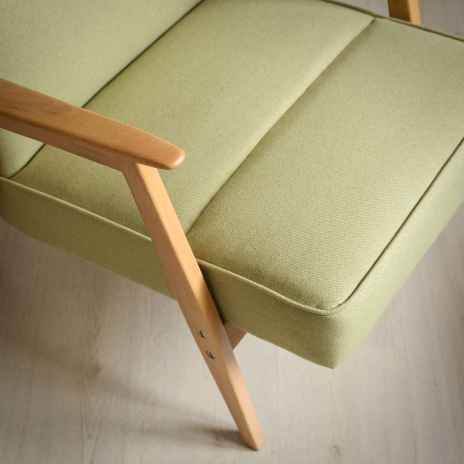 Krásné jemné křeslo s tvarovaným čalouněním v pastelové zelené barvě. Konstrukce je z bukového tvrdého dřeva.