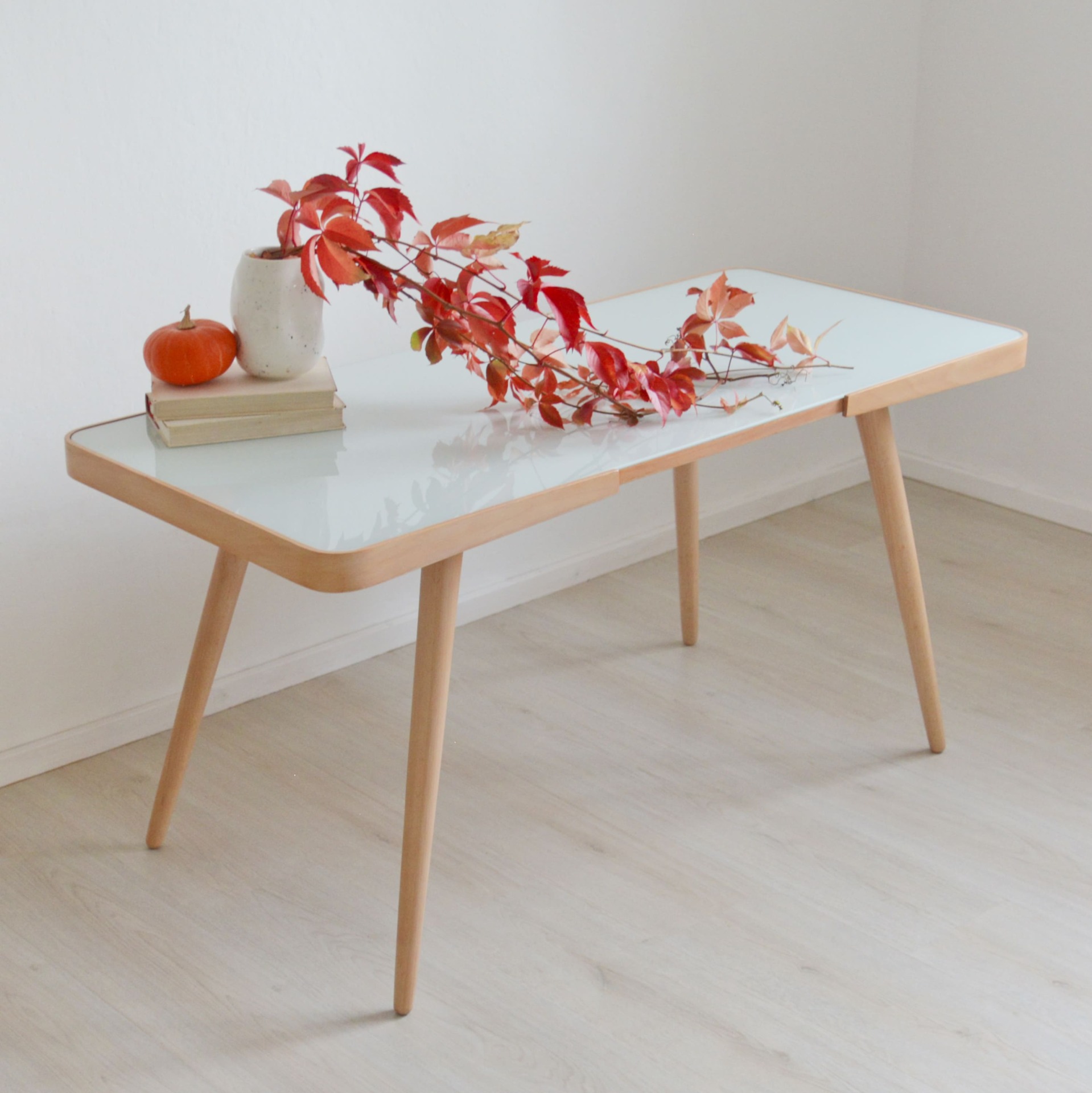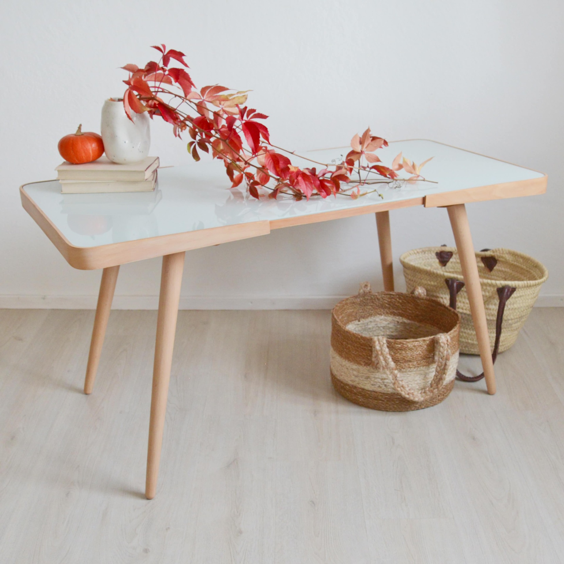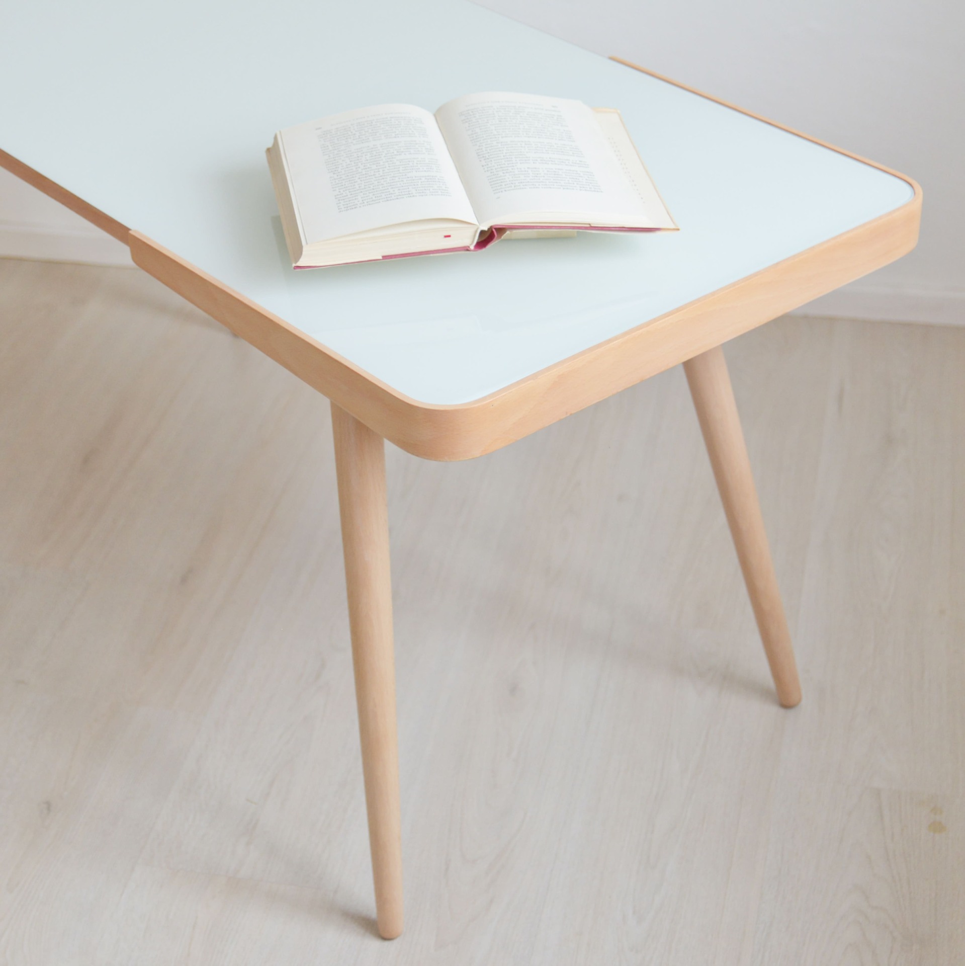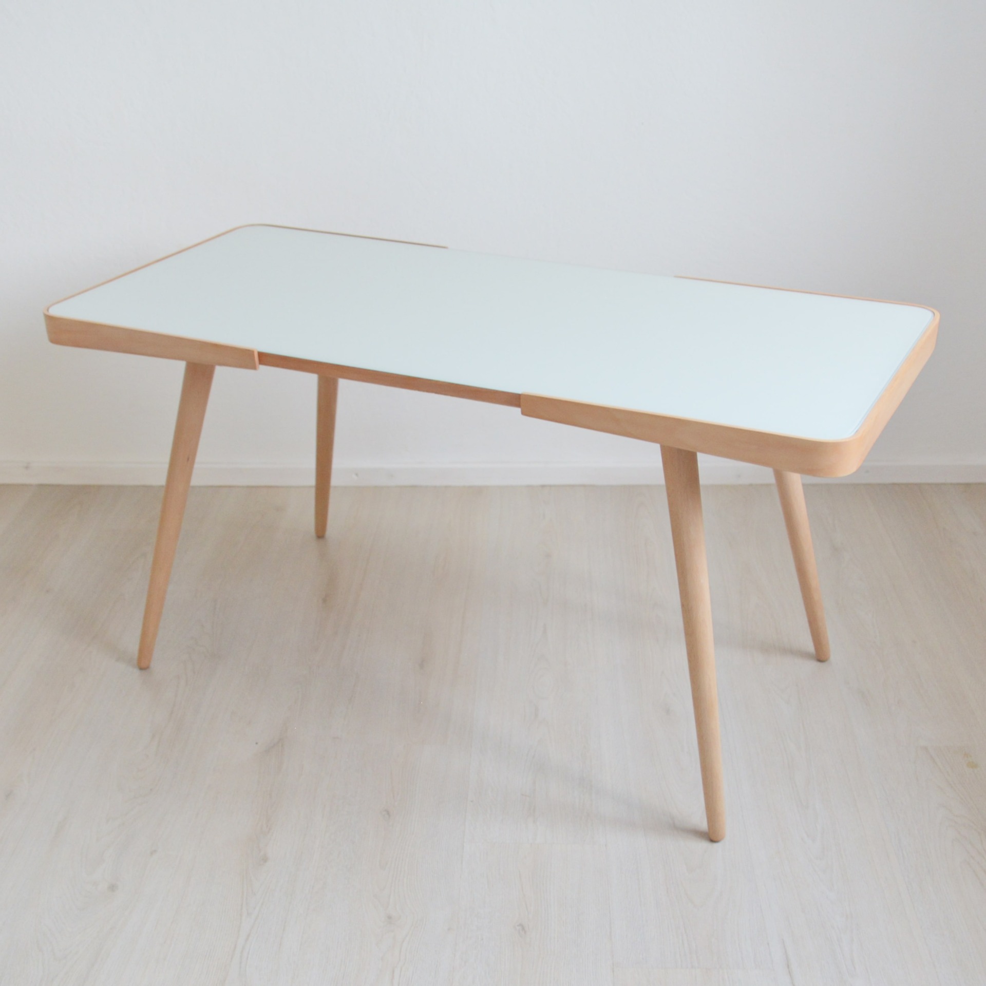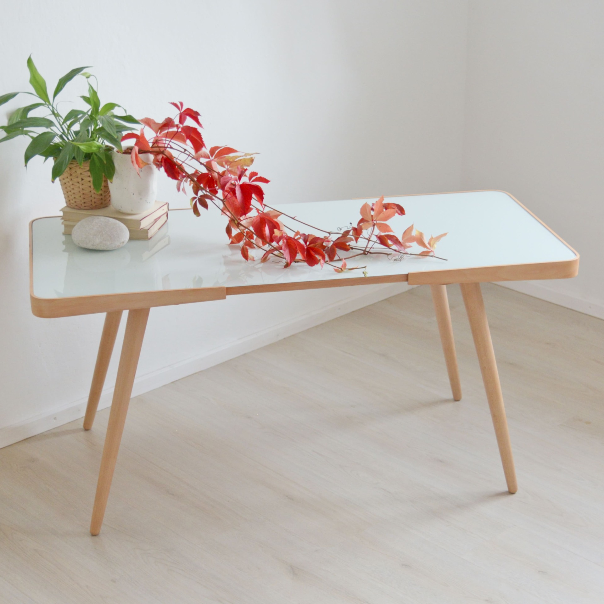Výjimečný typ většího retro stolku s novou skleněnou deskou, který se ihned stane spučástí vašeho domova. Krásné masivní bukové dřevo v kombinaci s ohýbanou bukovou překližkou. Vše je po naší kompletní obnově a renovaci. Výroba roku 1962 v podniku Český nábytek - Týniště nad Orlicí.
