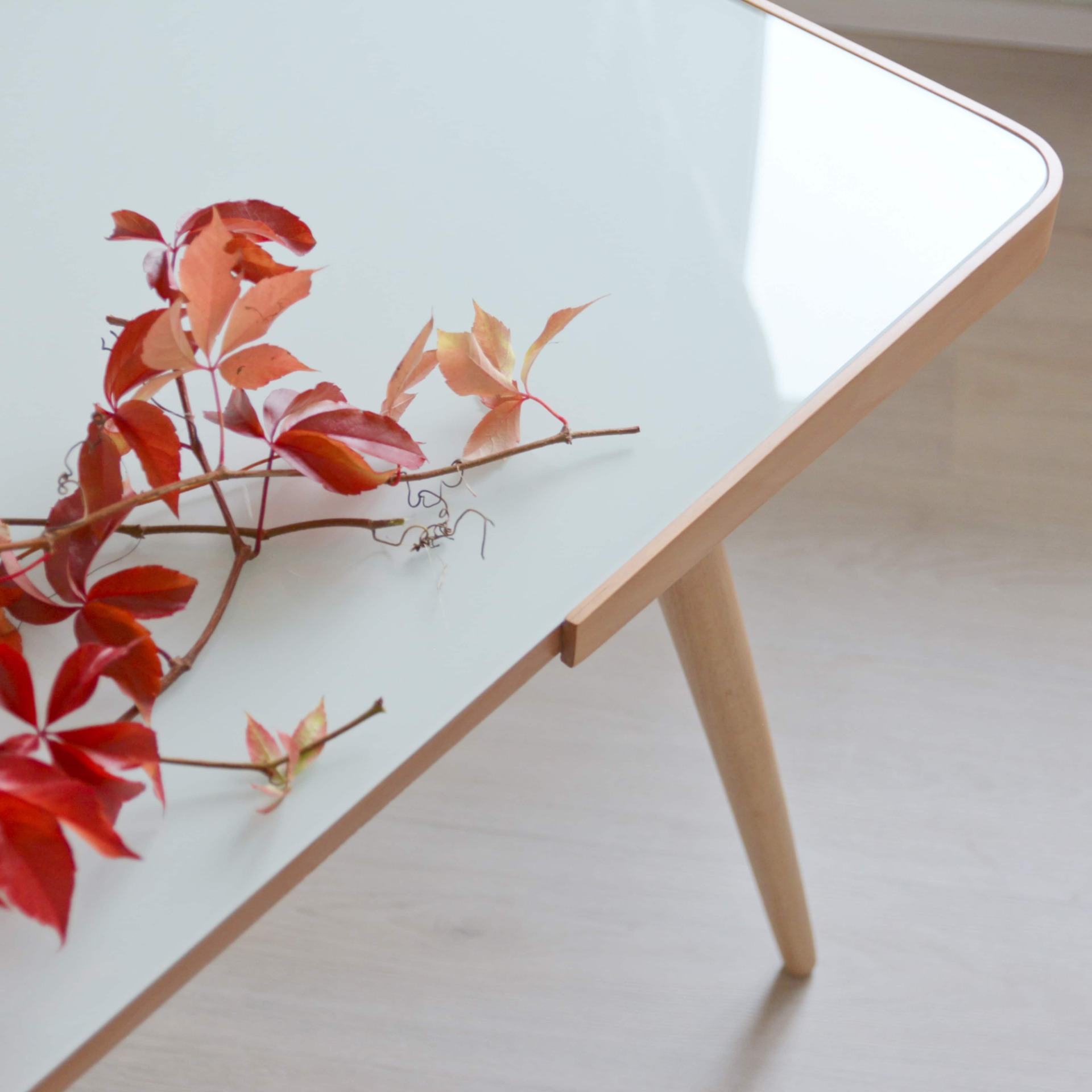 Stolek jsme museli pro renovaci celý rozebrat, staré nátěry a laky pečlivě obrousit a následně vše znovu slepit a zpevnit. Nová povrchová úprava je v zesvětlujícím tvrdém oleji, který potlačuje teplé tóny dřeva.