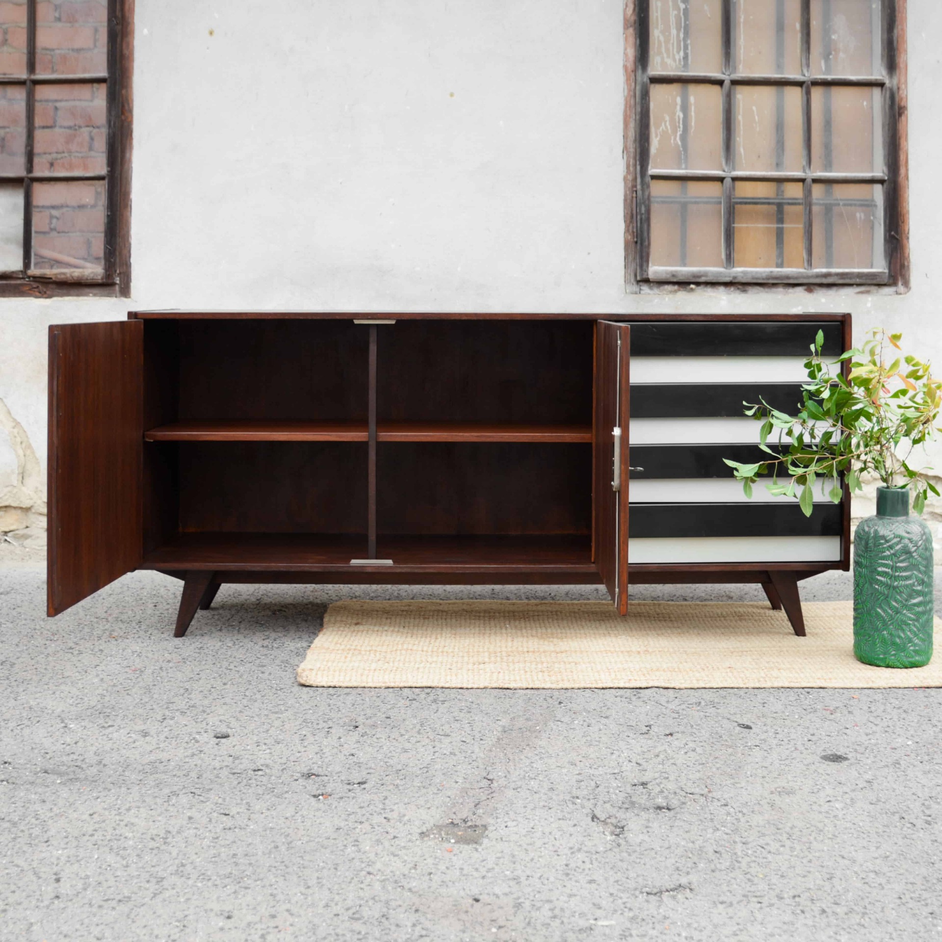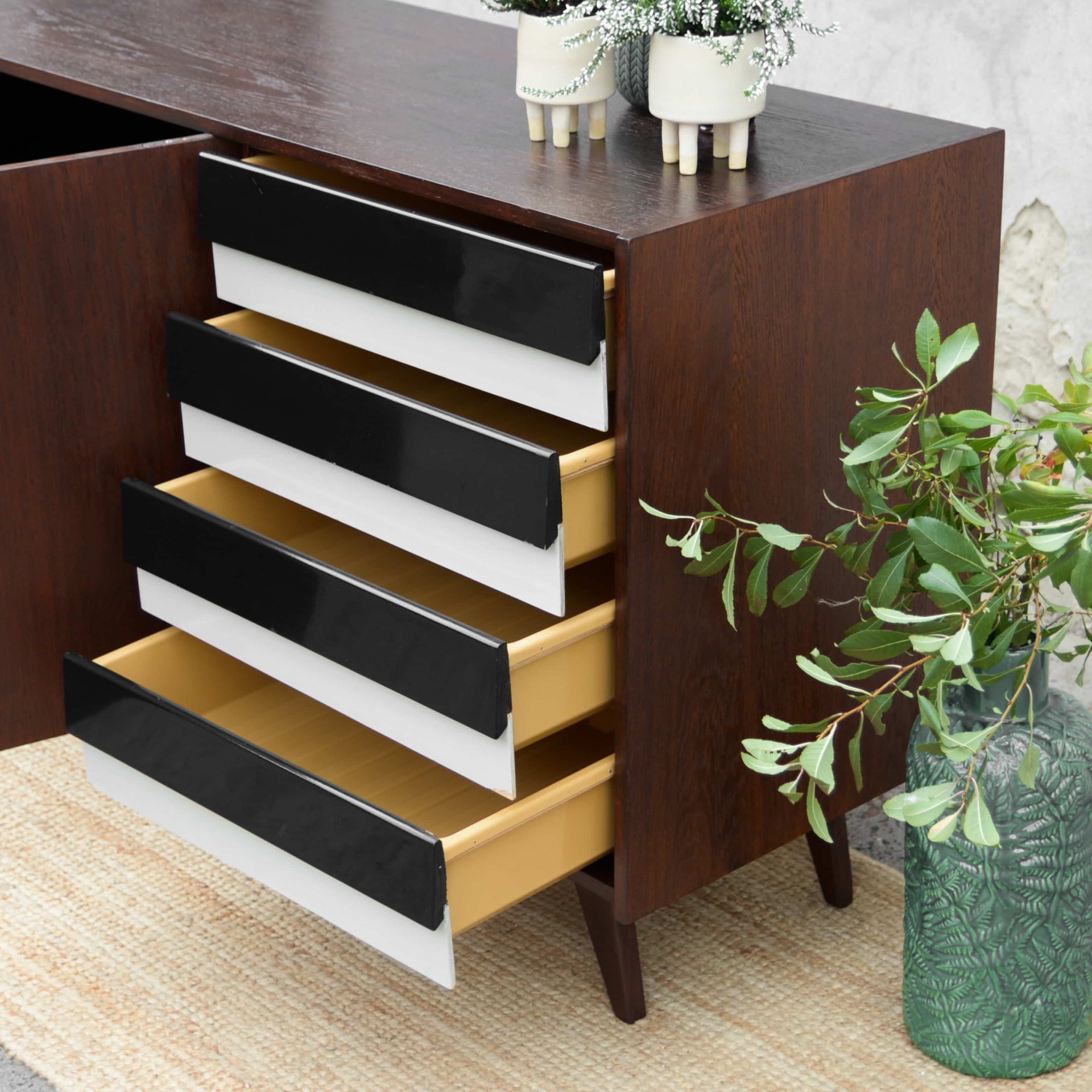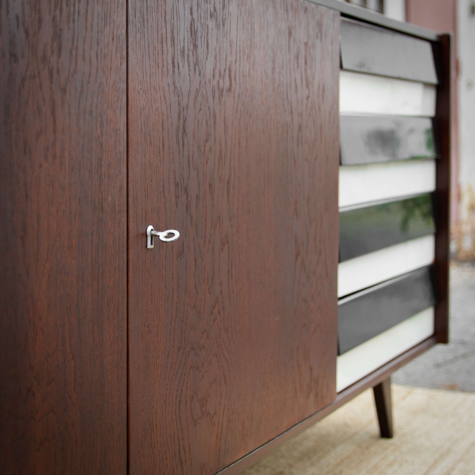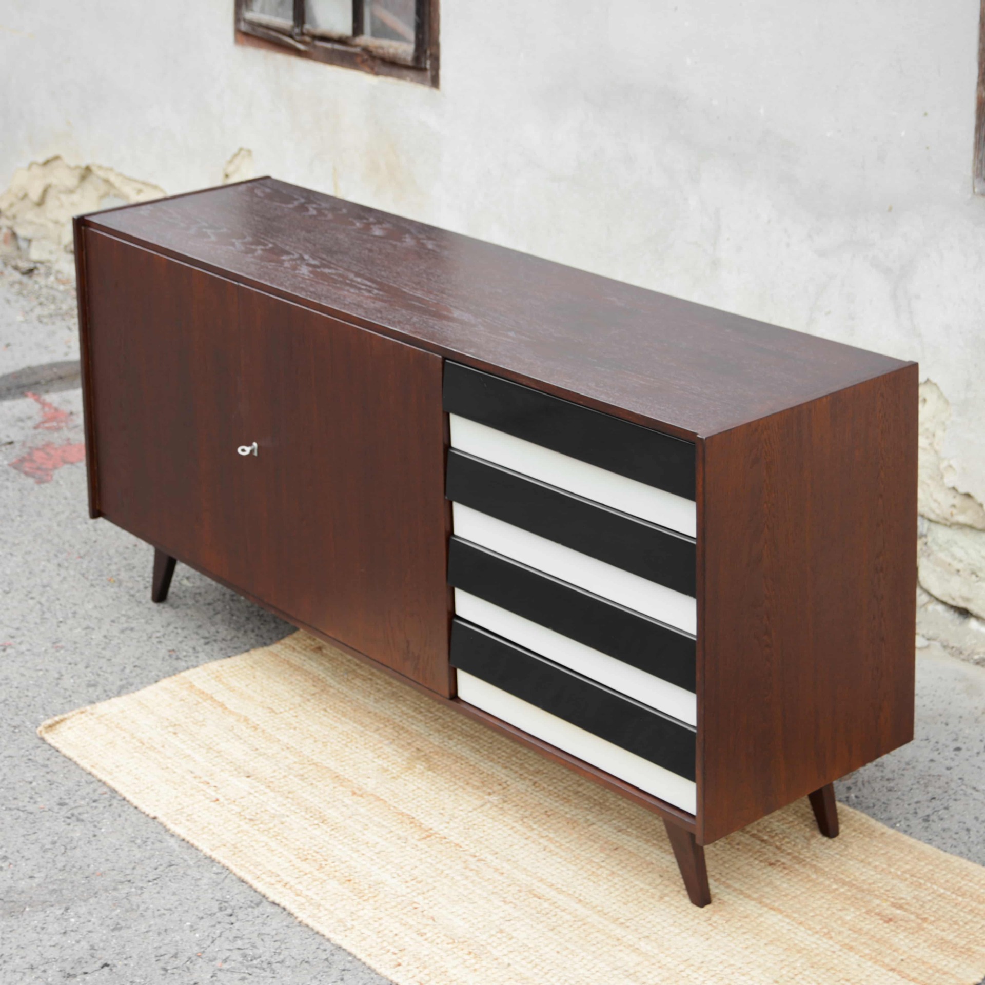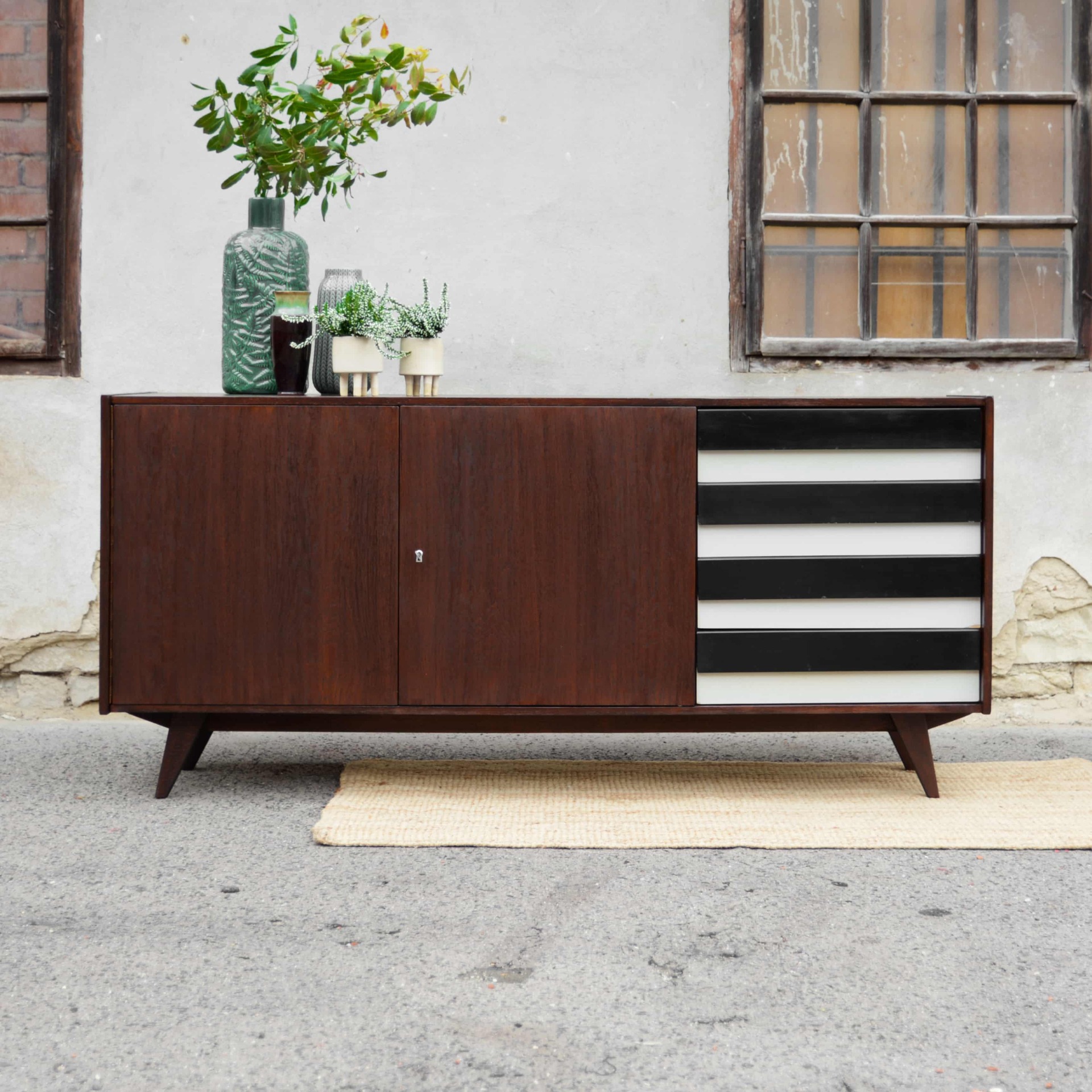 Zájem o dnes již ikonickou skříňku U-460 neklesá, právě naopak, je oblíbená i dnes. Především pro svůj minimalistický a nadčasový design, který je zároveň funkční. Vejde se do ní opravdu hodně a na drobnější věci jsou tu hned čtyři šuplíky. Za jejím tvarem z roku 1958 stojí návrhář J.Jiroutek. Tento konkrétní kus je z roku 1967.