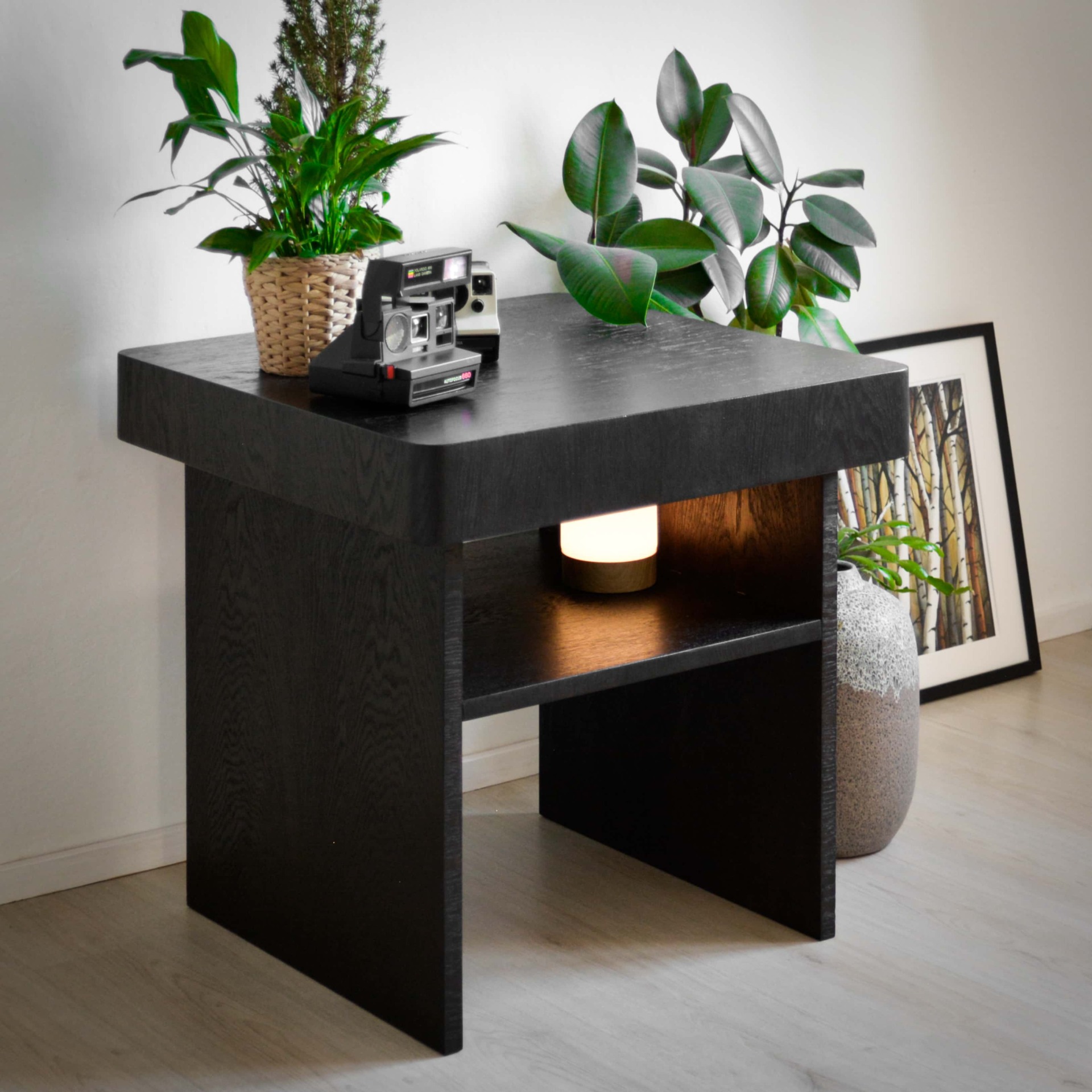 Stolek jsme museli celý rozložit, opatrně obrousili všechny dýhované povrchy a vyspravili škrábance a oťuky. Rozhodli jsme se pro odvážnou povrchovou úpravu, a to černé moření. Kresba dřeva je krásně viditelná. Dále jsou povrchy opatřeny několika vrstvami tvrdého oleje na nábytek, snadno se udržuje a čistí.