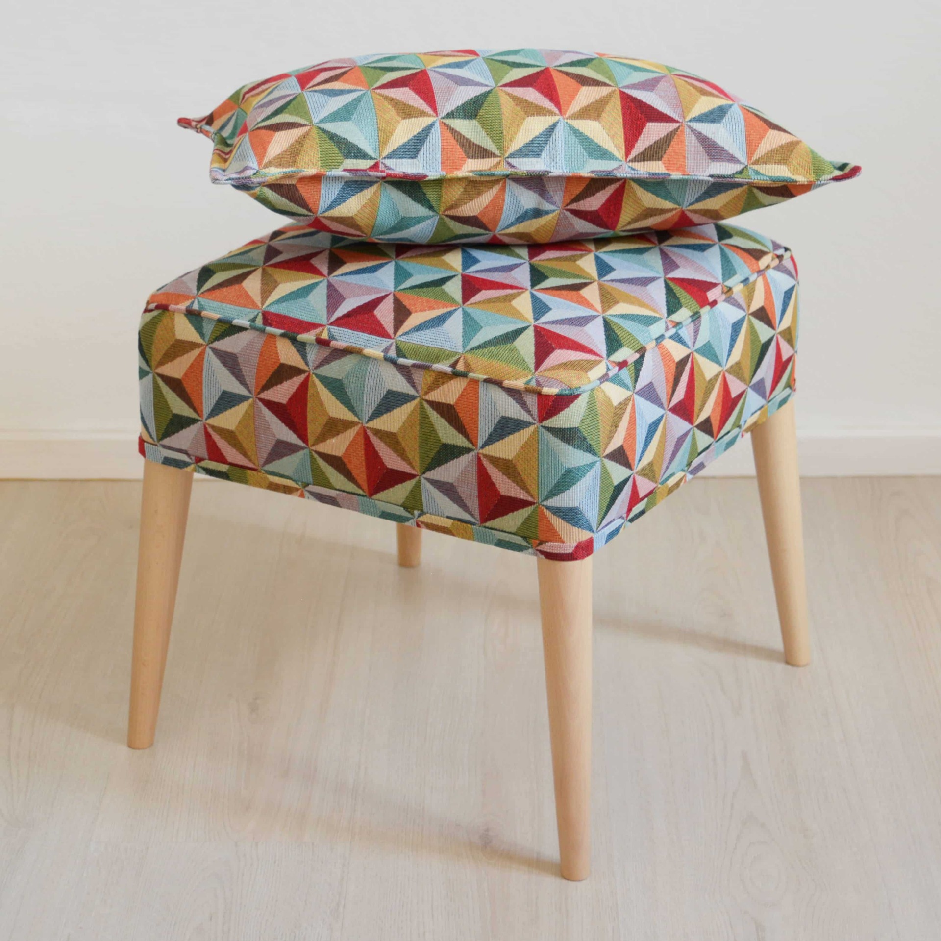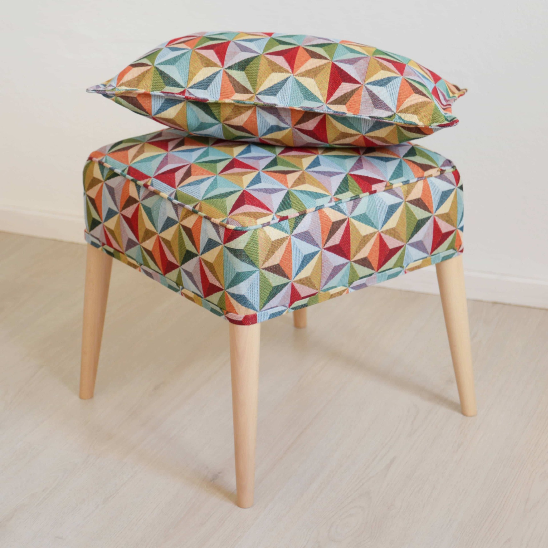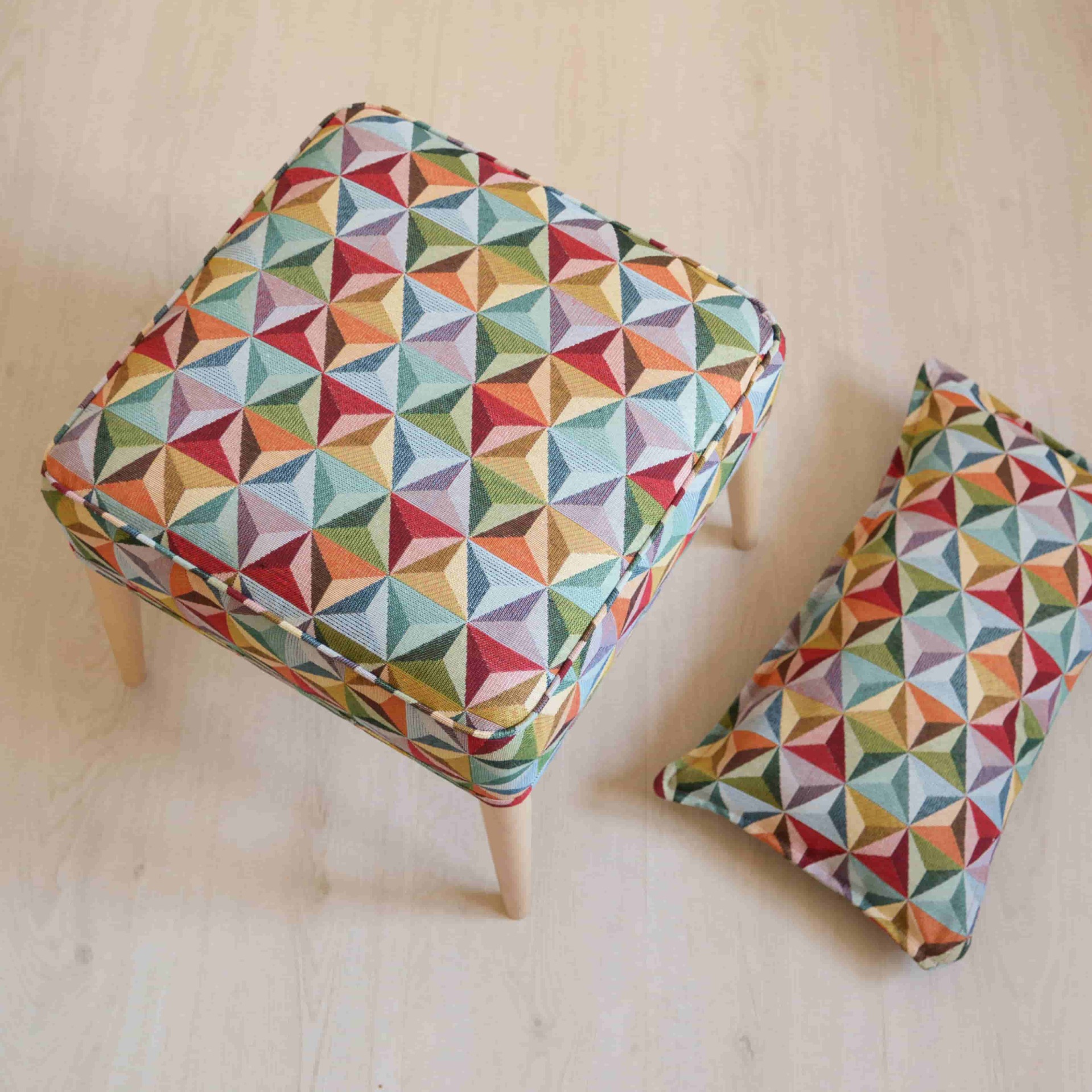 Oblíbený čtvercový tvar našeho taburetu, který jsme čalounili do nevšední látky s výrazným geometrickým vzorem Kaleidoskop.
