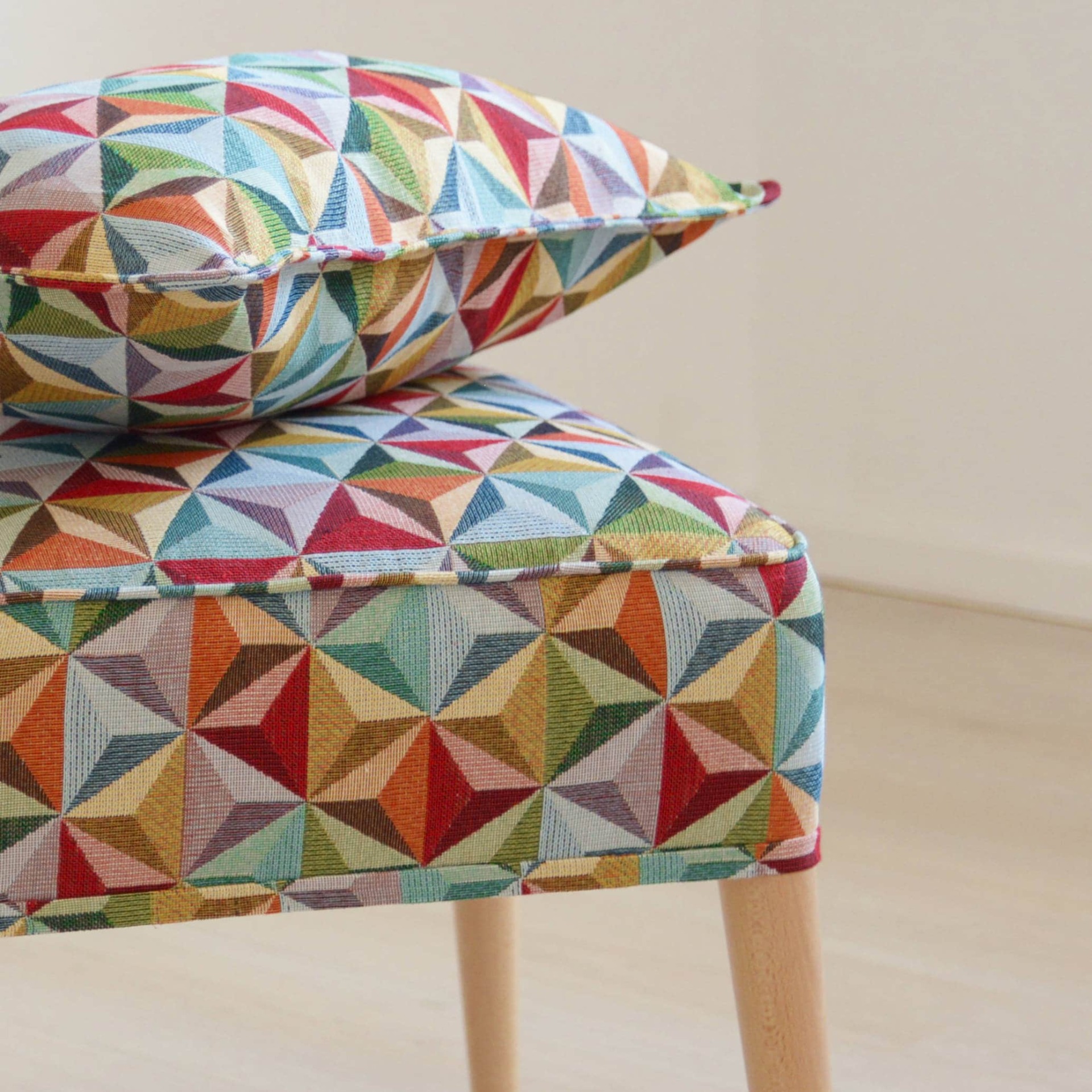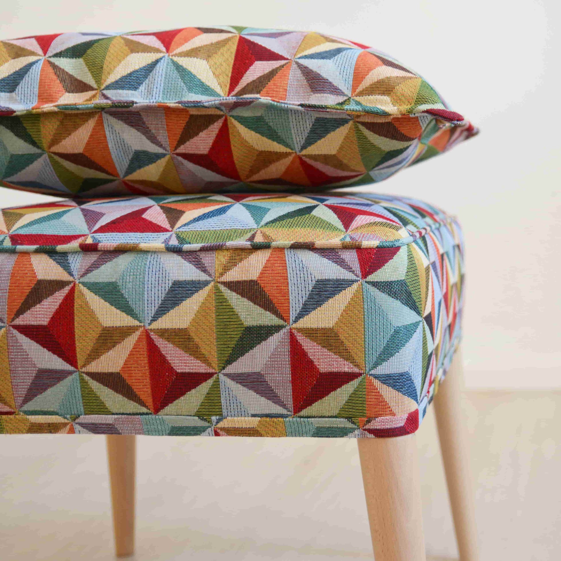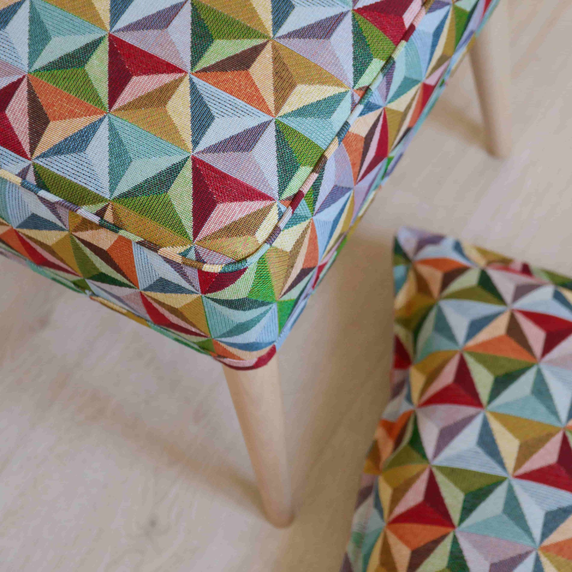 Oblíbený čtvercový tvar našeho taburetu, který jsme čalounili do nevšední látky s výrazným geometrickým vzorem Kaleidoskop.