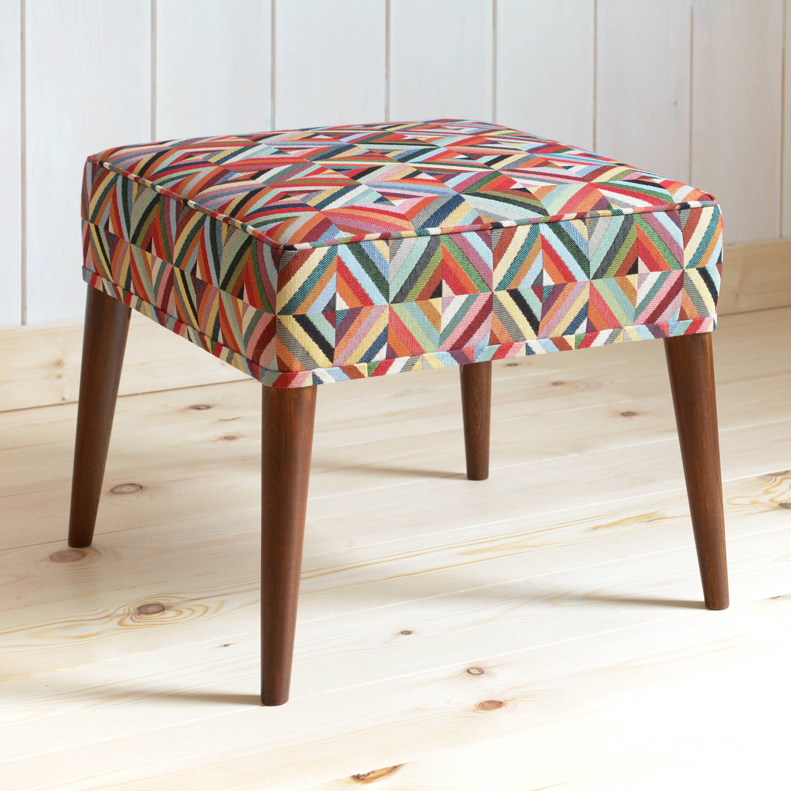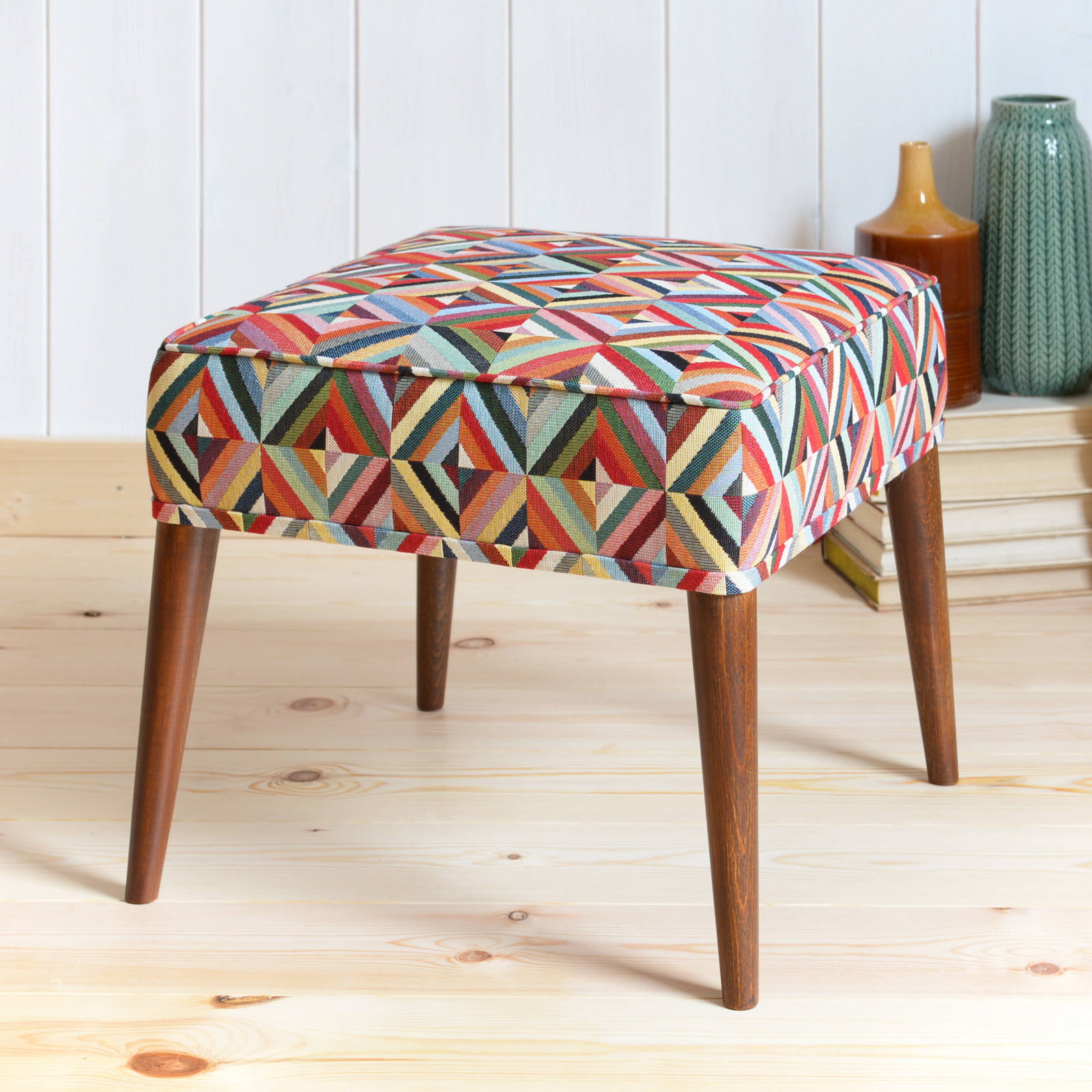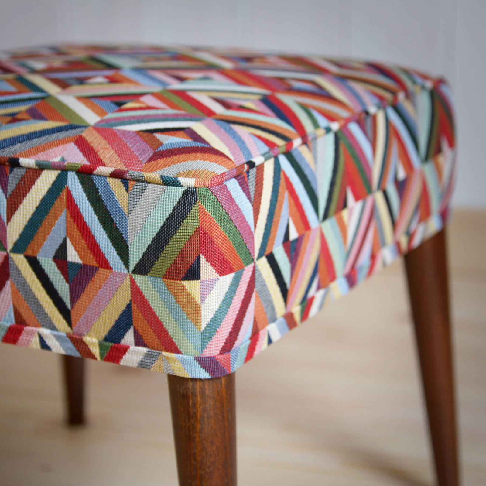 Oblíbený čtvercový tvar našeho taburetu, který jsme čalounili do barevné gobelínové látky s výrazným geometrickým vzorem.