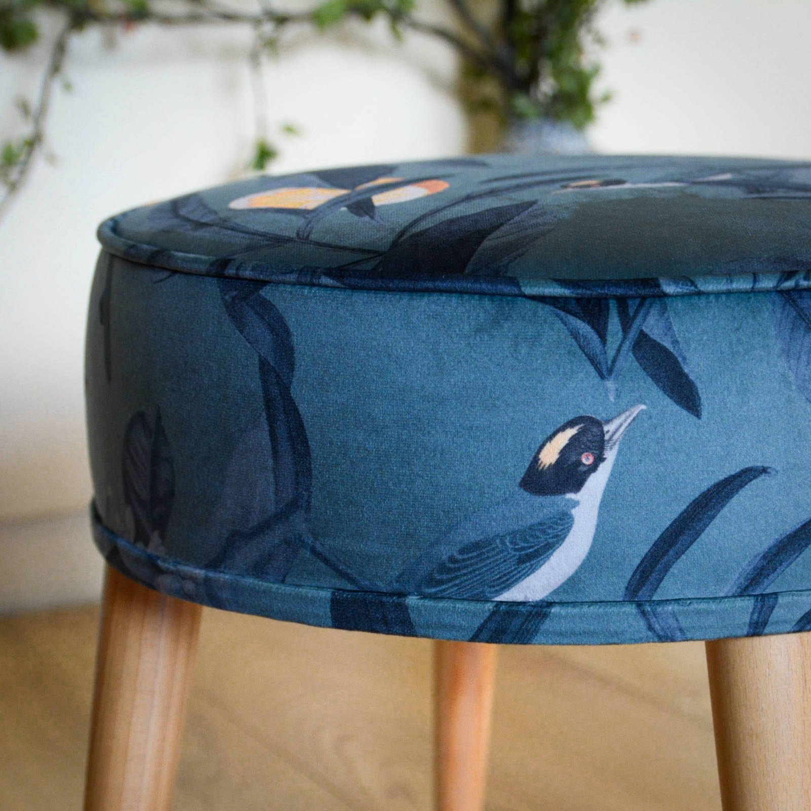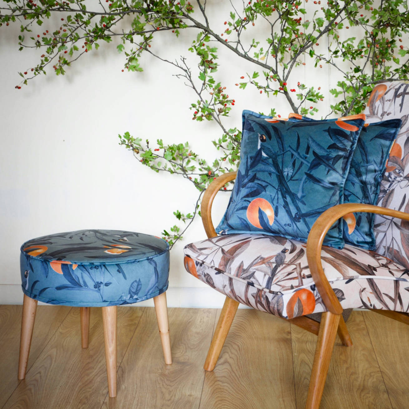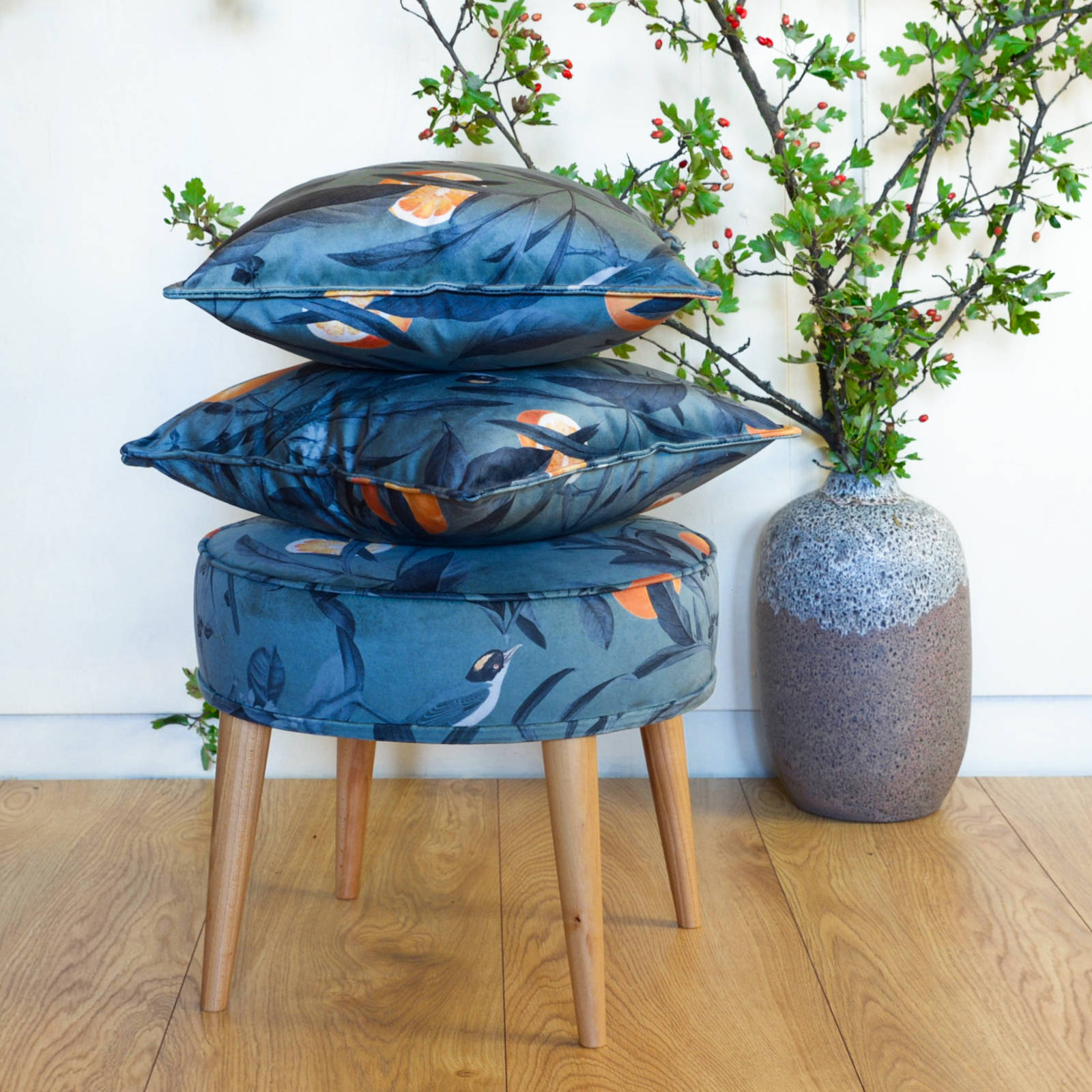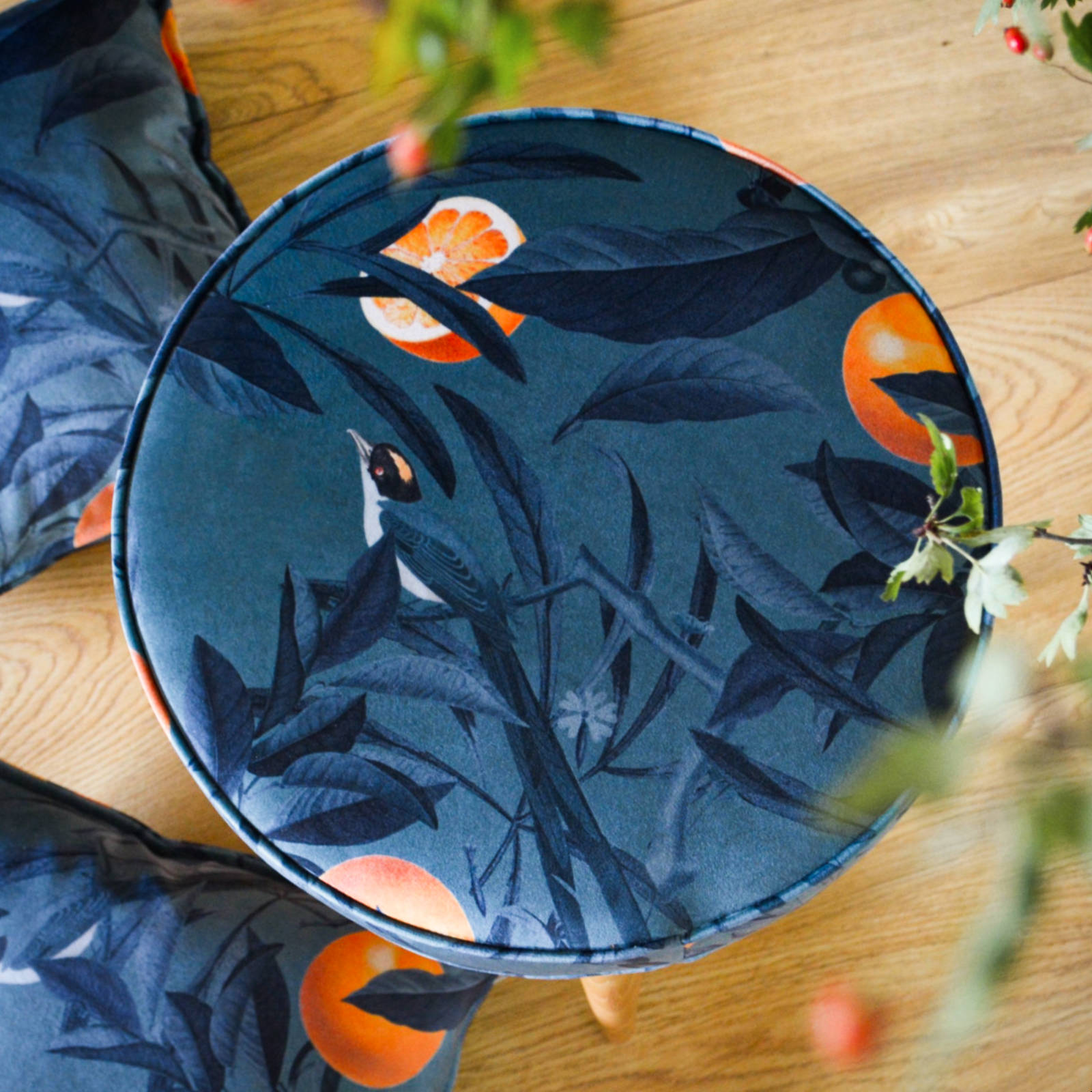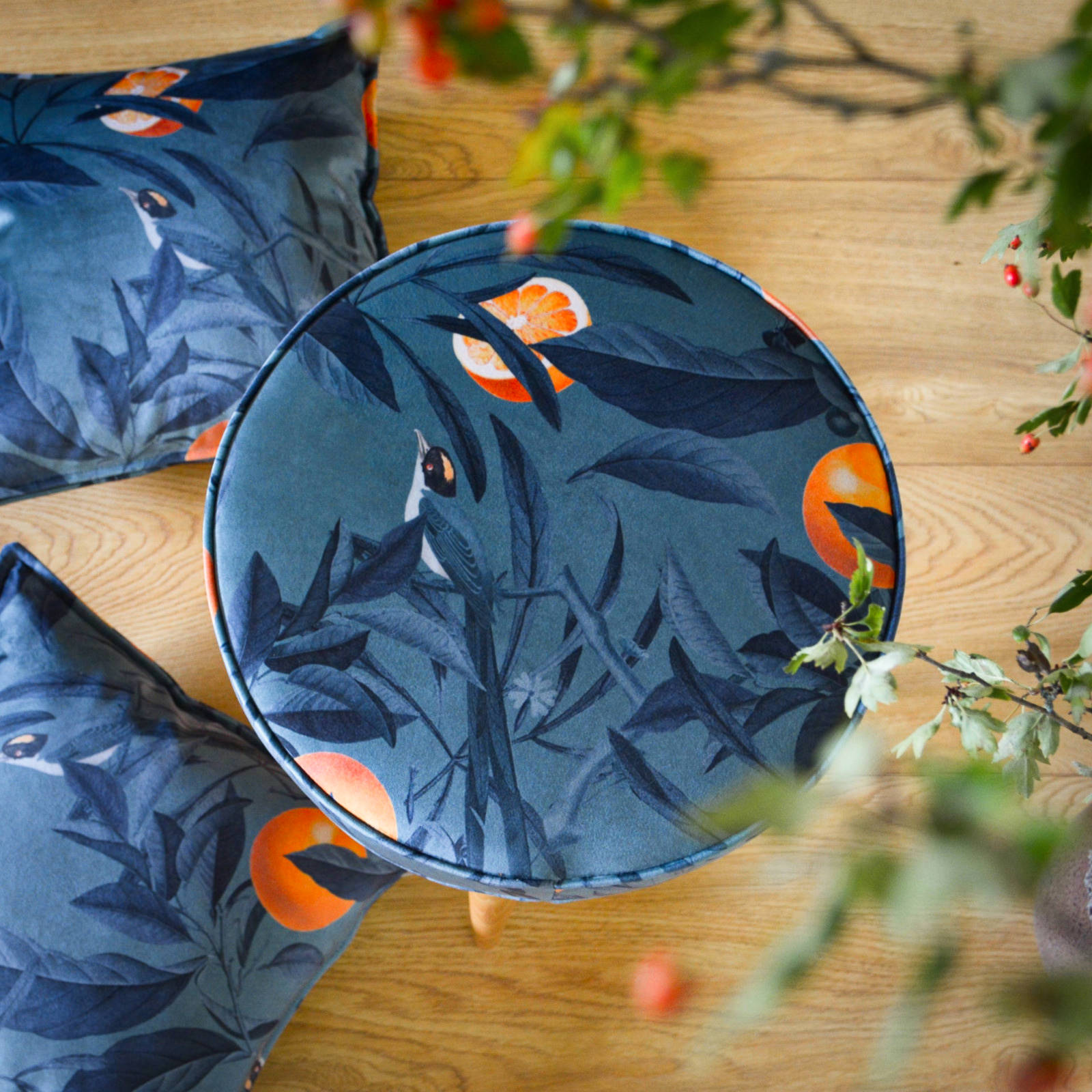 Výrazný taburet v podmanivém detailním vzoru pomerančů, který doplňují ptáci, drobné lístky, květy a větvičky. Látka má odolný sametový povrch určený na čalounění. Bohémský botanický vzor je na tmavě modrém podkladu.